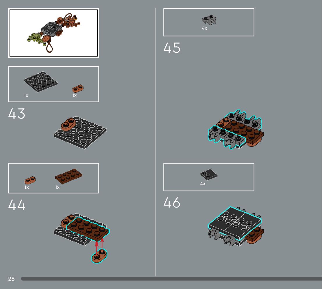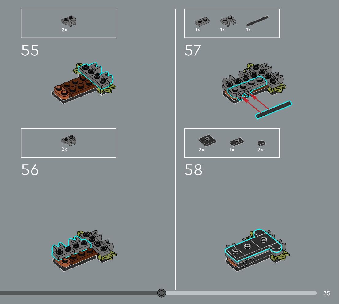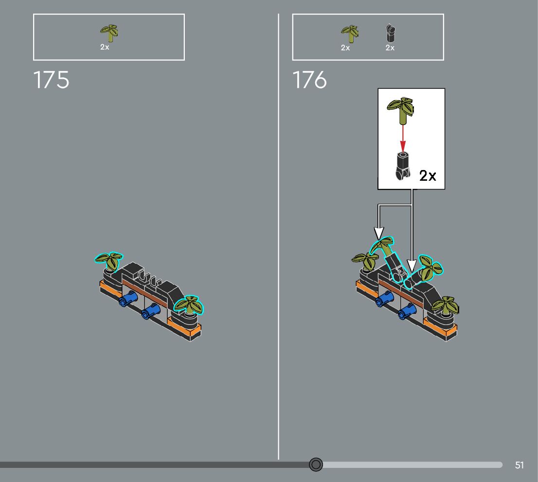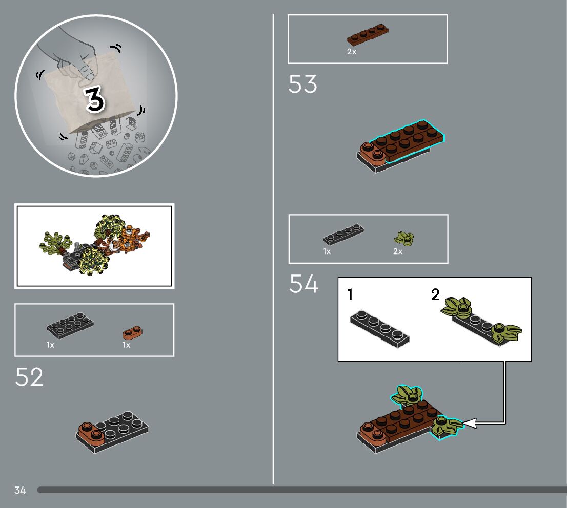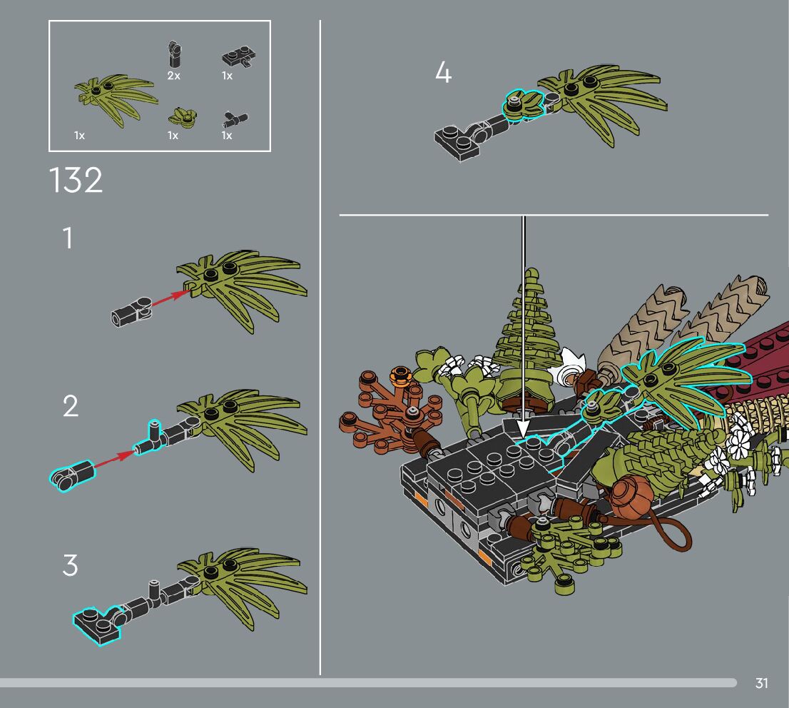 The assembly guide is prepared in a very understandable way for children and adult LEGO enthusiasts. A total of 115 picture galleries are shown, explaining the step-by-step construction stages for 2 different structures.