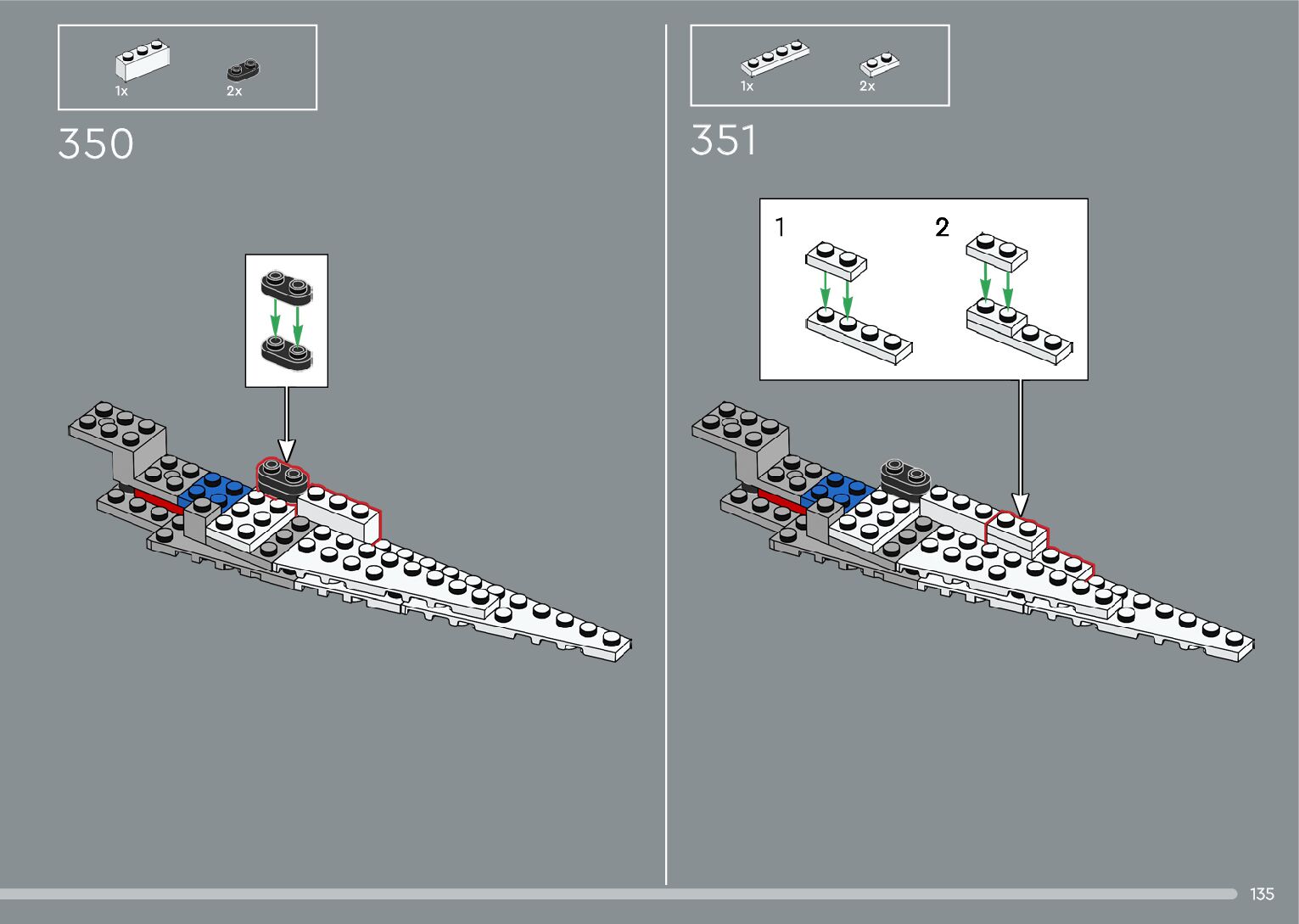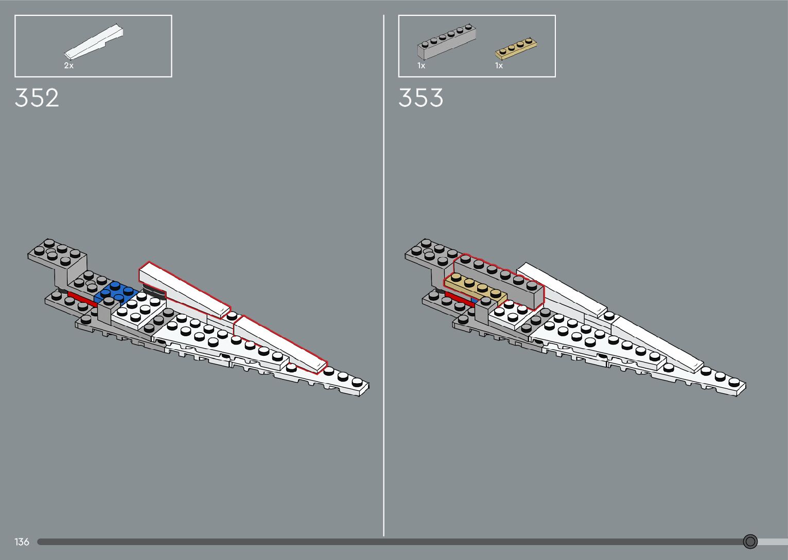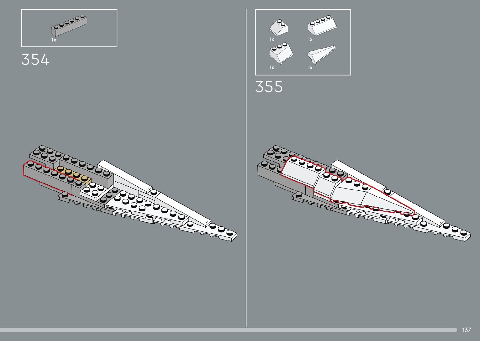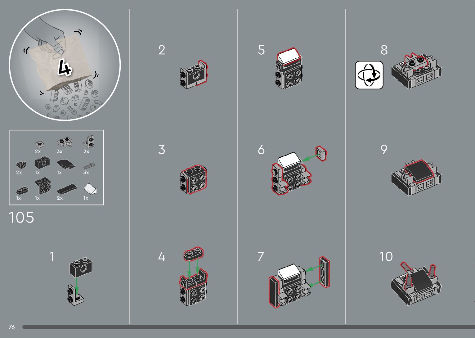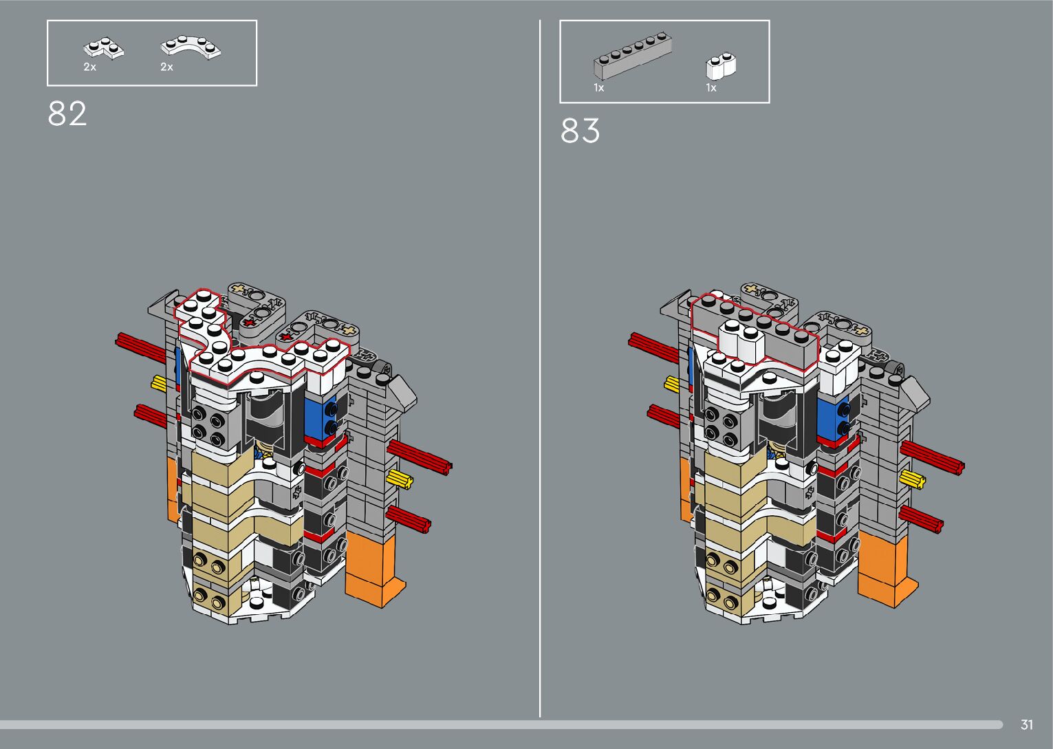 The assembly guide is prepared in a very understandable way for children and adult LEGO enthusiasts. A total of 376 picture galleries are shown, explaining the step-by-step construction stages for 2 different structures.