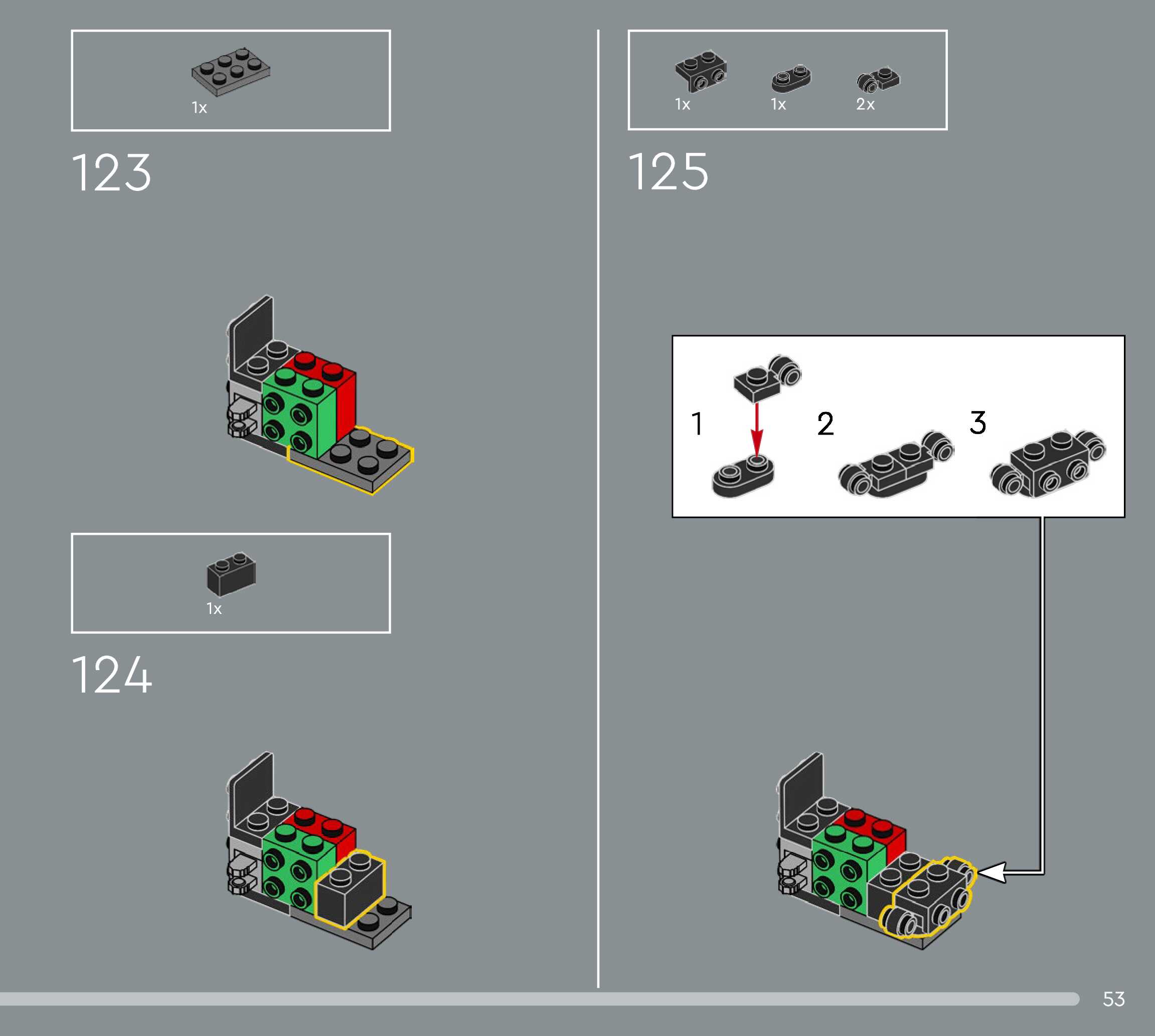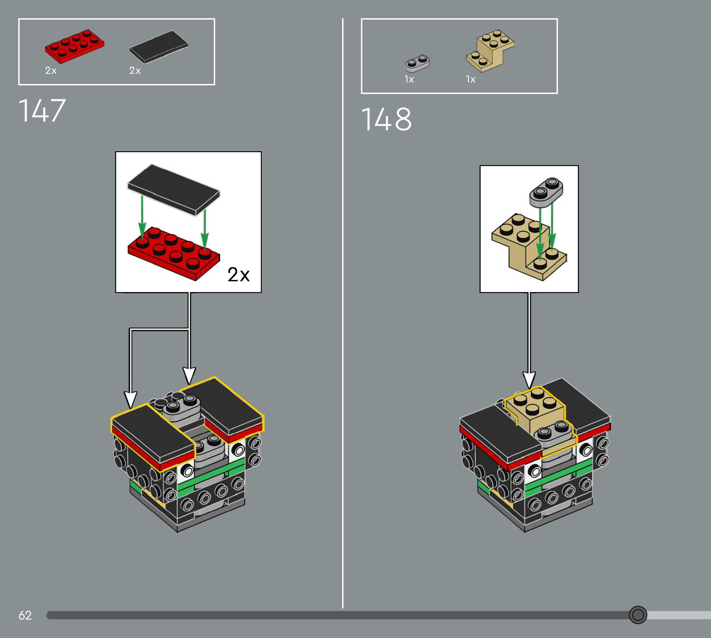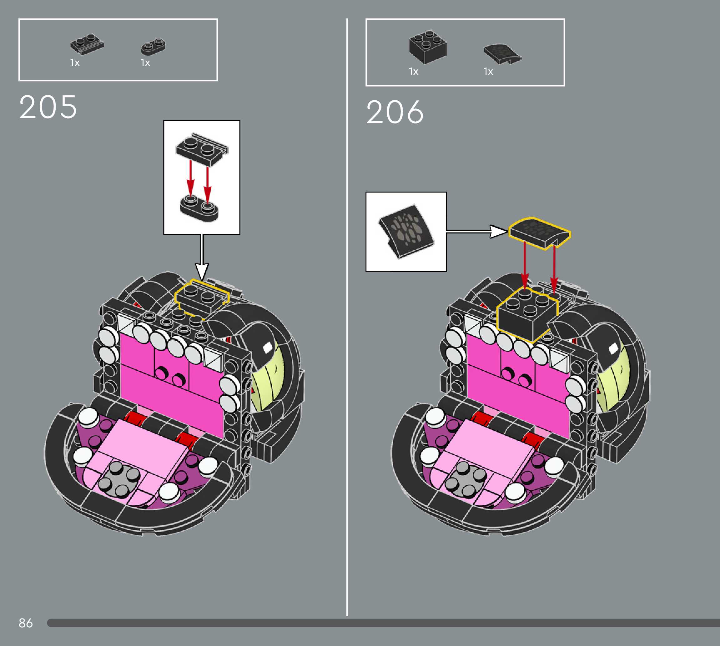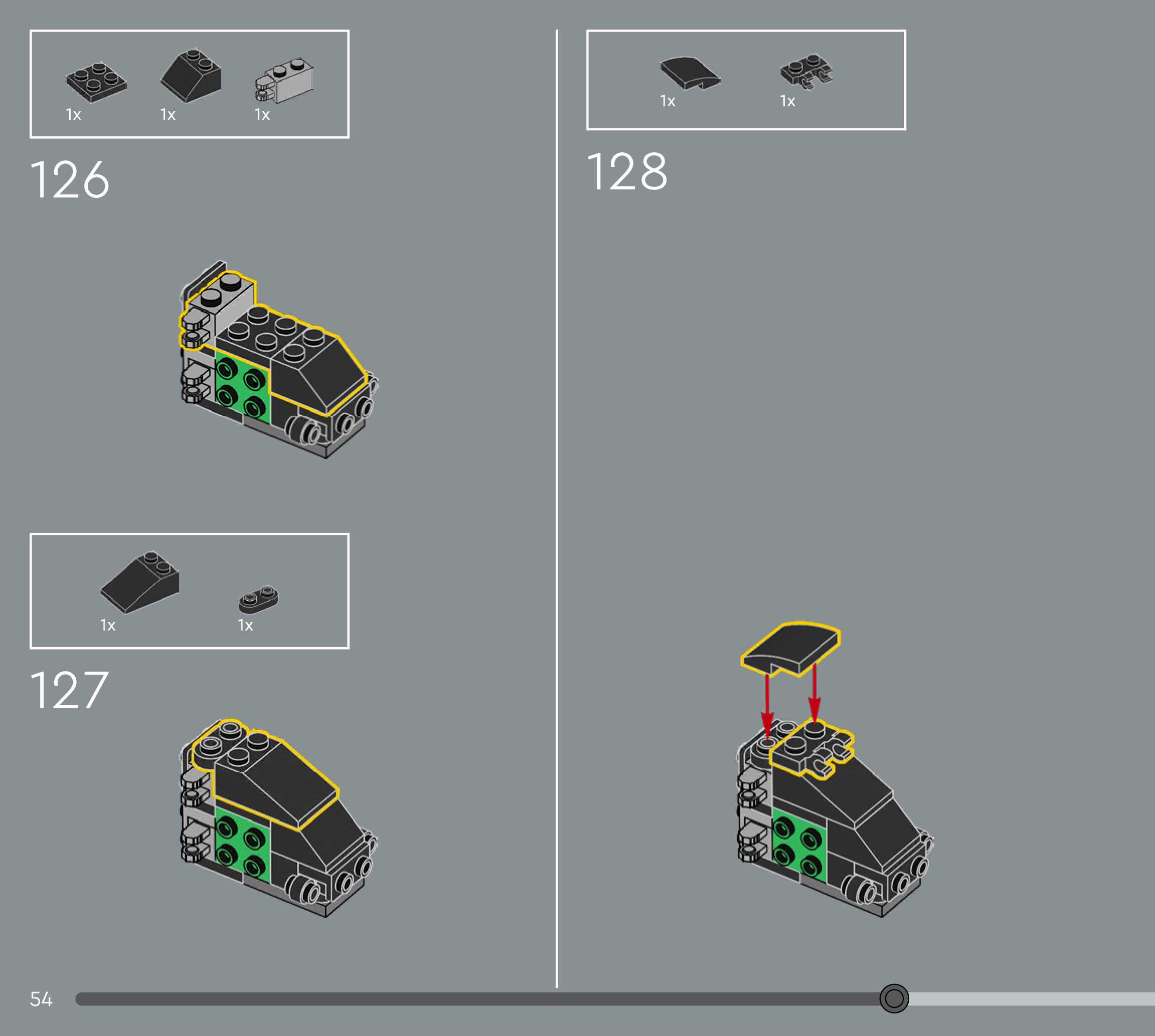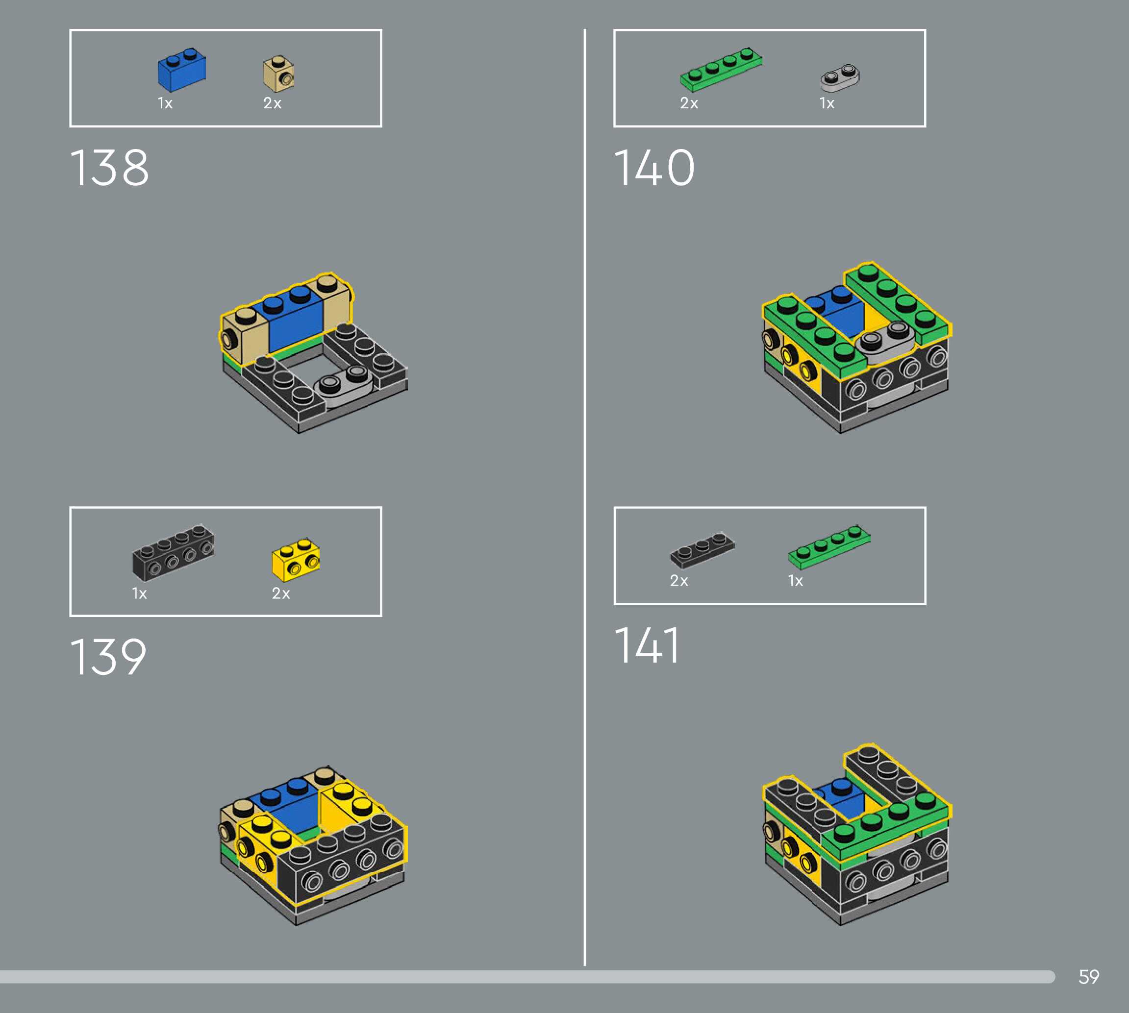 The assembly guide is prepared in a very understandable way for children and adult LEGO enthusiasts. A total of 128 picture galleries are shown, explaining the step-by-step construction stages for 1 different structures.