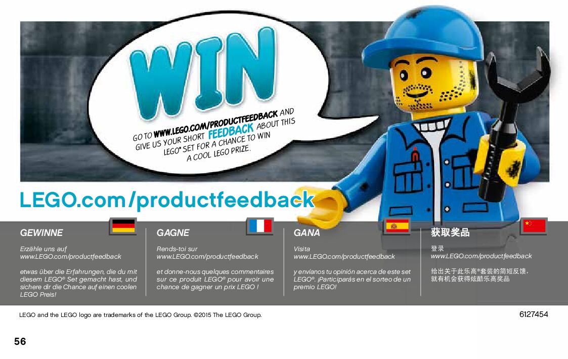 The assembly guide is prepared in a very understandable way for children and adult LEGO enthusiasts. A total of 56 picture galleries are shown, explaining the step-by-step construction stages for 1 different structures.