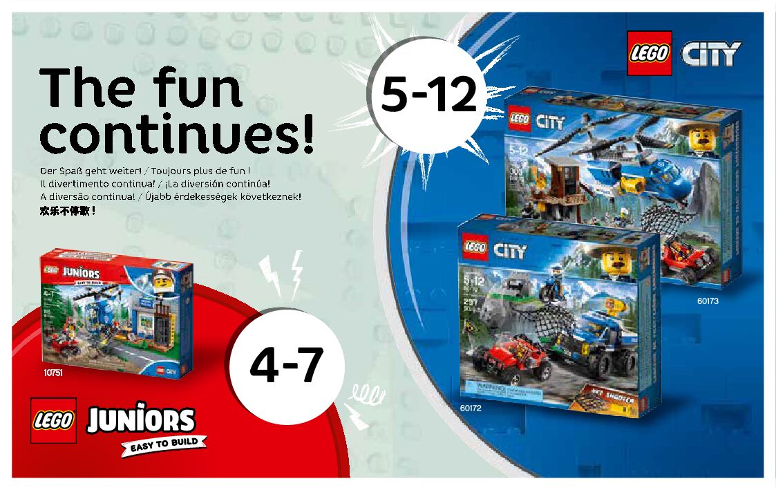 On this page you can find the original construction manual for the LEGO 10751 set. With the assembly manual you can easily learn how to build the 10751 Mountain Police Chase step by step. The set was released in 2017.
