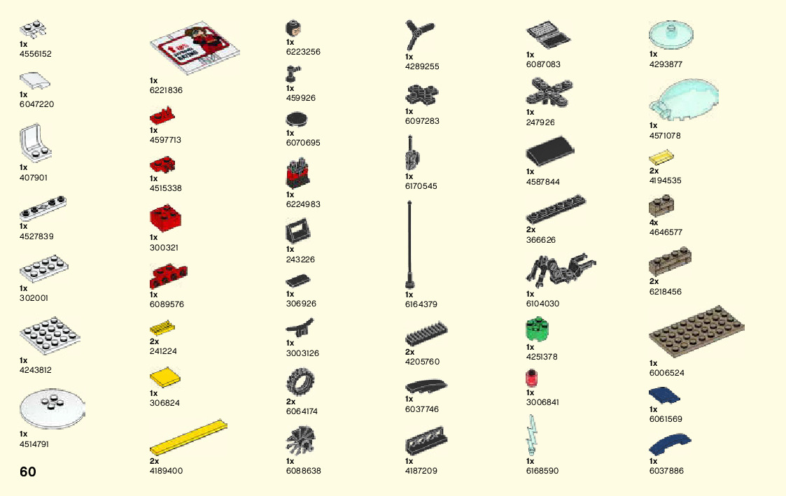 The assembly guide is prepared in a very understandable way for children and adult LEGO enthusiasts. A total of 64 picture galleries are shown, explaining the step-by-step construction stages for 1 different structures.