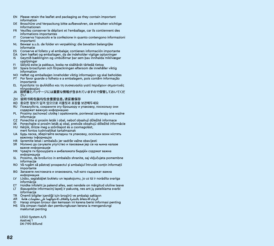 The assembly guide is prepared in a very understandable way for children and adult LEGO enthusiasts. A total of 88 picture galleries are shown, explaining the step-by-step construction stages for 1 different structures.