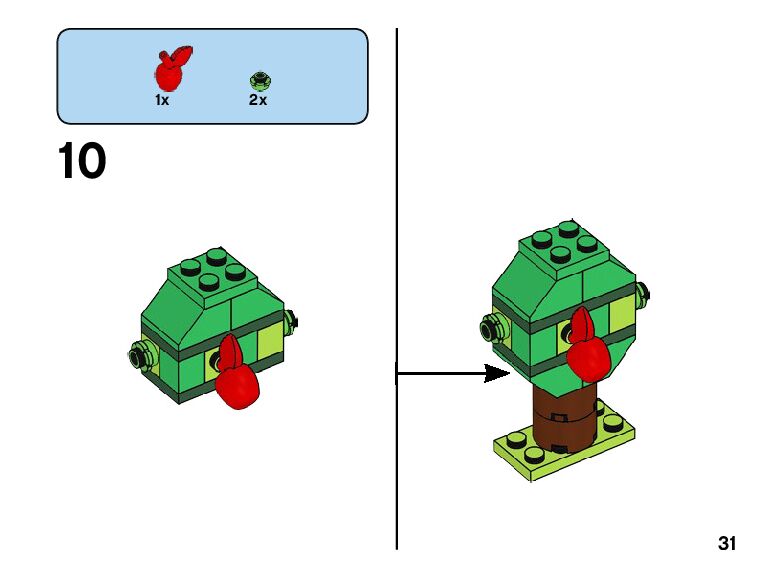 The assembly guide is prepared in a very understandable way for children and adult LEGO enthusiasts. A total of 36 picture galleries are shown, explaining the step-by-step construction stages for 1 different structures.