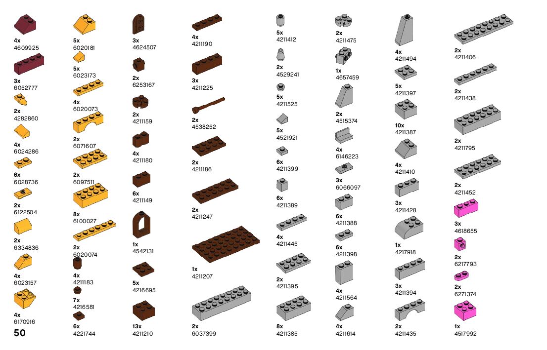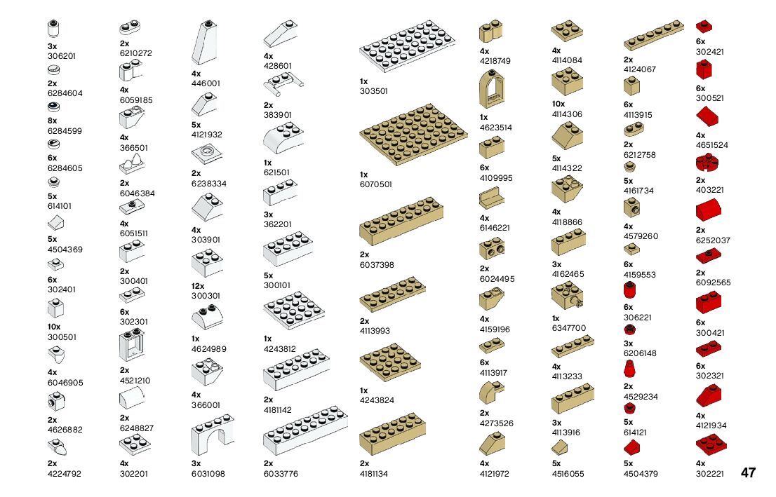 The assembly guide is prepared in a very understandable way for children and adult LEGO enthusiasts. A total of 52 picture galleries are shown, explaining the step-by-step construction stages for 1 different structures.