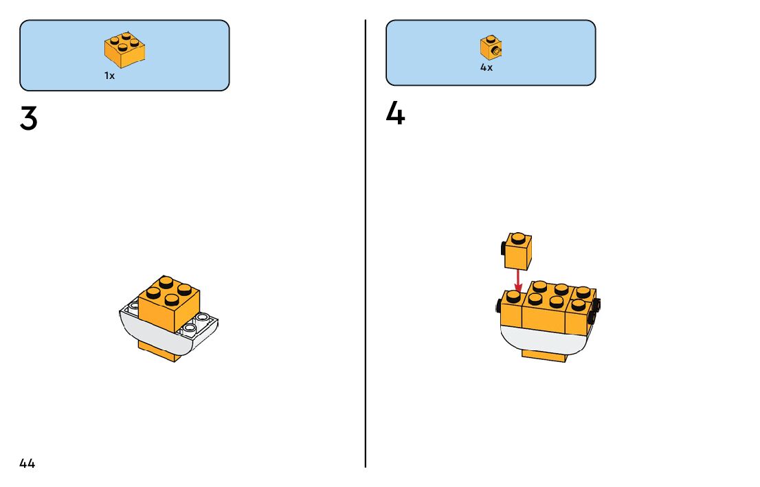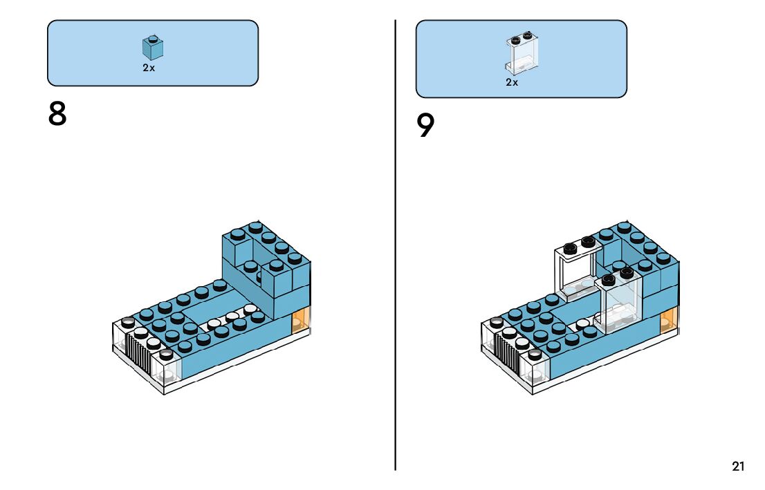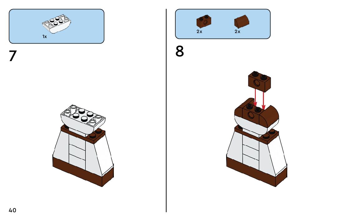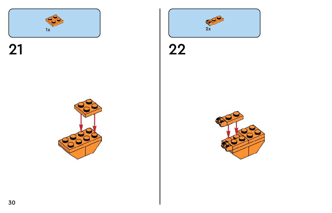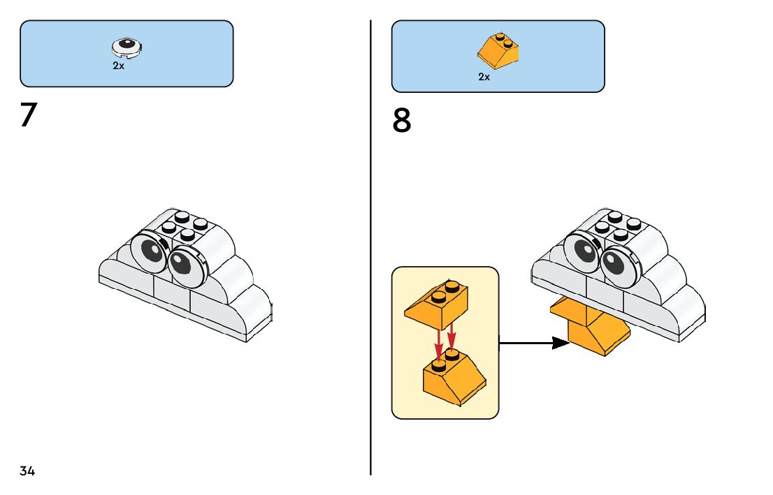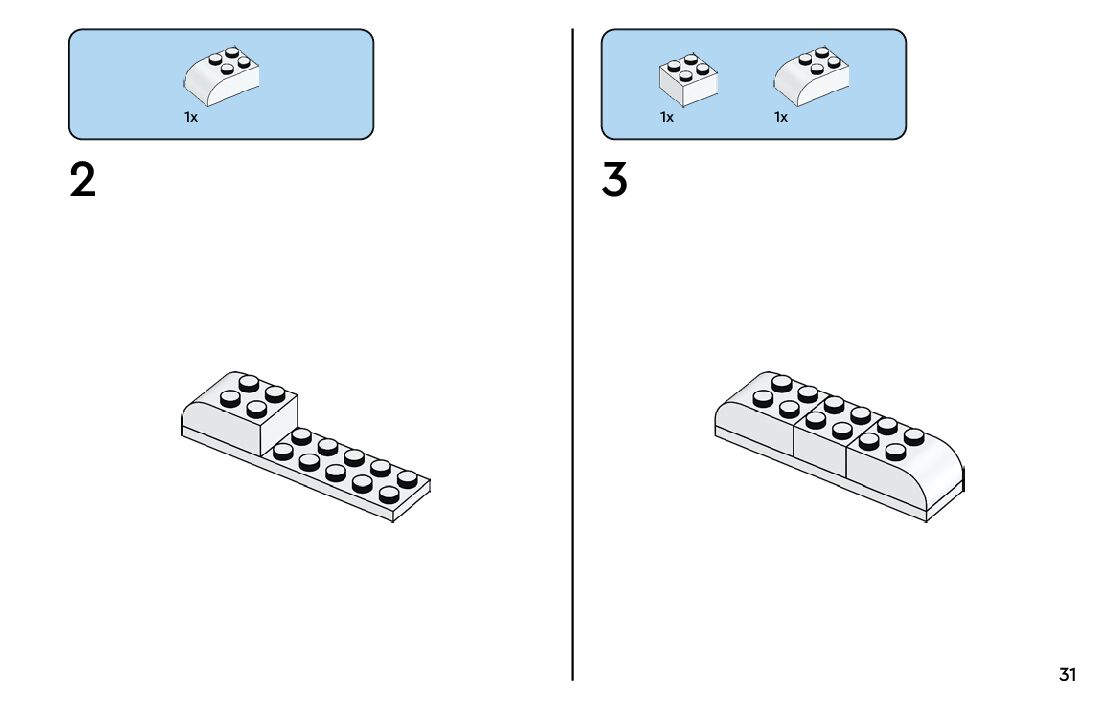 The assembly guide is prepared in a very understandable way for children and adult LEGO enthusiasts. A total of 100 picture galleries are shown, explaining the step-by-step construction stages for 2 different structures.