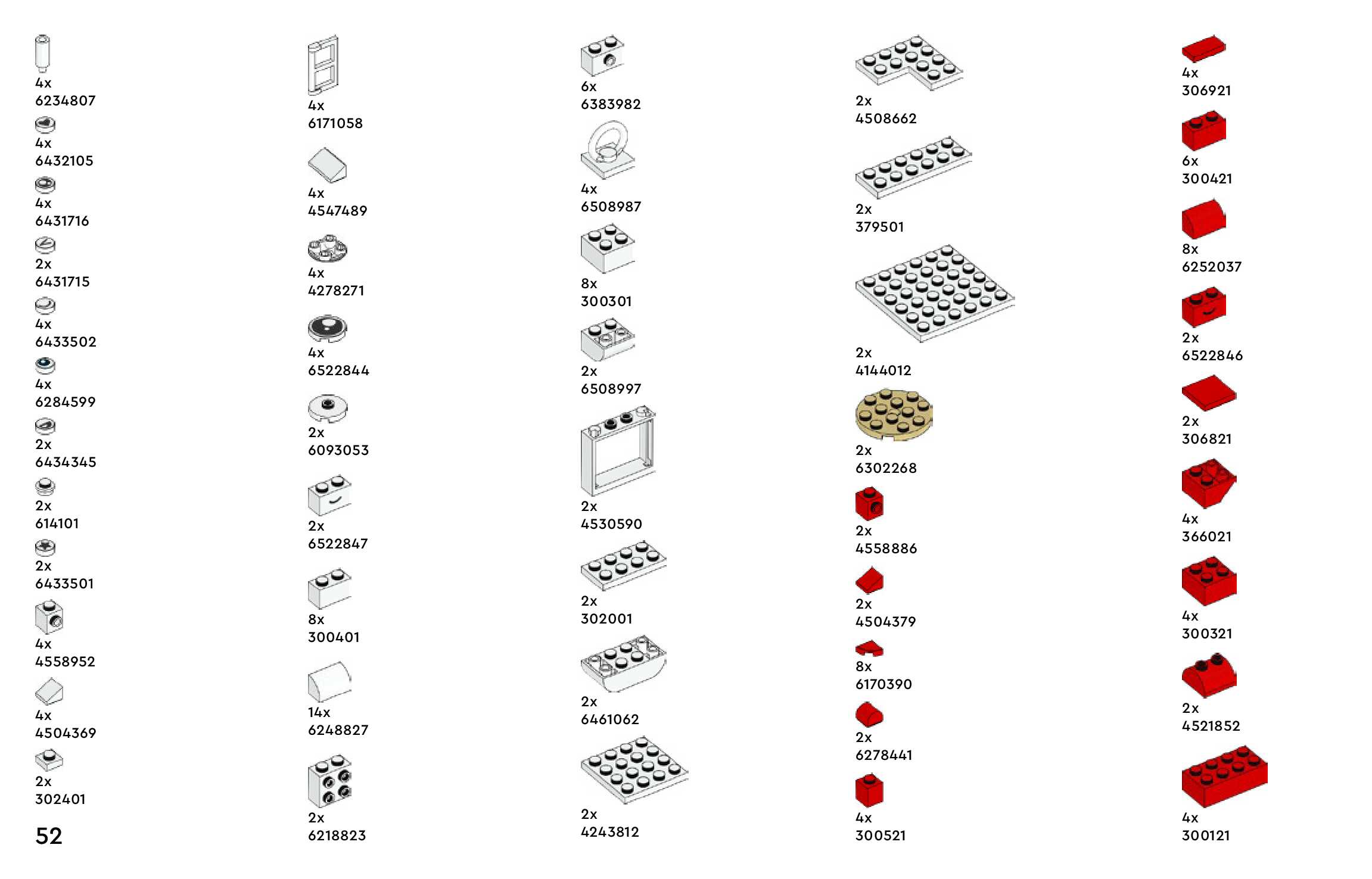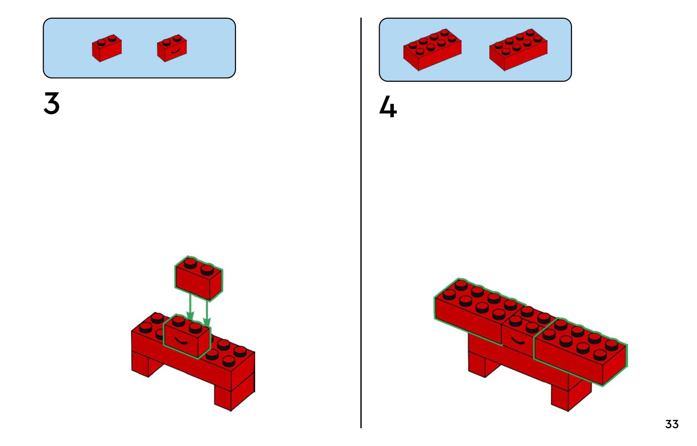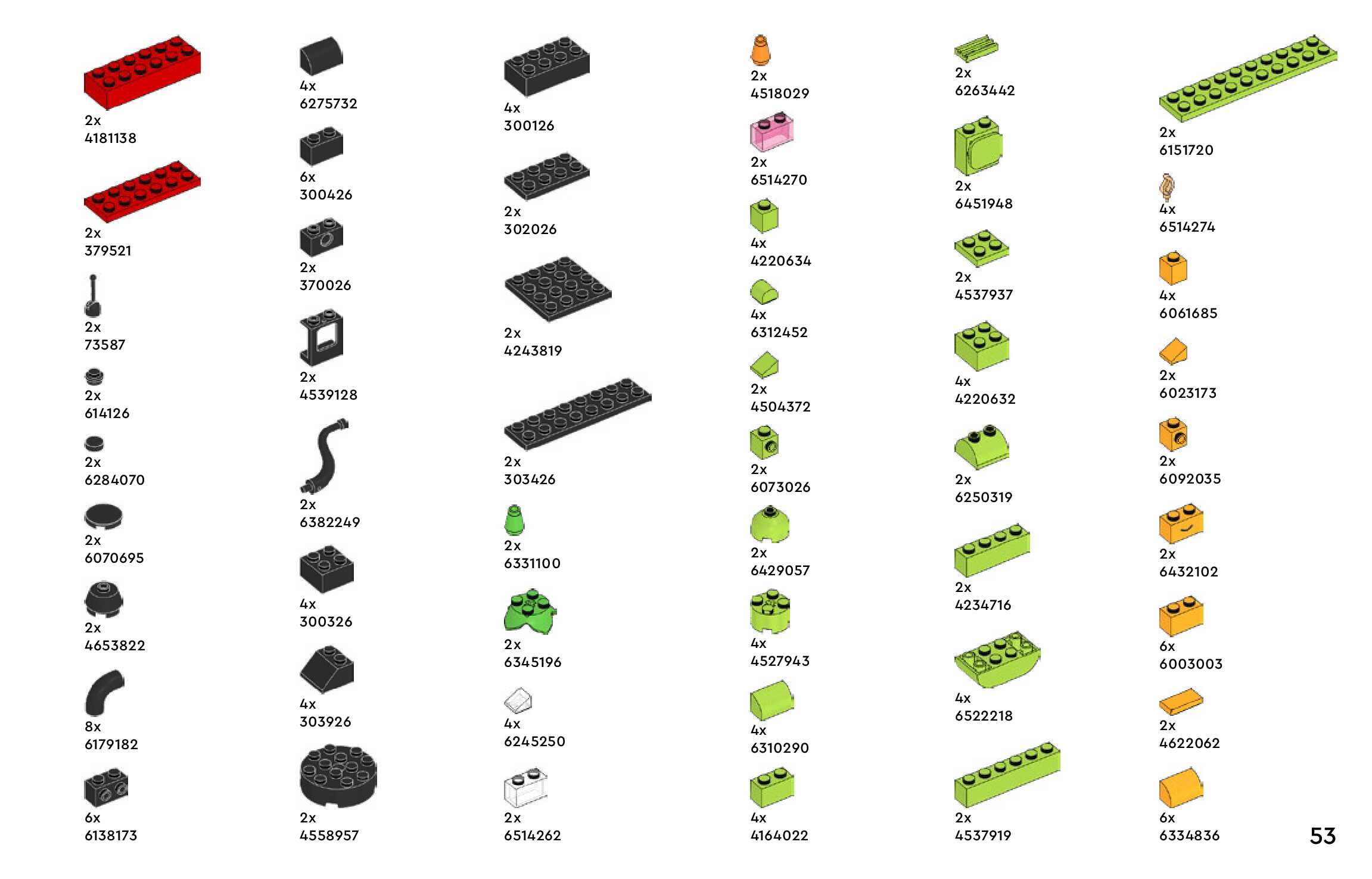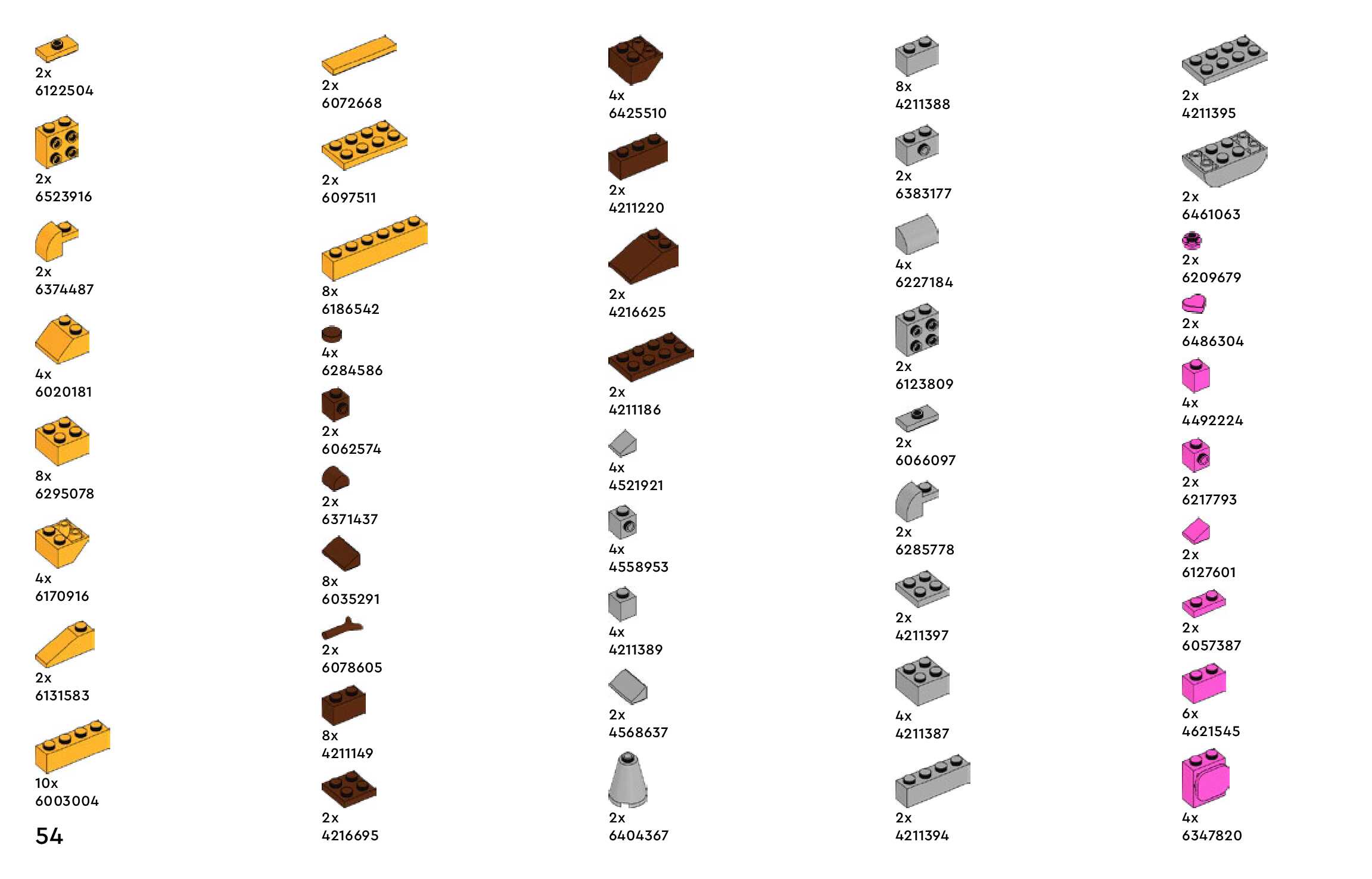 The assembly guide is prepared in a very understandable way for children and adult LEGO enthusiasts. A total of 108 picture galleries are shown, explaining the step-by-step construction stages for 2 different structures.
