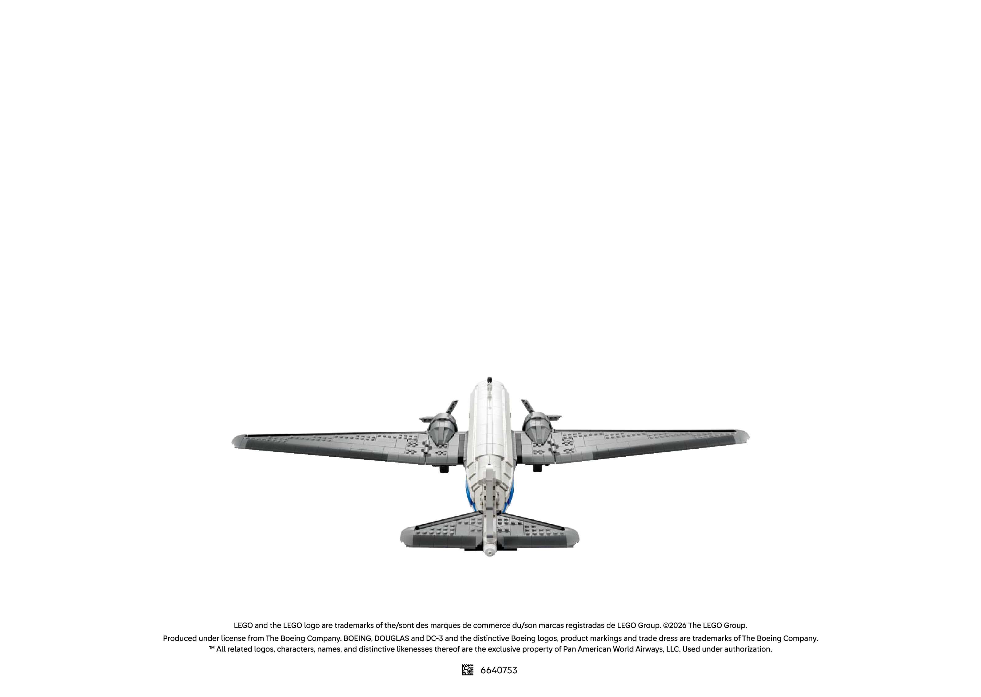 On this page you can find the original construction manual for the LEGO 11378 set. With the assembly manual you can easily learn how to build the Douglas™ DC-3™ PAN AM® Airliner step by step. The set was released in 2026.