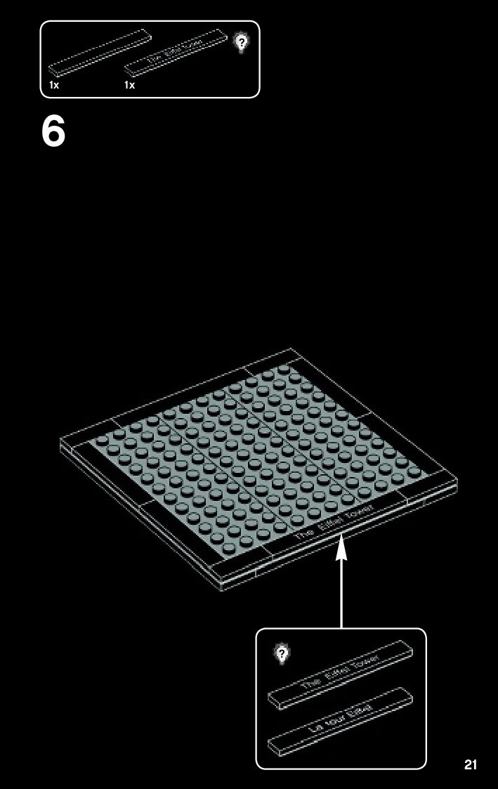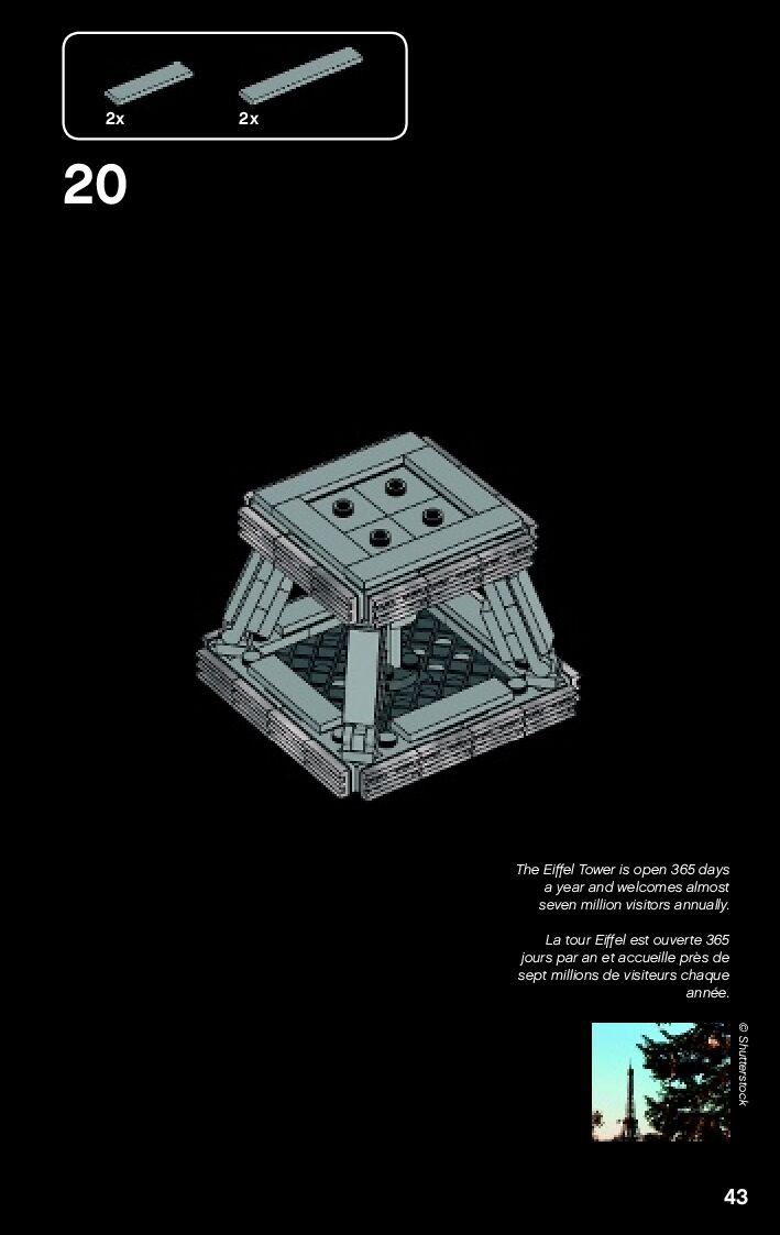 This page shares information about LEGO 21019 The Eiffel Tower manual, LEGO 21019 PDF instructions, LEGO 21019 The Eiffel Tower building guide online, How to build 21019 The Eiffel Tower LEGO.