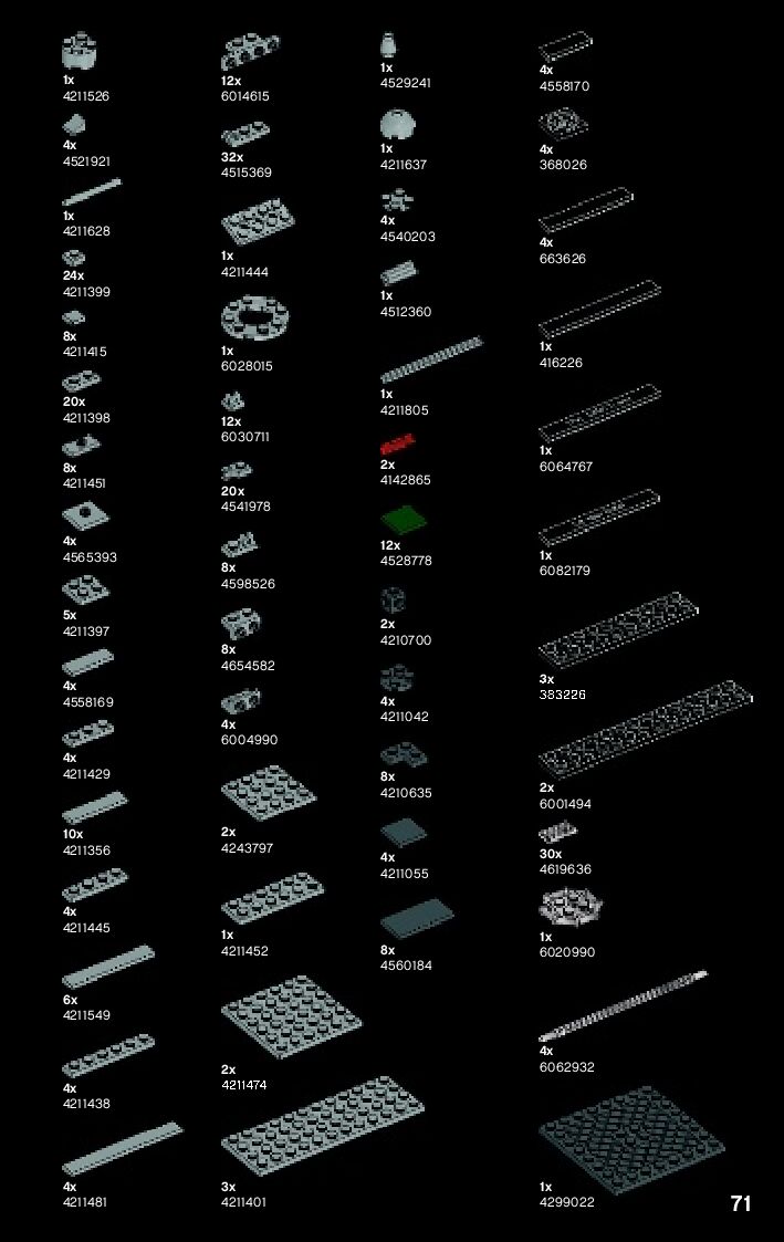 The assembly guide is prepared in a very understandable way for children and adult LEGO enthusiasts. A total of 72 picture galleries are shown, explaining the step-by-step construction stages for 1 different structures.