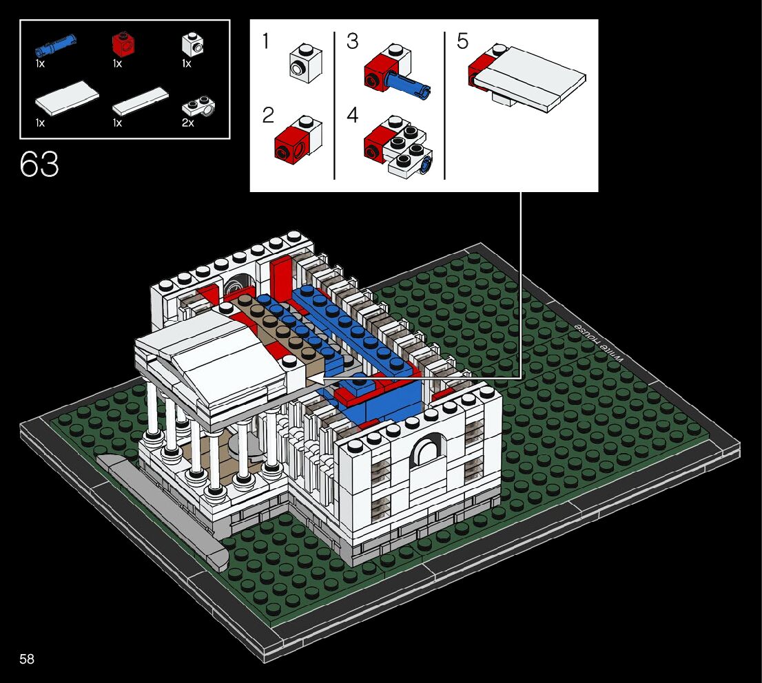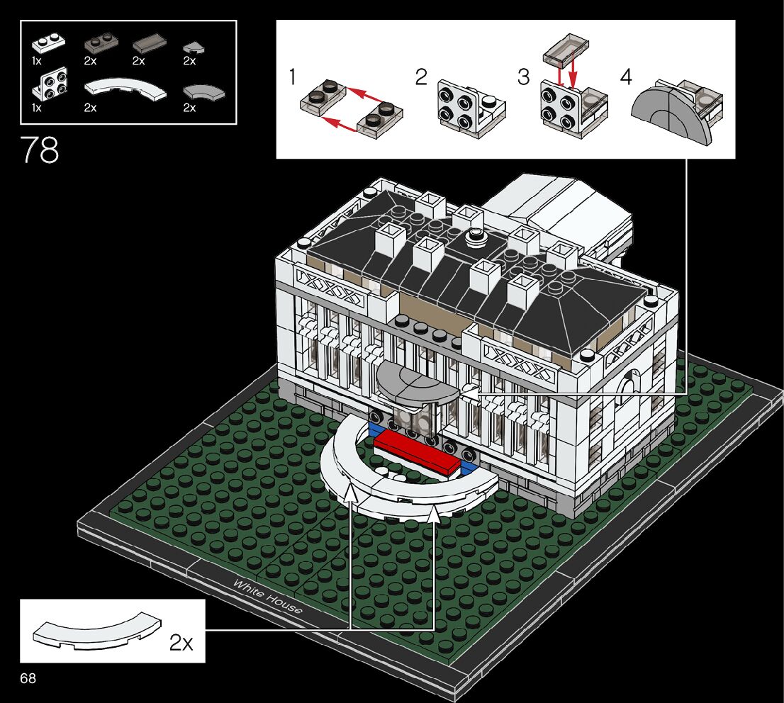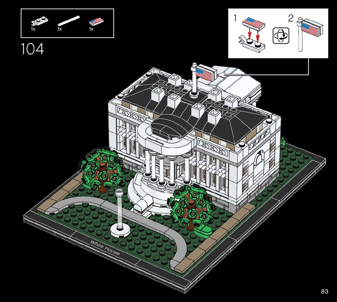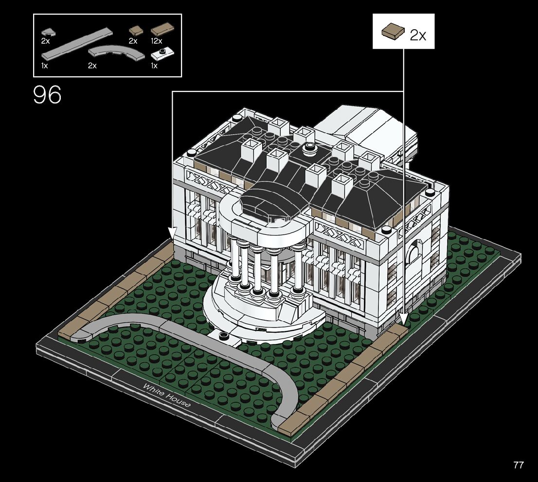 This page shares information about LEGO 21054 The White House manual, LEGO 21054 PDF instructions, LEGO 21054 The White House building guide online, How to build 21054 The White House LEGO.
