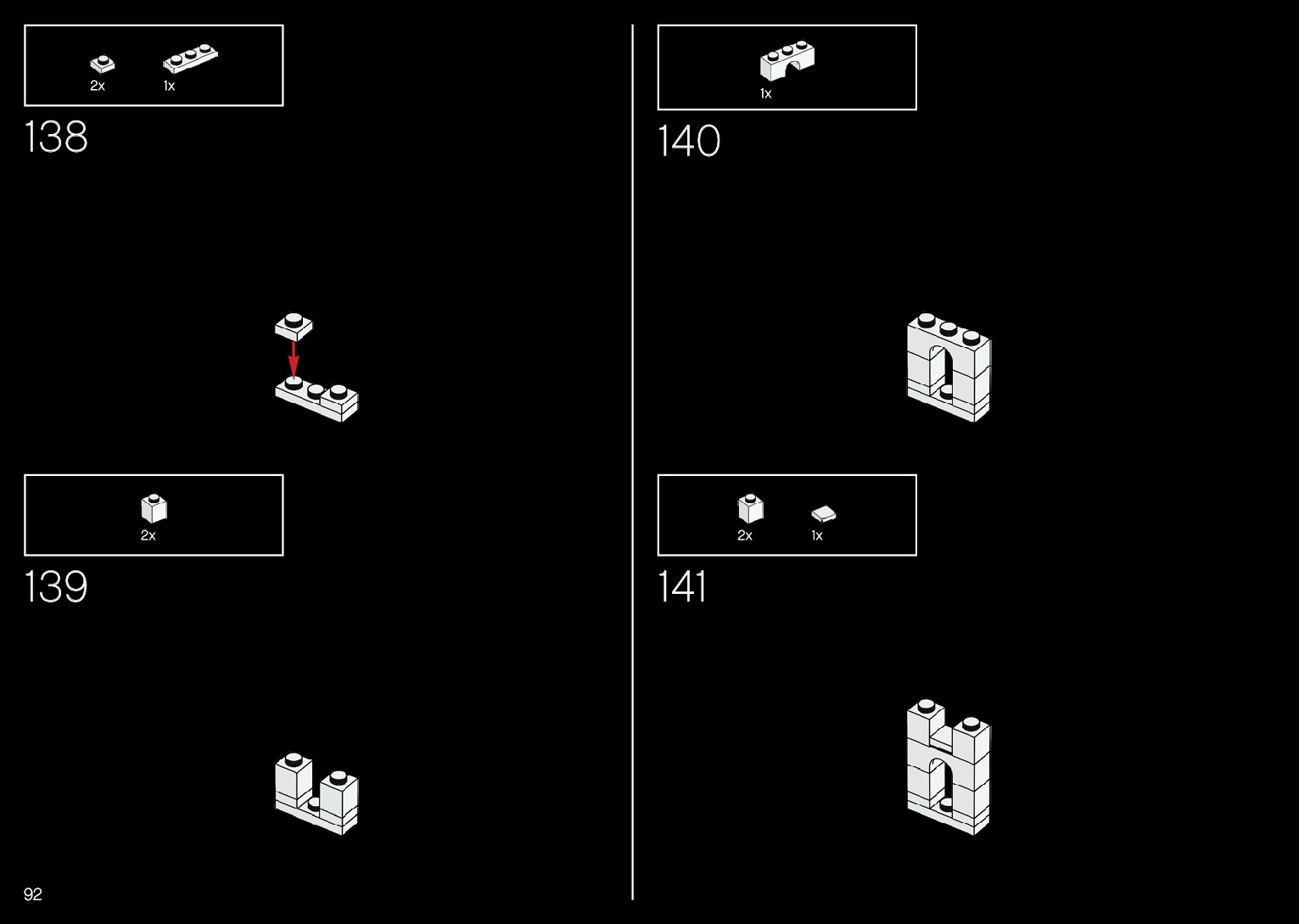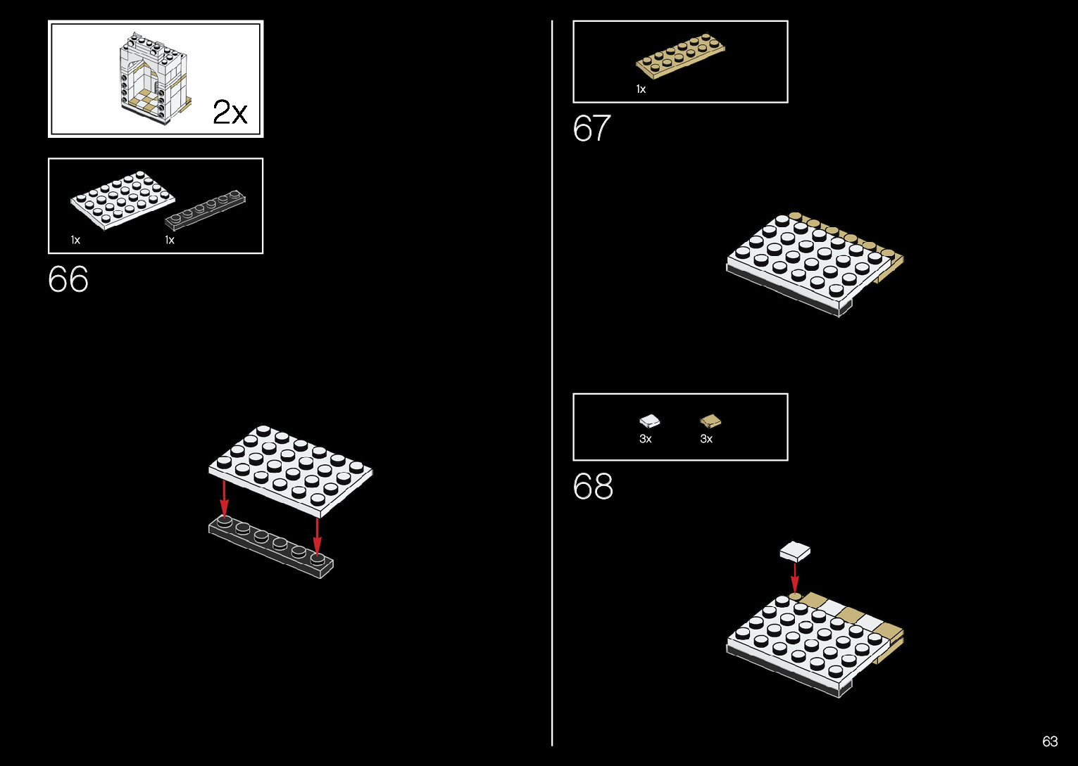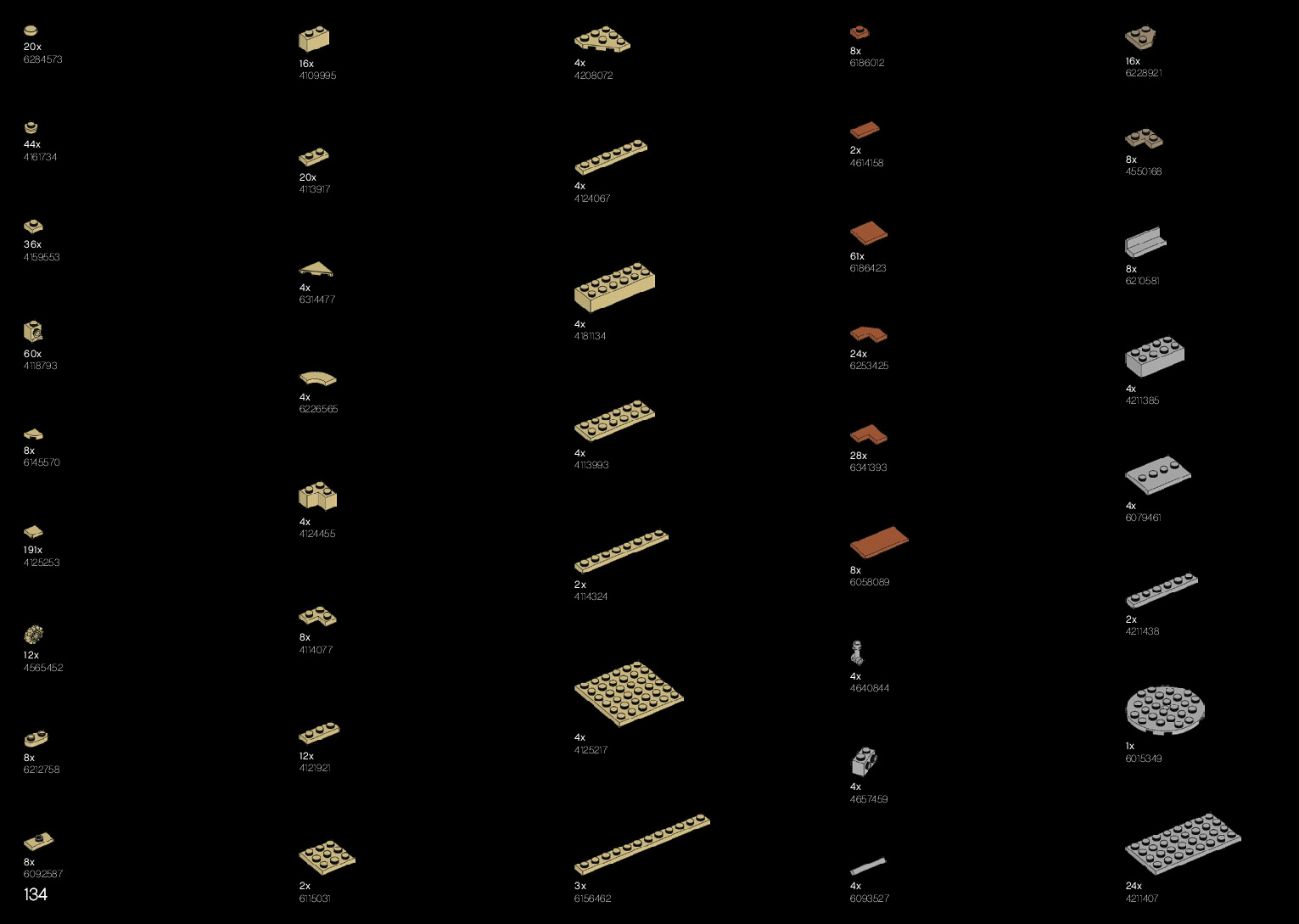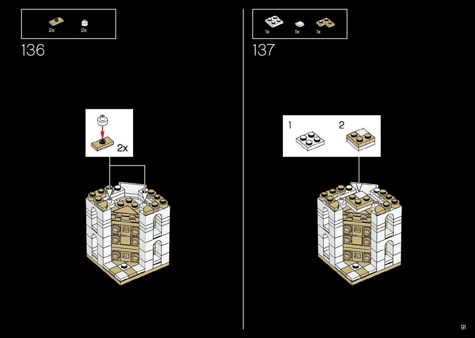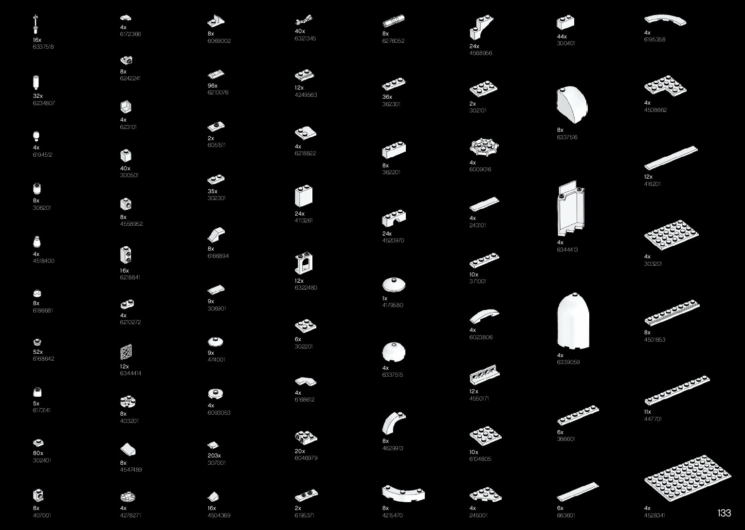 The assembly guide is prepared in a very understandable way for children and adult LEGO enthusiasts. A total of 136 picture galleries are shown, explaining the step-by-step construction stages for 1 different structures.