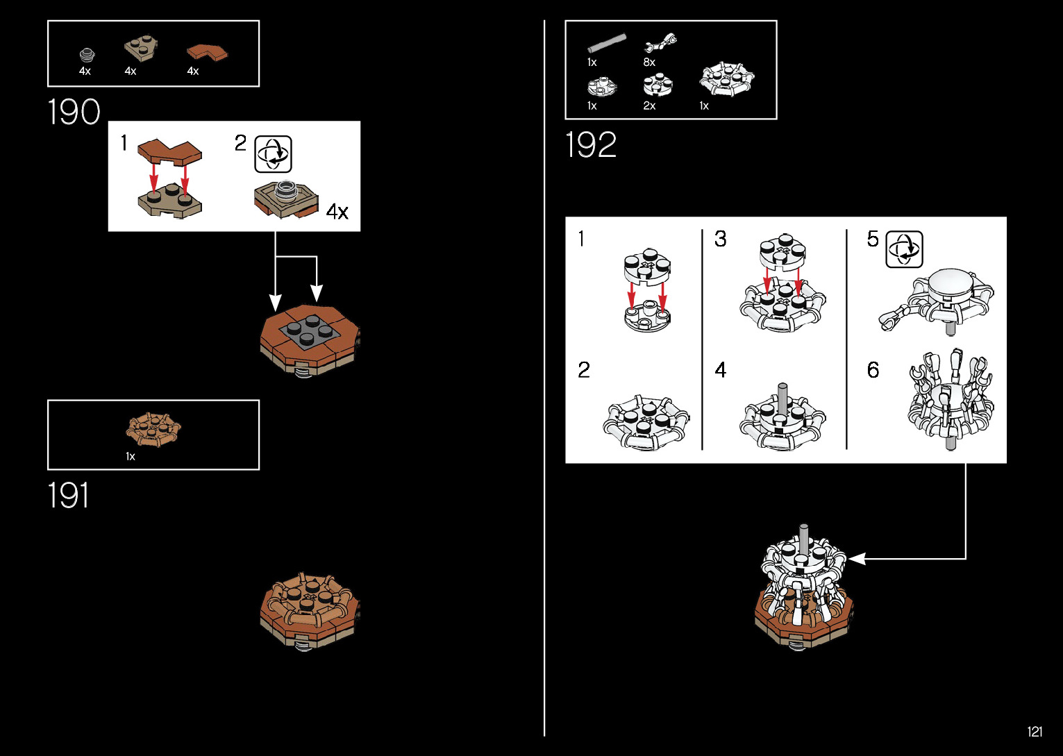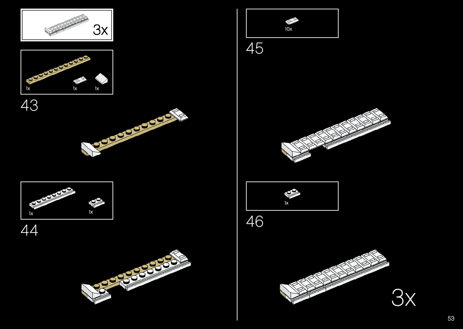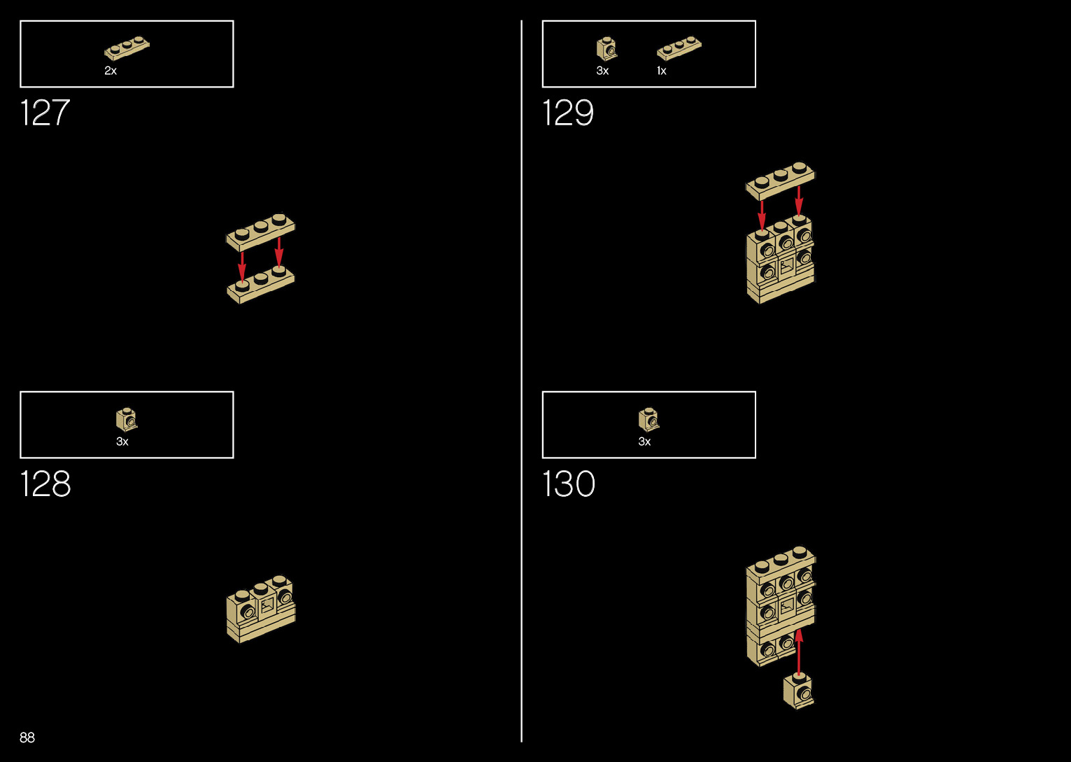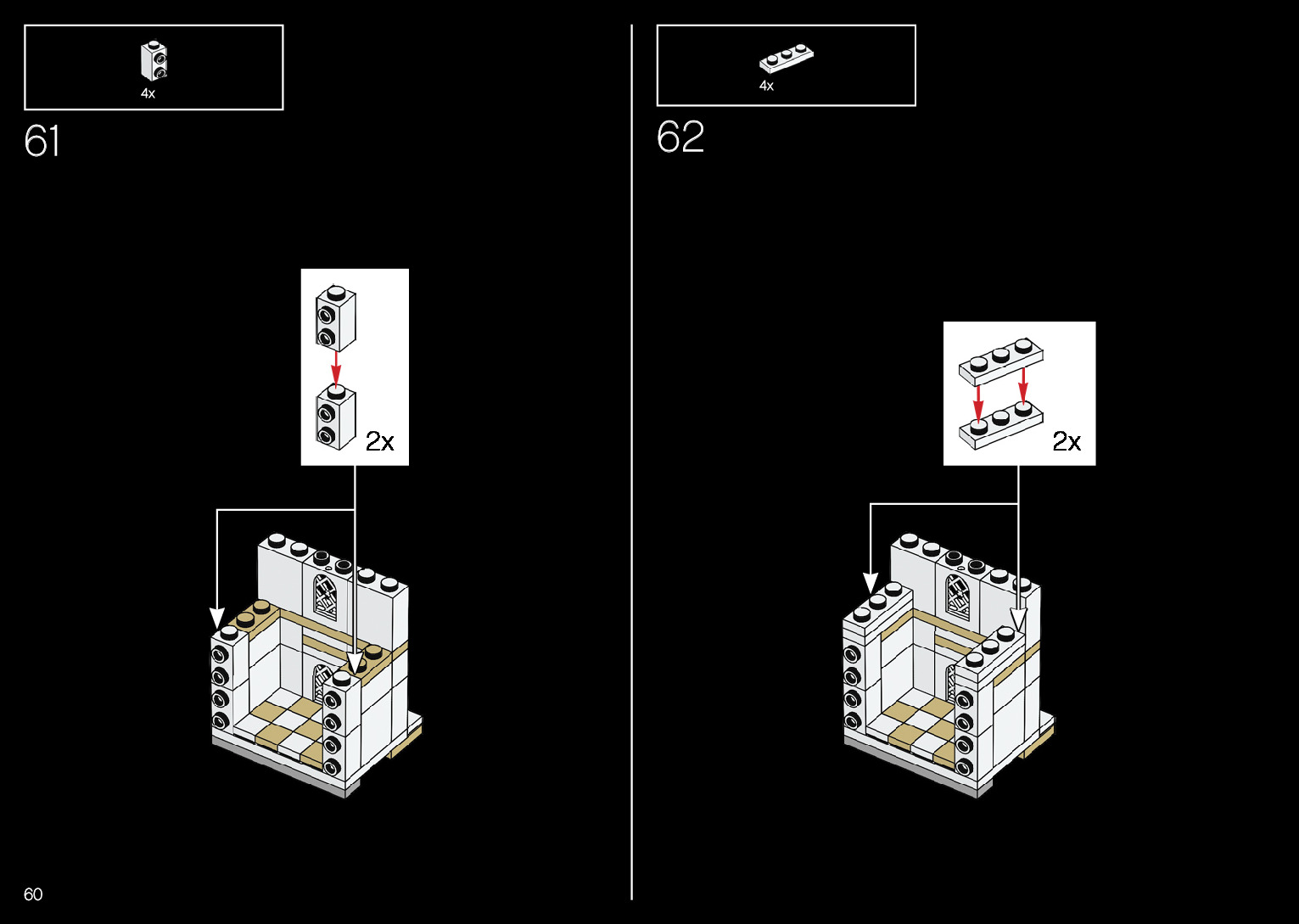 The assembly guide is prepared in a very understandable way for children and adult LEGO enthusiasts. A total of 136 picture galleries are shown, explaining the step-by-step construction stages for 1 different structures.