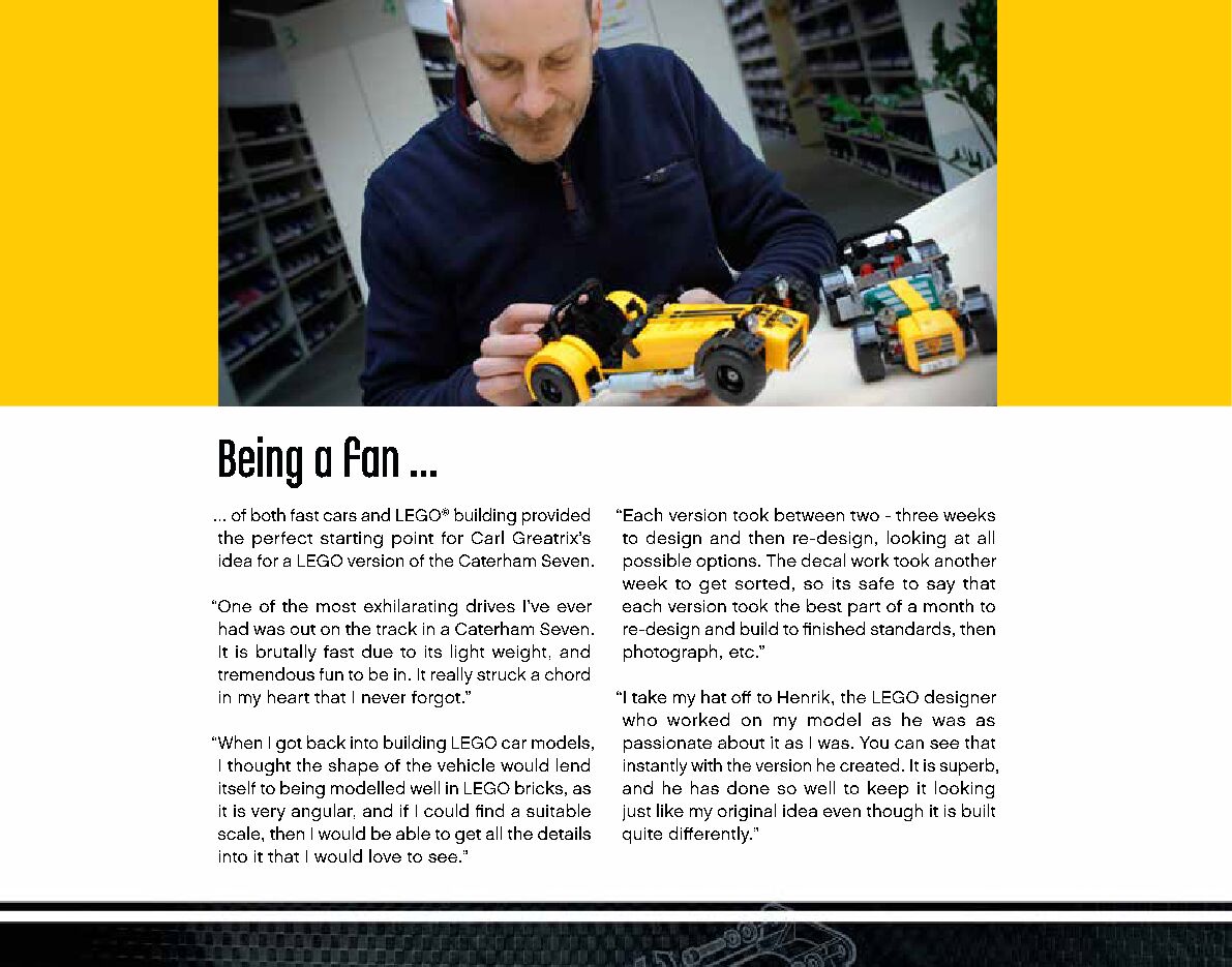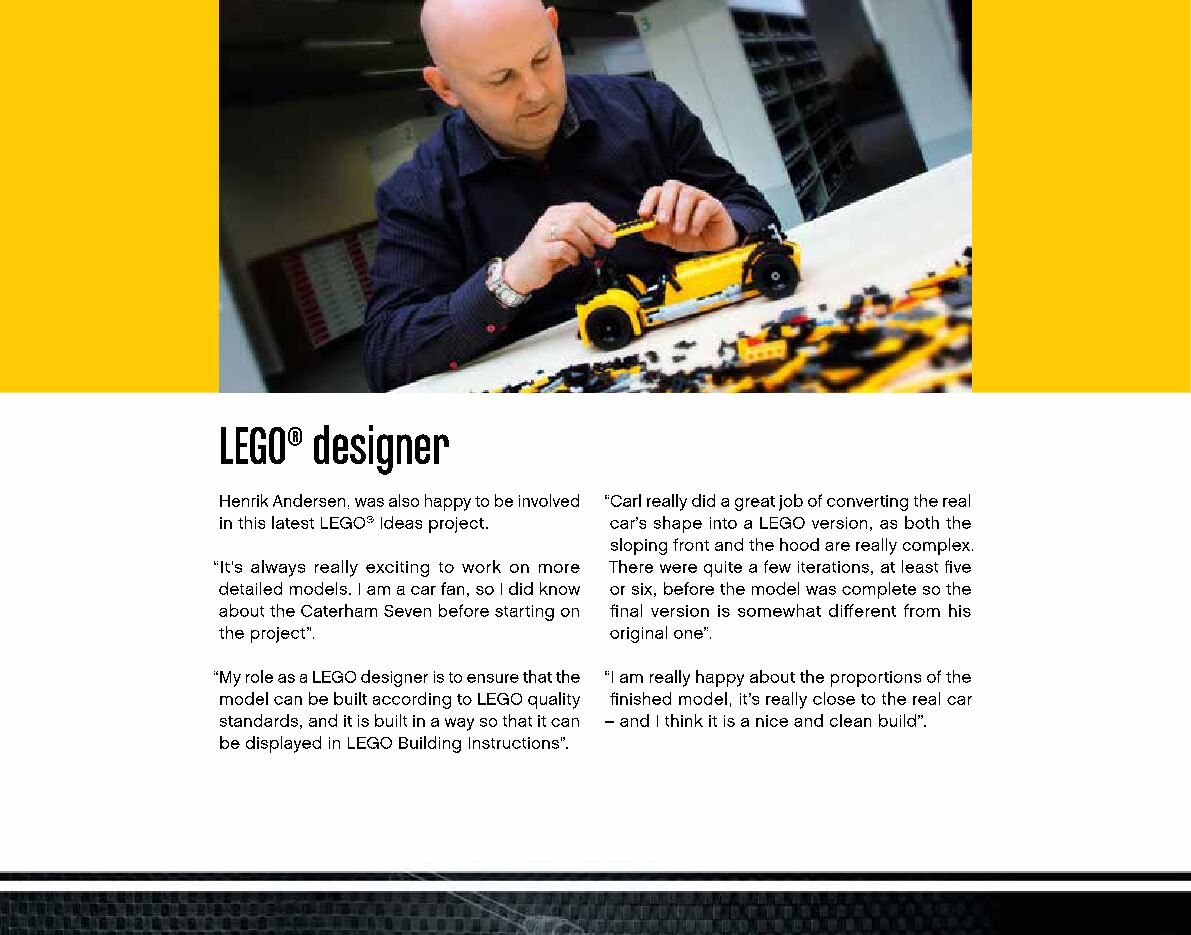 On this page you can find the original construction manual for the LEGO 21307 set. With the assembly manual you can easily learn how to build the 21307 Caterham Seven 620R step by step. The set was released in 2016.