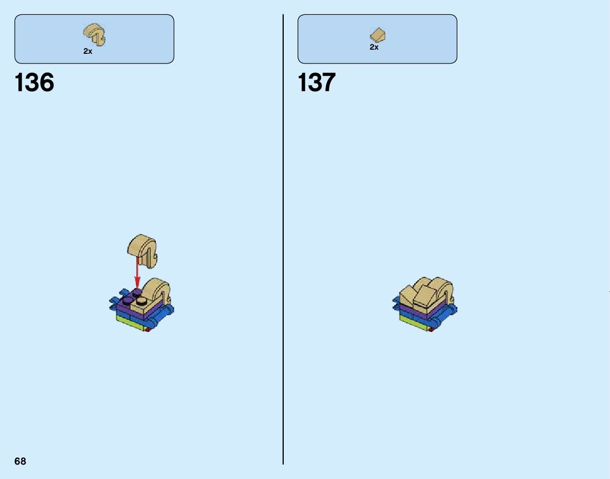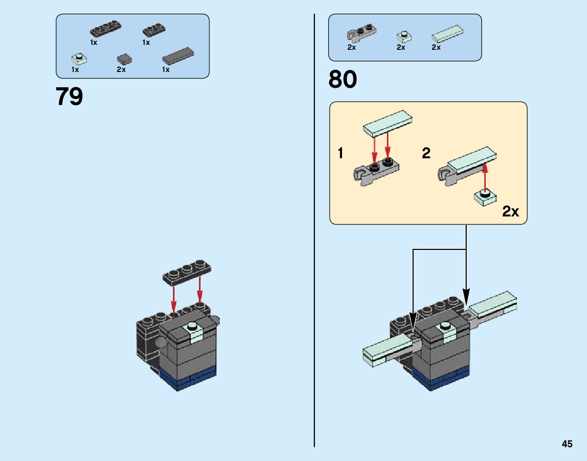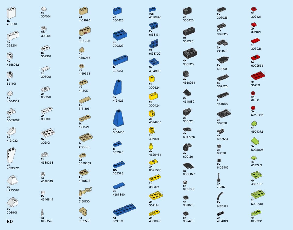 The assembly guide is prepared in a very understandable way for children and adult LEGO enthusiasts. A total of 84 picture galleries are shown, explaining the step-by-step construction stages for 1 different structures.