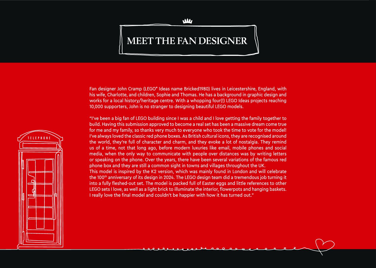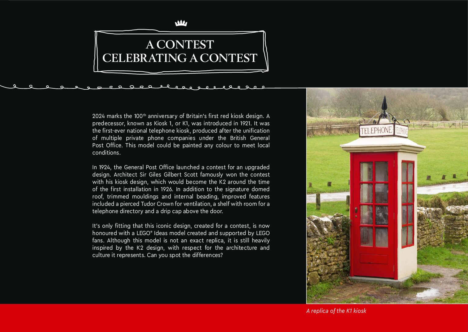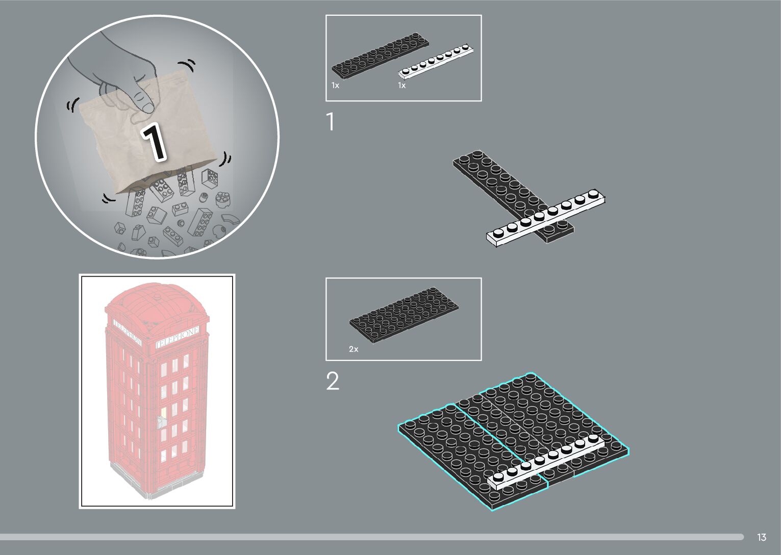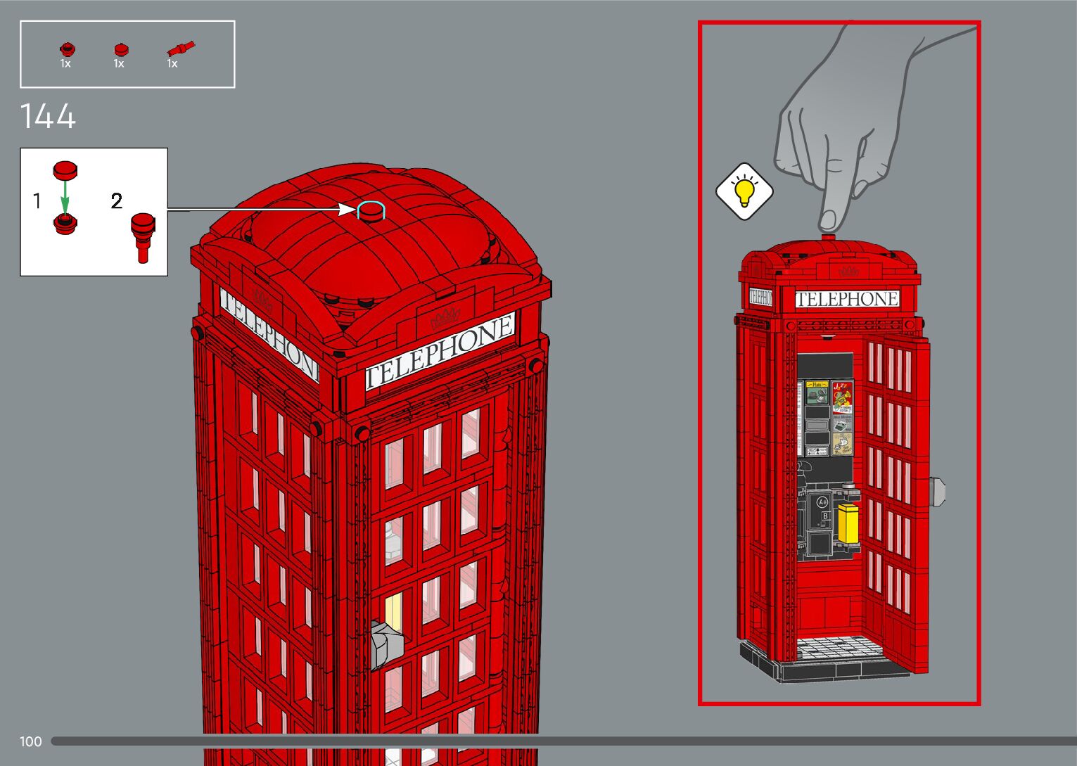 On this page you can find the original construction manual for the LEGO 21347 set. With the assembly manual you can easily learn how to build the 21347 Red London Telephone Box step by step. The set was released in 2024.