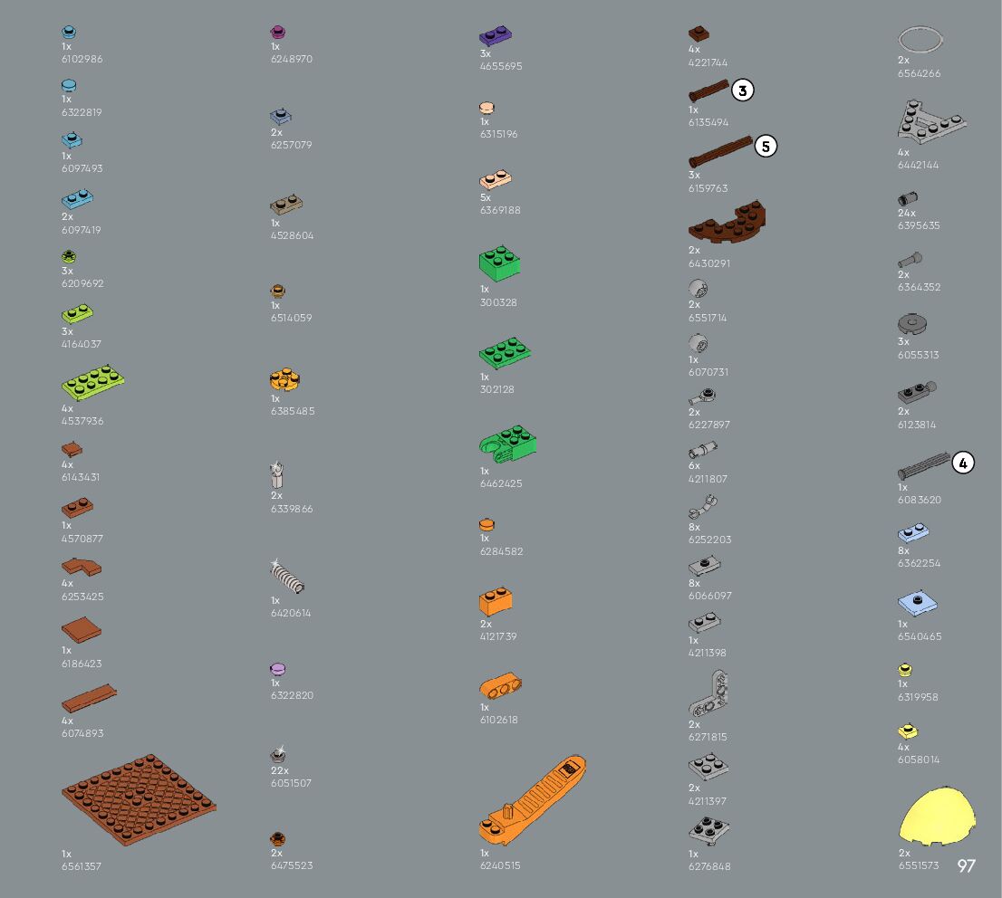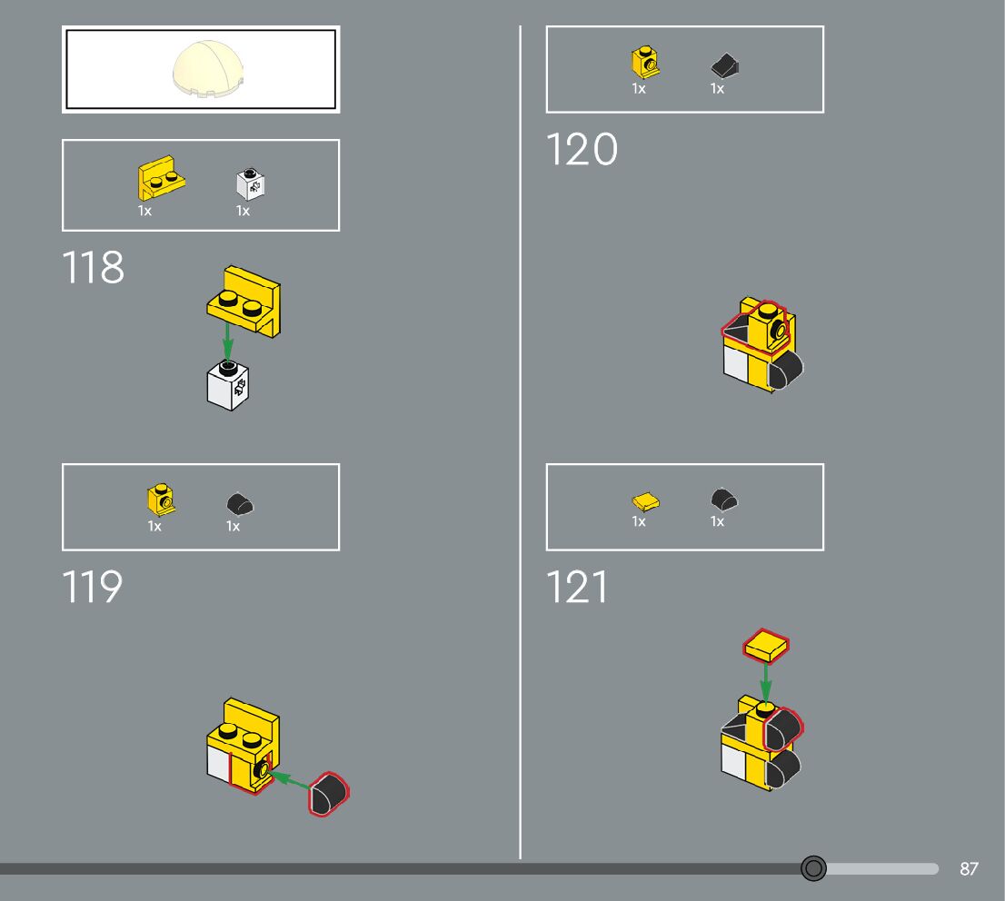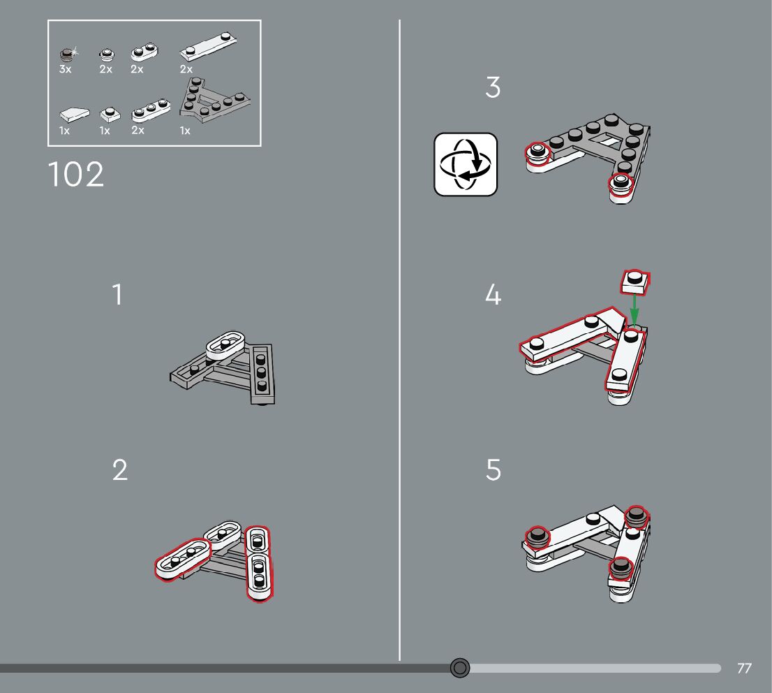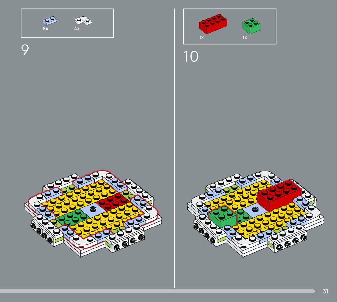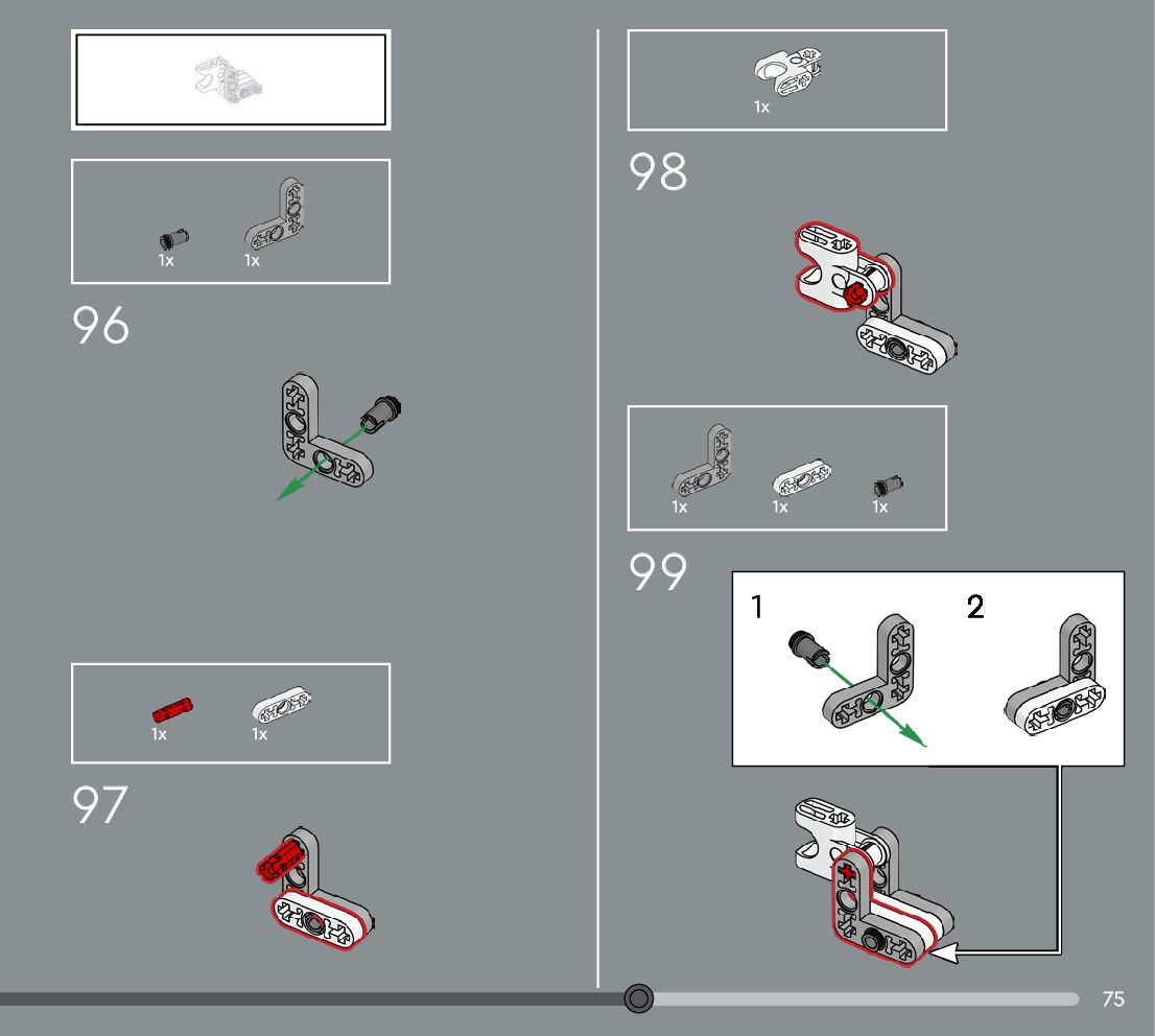 The assembly guide is prepared in a very understandable way for children and adult LEGO enthusiasts. A total of 100 picture galleries are shown, explaining the step-by-step construction stages for 1 different structures.