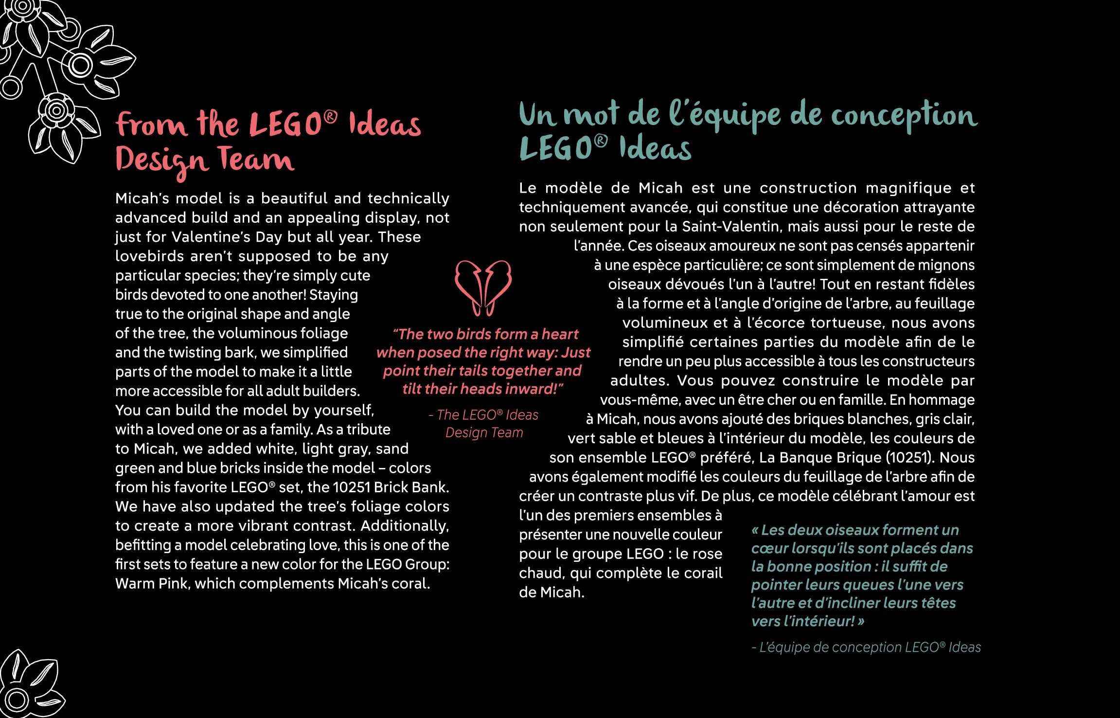 This page shares information about LEGO Love Birds manual, LEGO 21365 PDF instructions, LEGO Love Birds building guide online, How to build Love Birds LEGO.