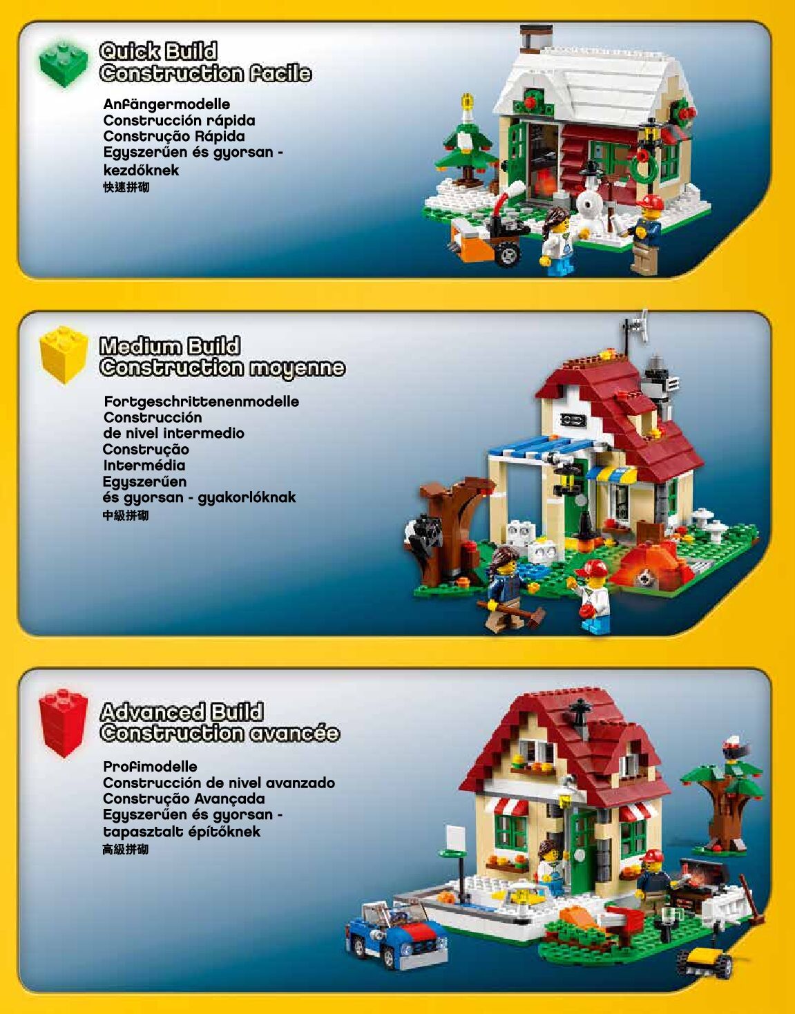 The assembly guide is prepared in a very understandable way for children and adult LEGO enthusiasts. A total of 224 picture galleries are shown, explaining the step-by-step construction stages for 3 different structures.