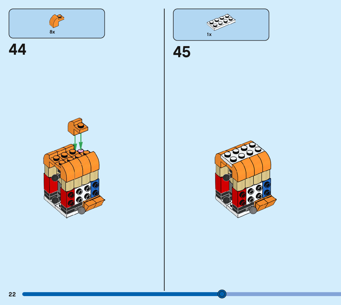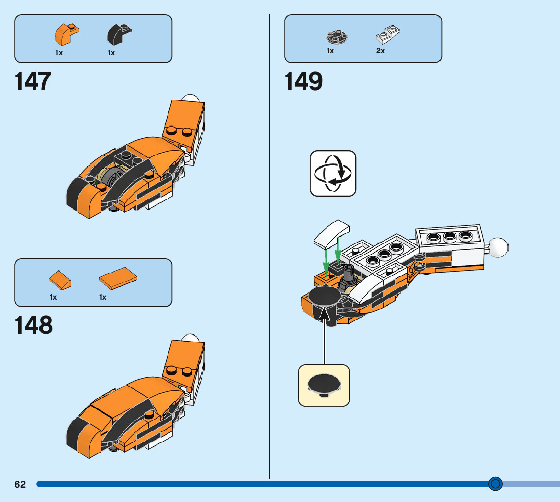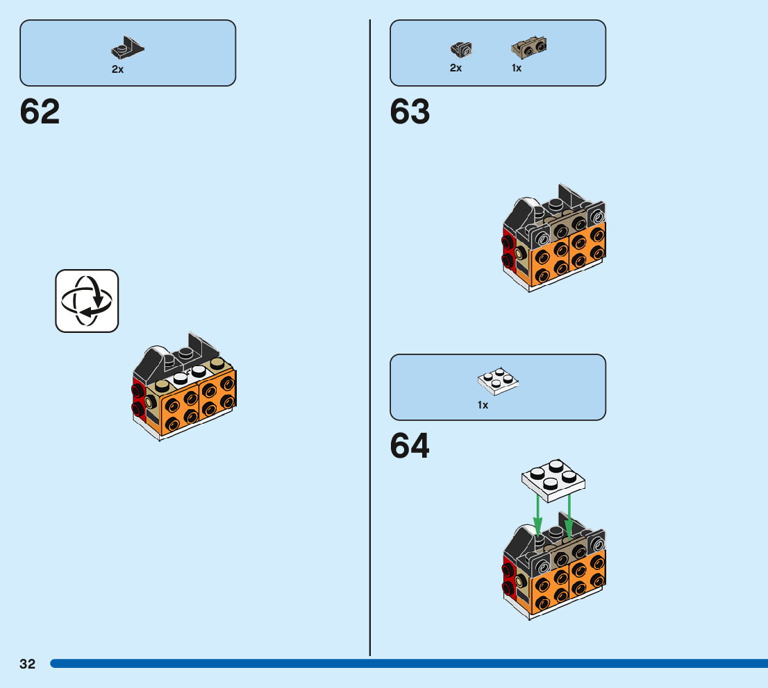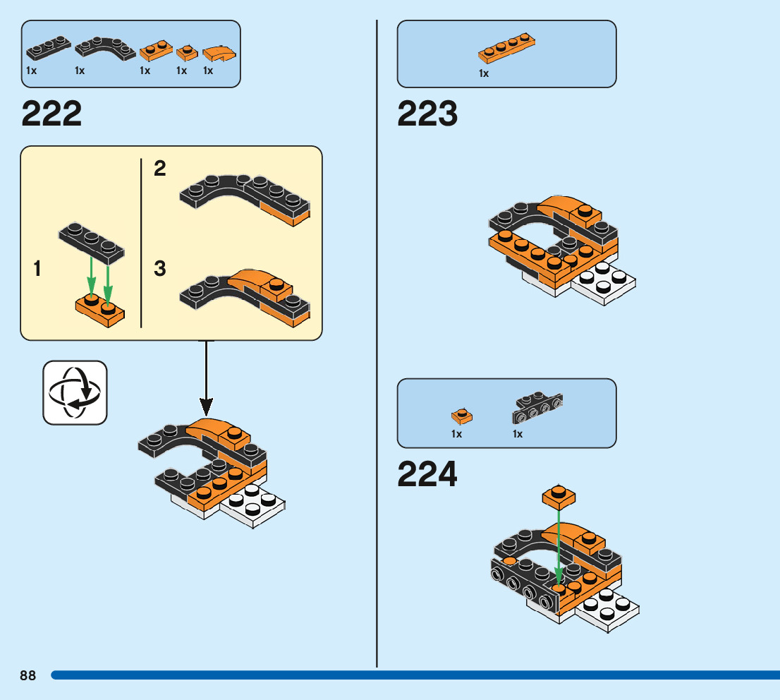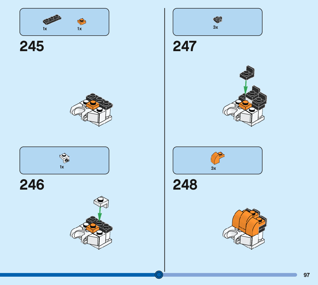 The assembly guide is prepared in a very understandable way for children and adult LEGO enthusiasts. A total of 244 picture galleries are shown, explaining the step-by-step construction stages for 3 different structures.
