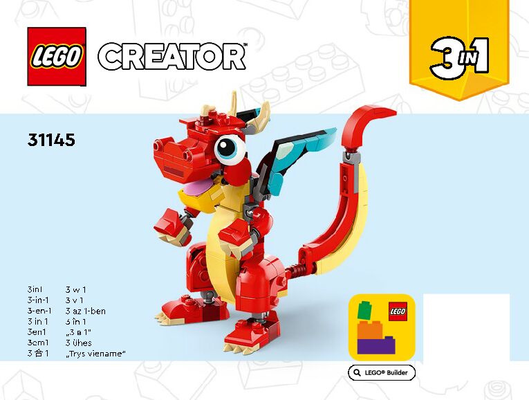 This page shares information about LEGO 31145 Red Dragon manual, LEGO 31145 PDF instructions, LEGO 31145 Red Dragon building guide online, How to build 31145 Red Dragon LEGO.