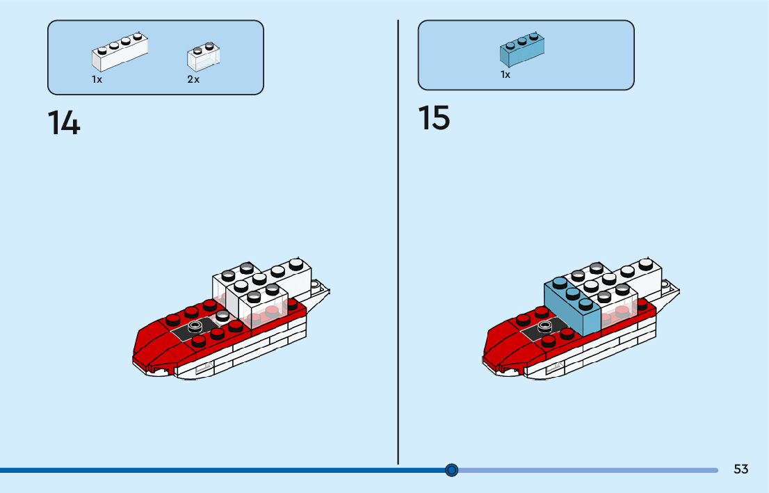 The assembly guide is prepared in a very understandable way for children and adult LEGO enthusiasts. A total of 144 picture galleries are shown, explaining the step-by-step construction stages for 3 different structures.
