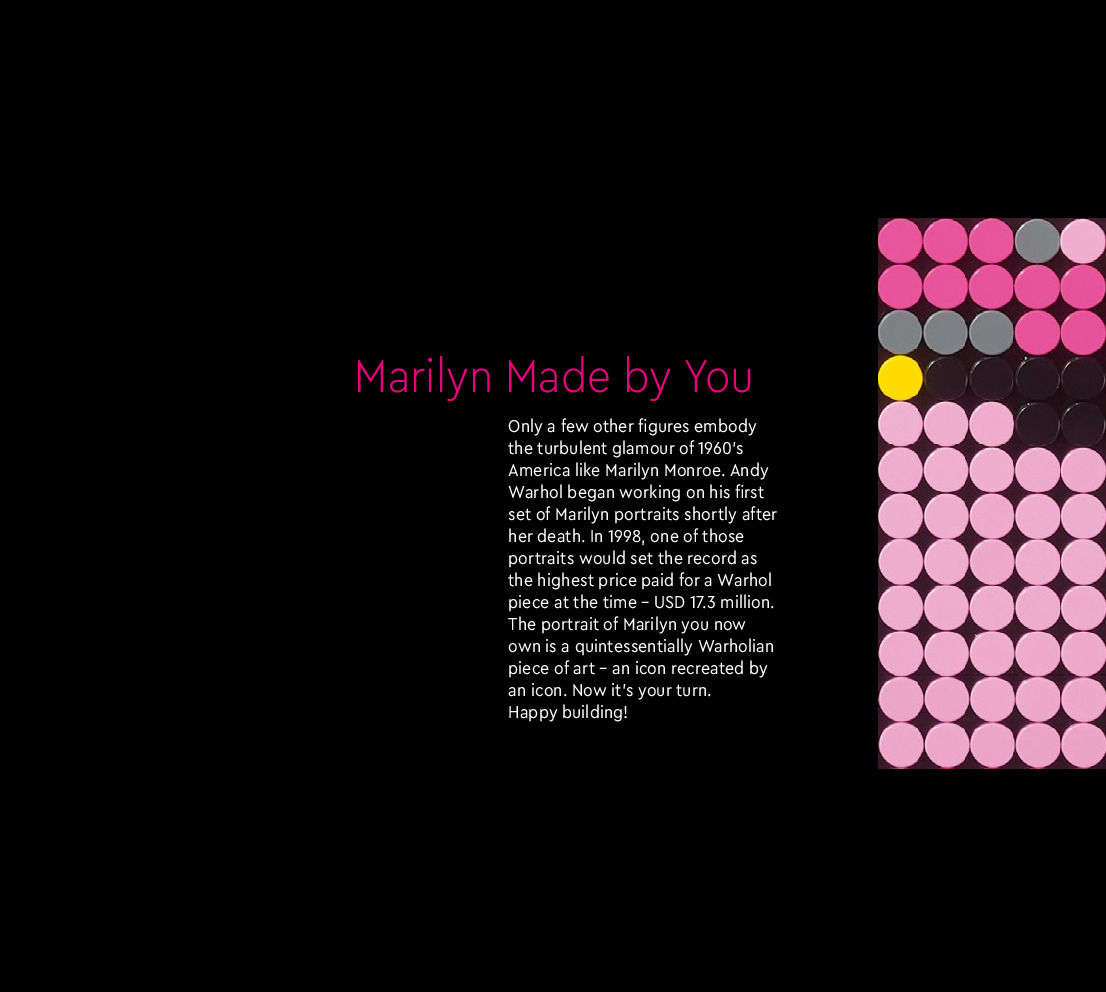 On this page you can find the original construction manual for the LEGO 31197 set. With the assembly manual you can easily learn how to build the 31197 Andy Warhol's Marilyn Monroe step by step. The set was released in 2020.