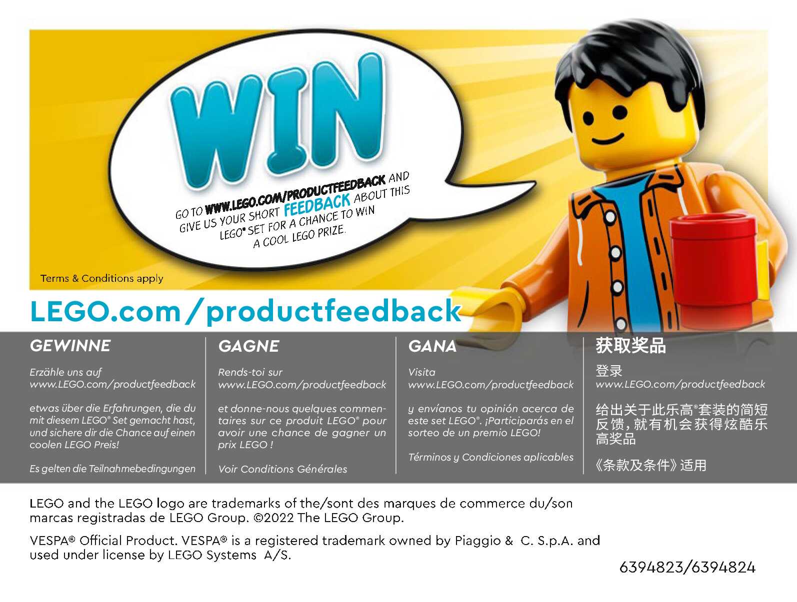 On this page you can find the original construction manual for the LEGO 40517 set. With the assembly manual you can easily learn how to build the Vespa step by step. The set was released in 2022.