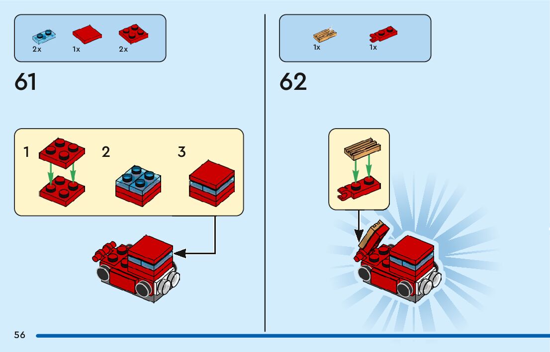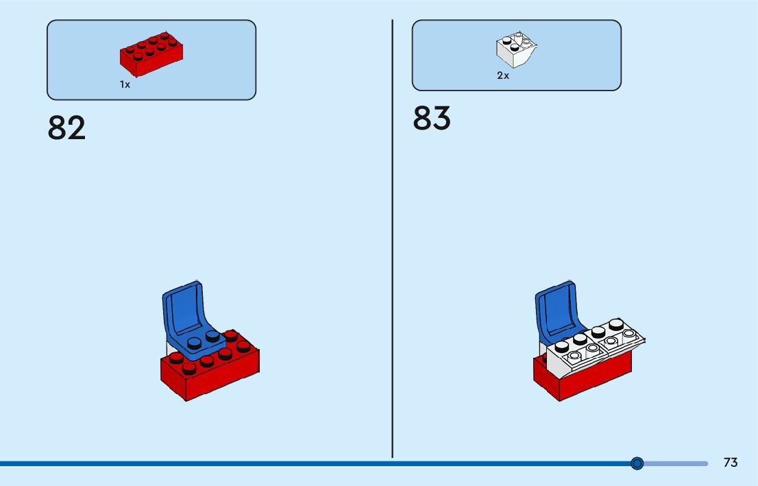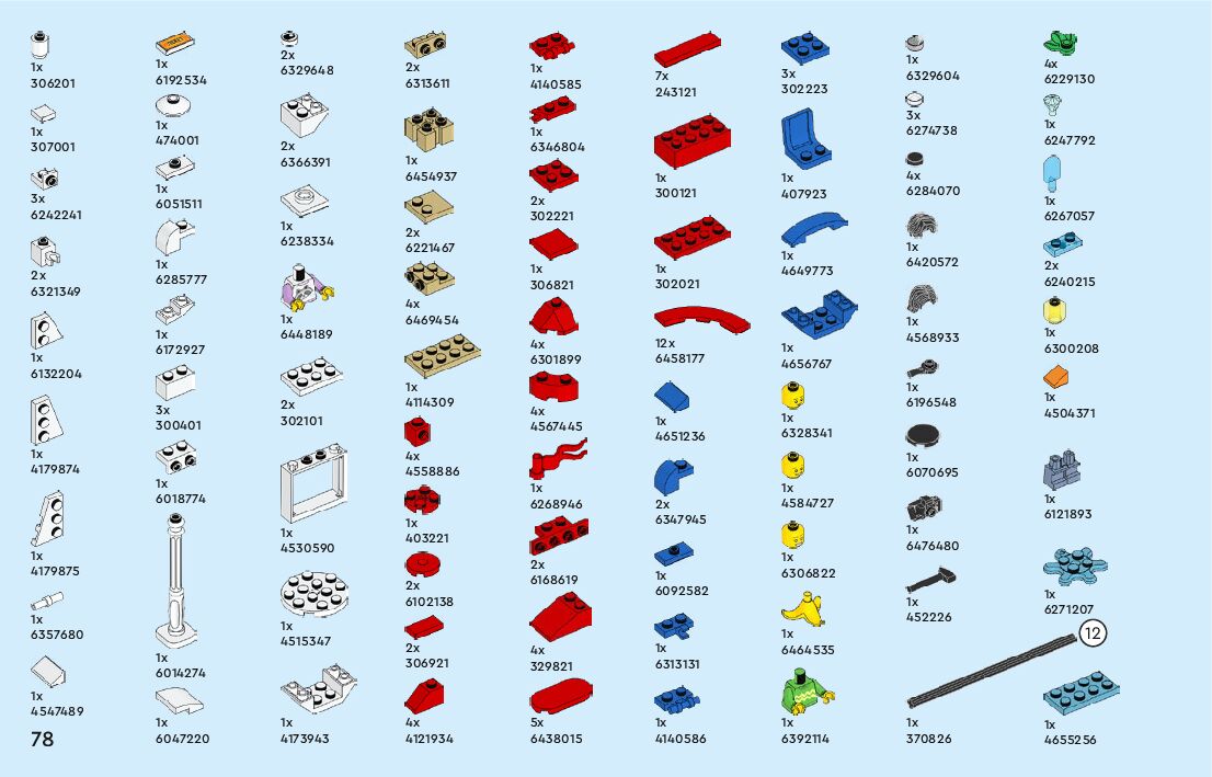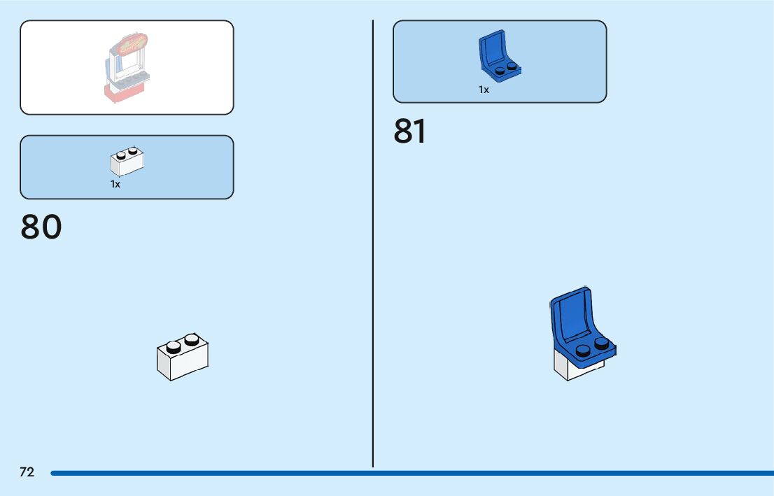 The assembly guide is prepared in a very understandable way for children and adult LEGO enthusiasts. A total of 80 picture galleries are shown, explaining the step-by-step construction stages for 1 different structures.