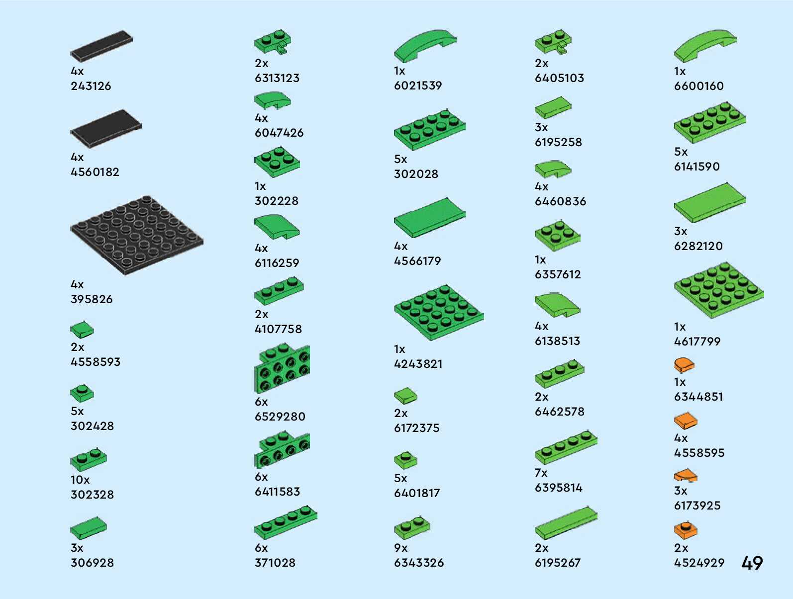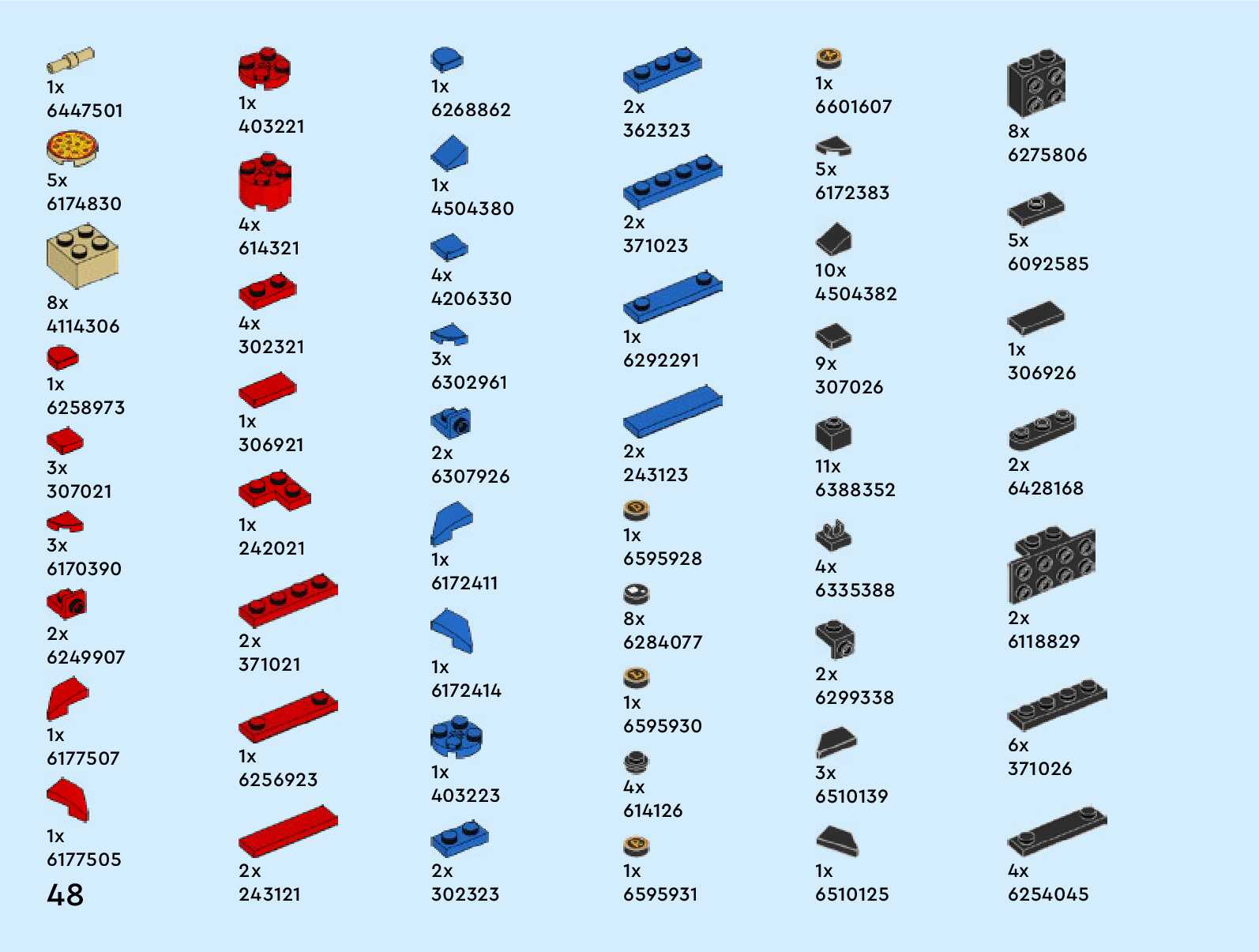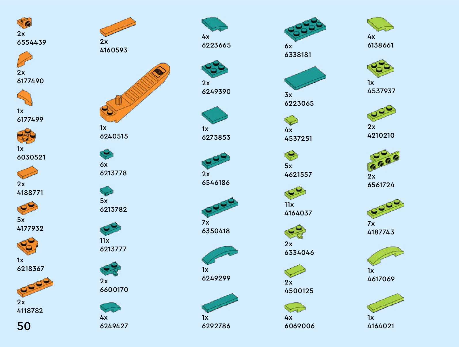 The assembly guide is prepared in a very understandable way for children and adult LEGO enthusiasts. A total of 188 picture galleries are shown, explaining the step-by-step construction stages for 4 different structures.