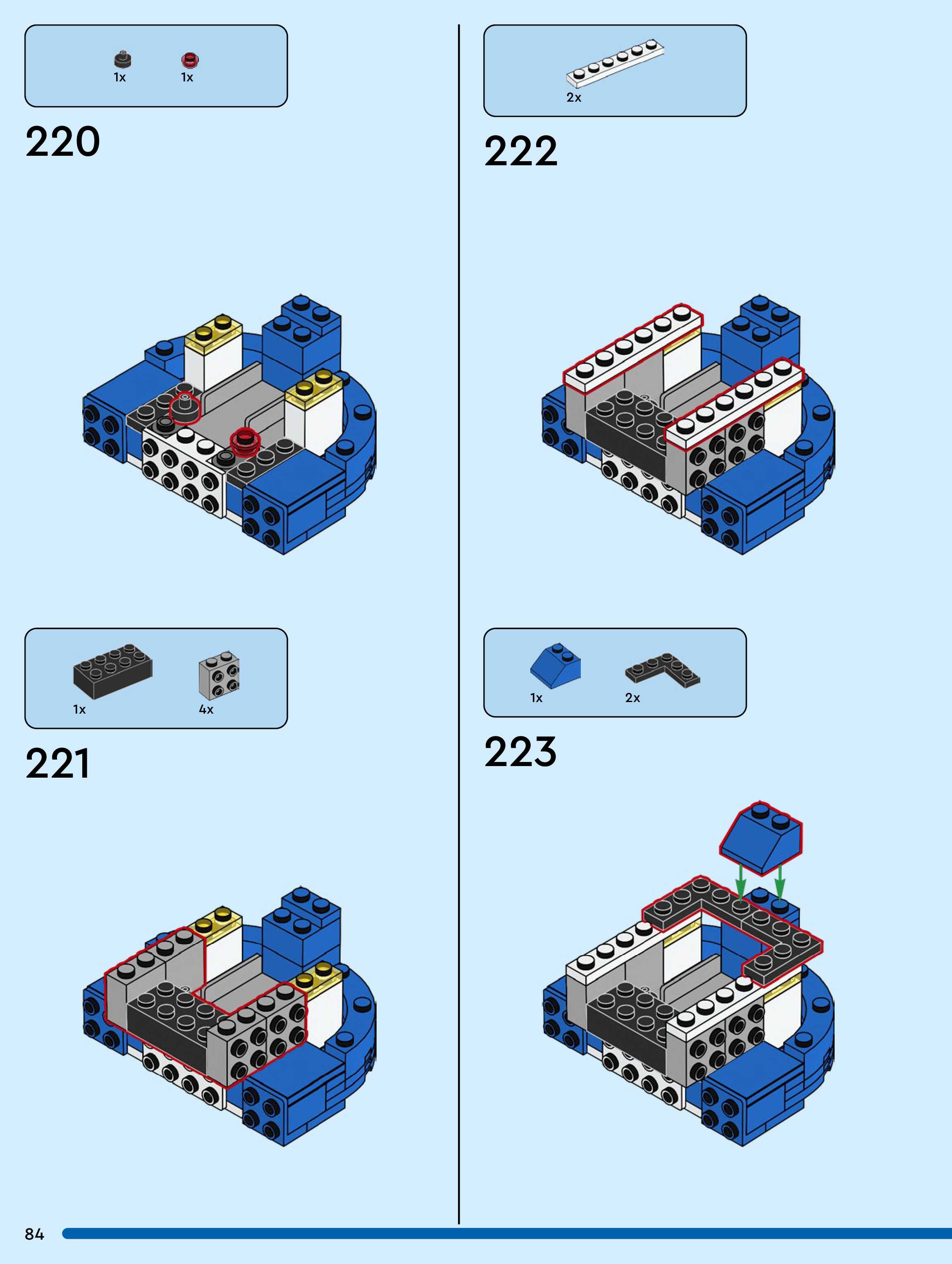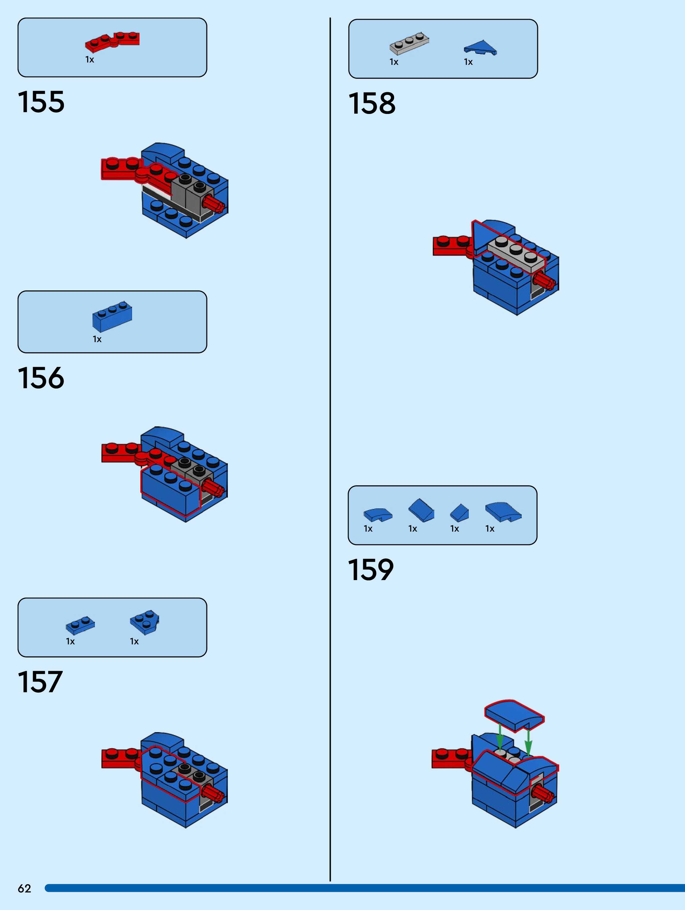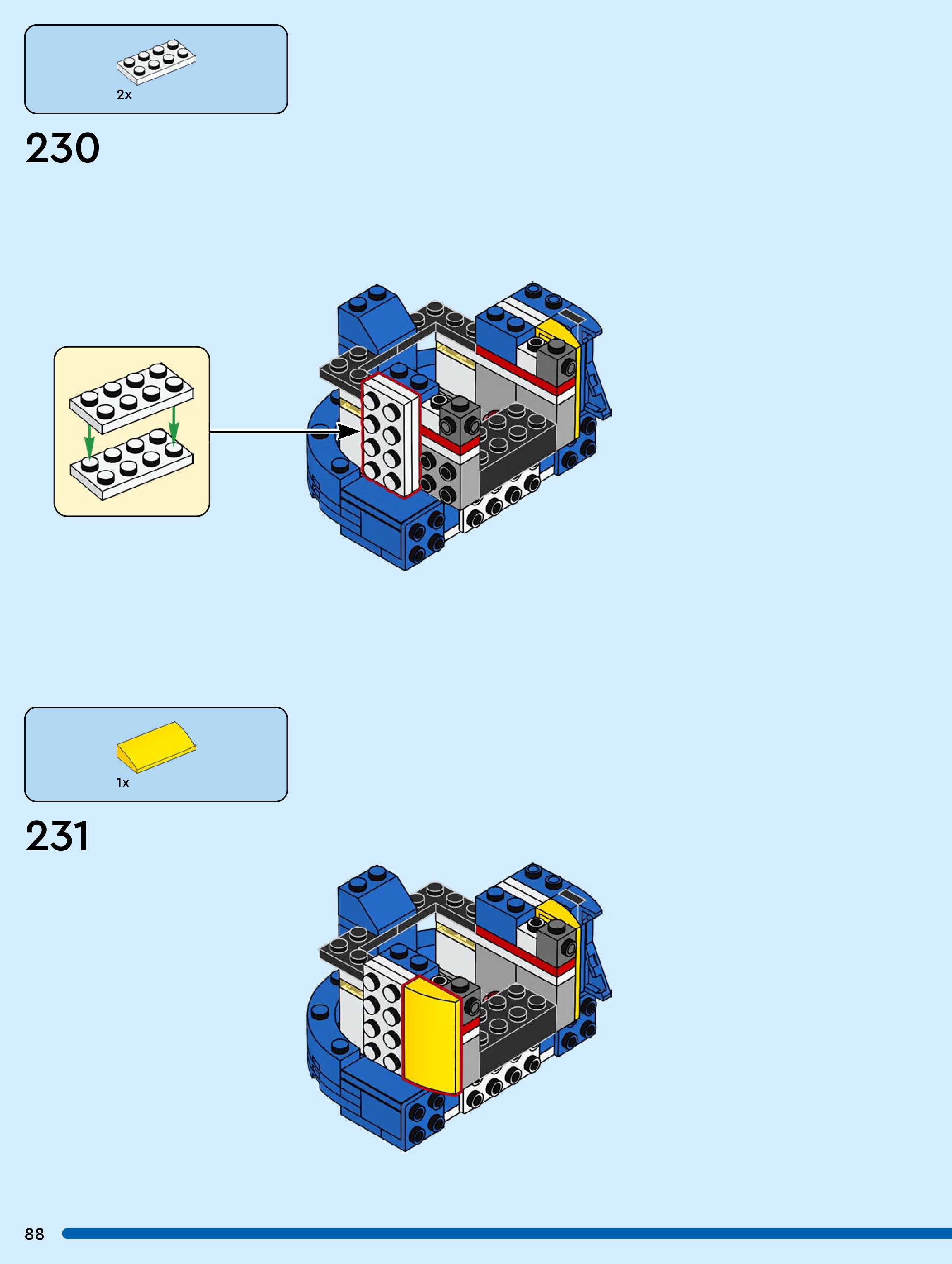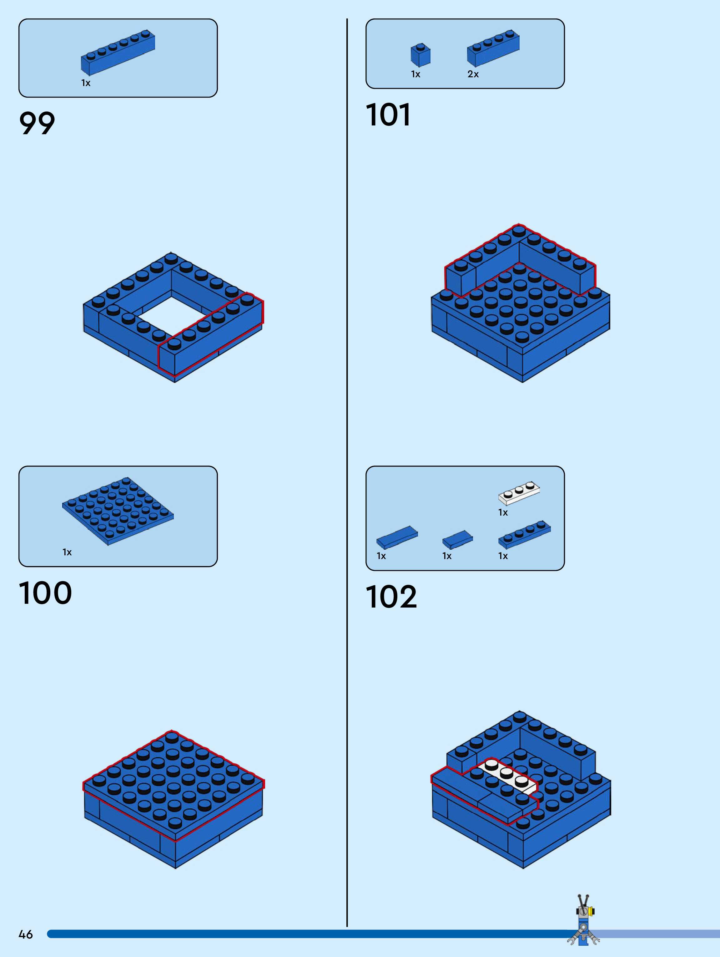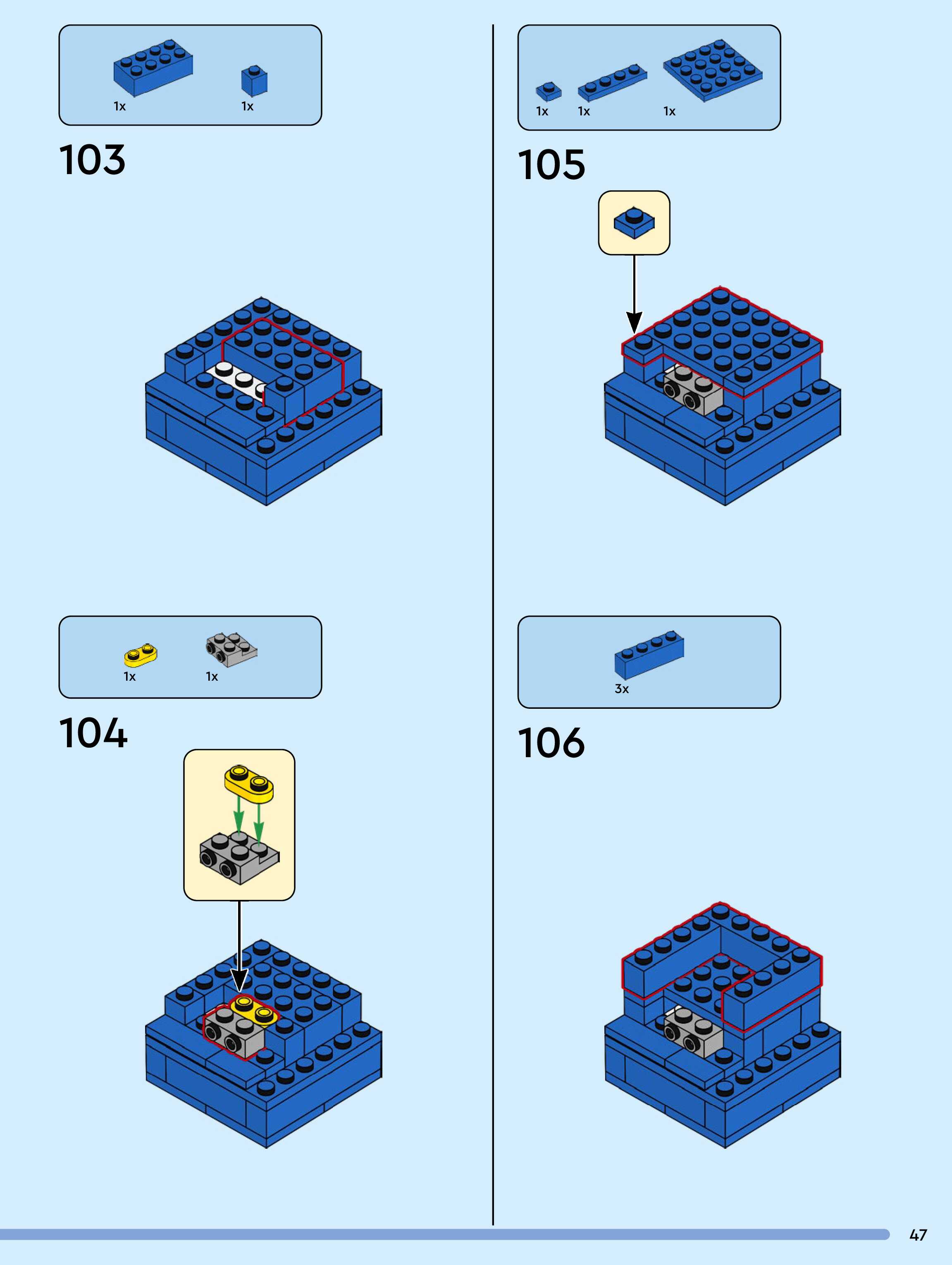 The assembly guide is prepared in a very understandable way for children and adult LEGO enthusiasts. A total of 104 picture galleries are shown, explaining the step-by-step construction stages for 1 different structures.