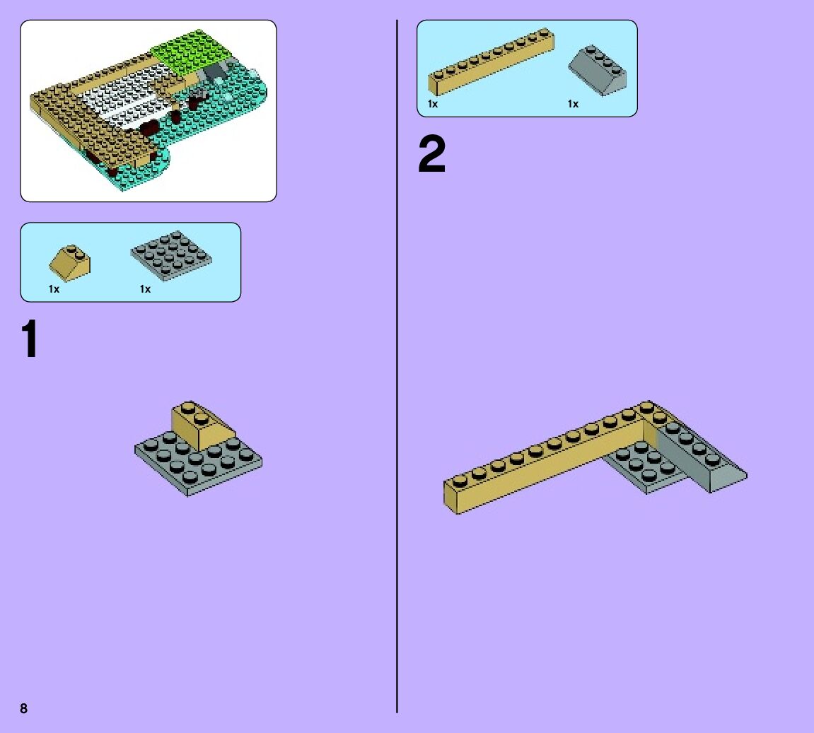 The assembly guide is prepared in a very understandable way for children and adult LEGO enthusiasts. A total of 124 picture galleries are shown, explaining the step-by-step construction stages for 2 different structures.