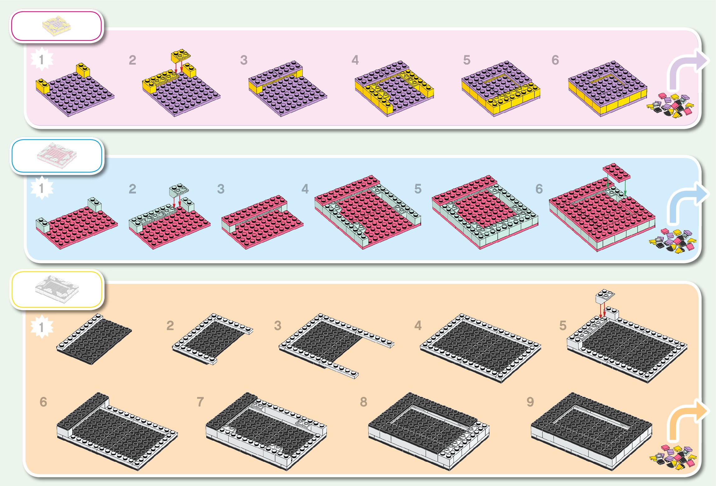 The assembly guide is prepared in a very understandable way for children and adult LEGO enthusiasts. A total of 4 picture galleries are shown, explaining the step-by-step construction stages for 2 different structures.