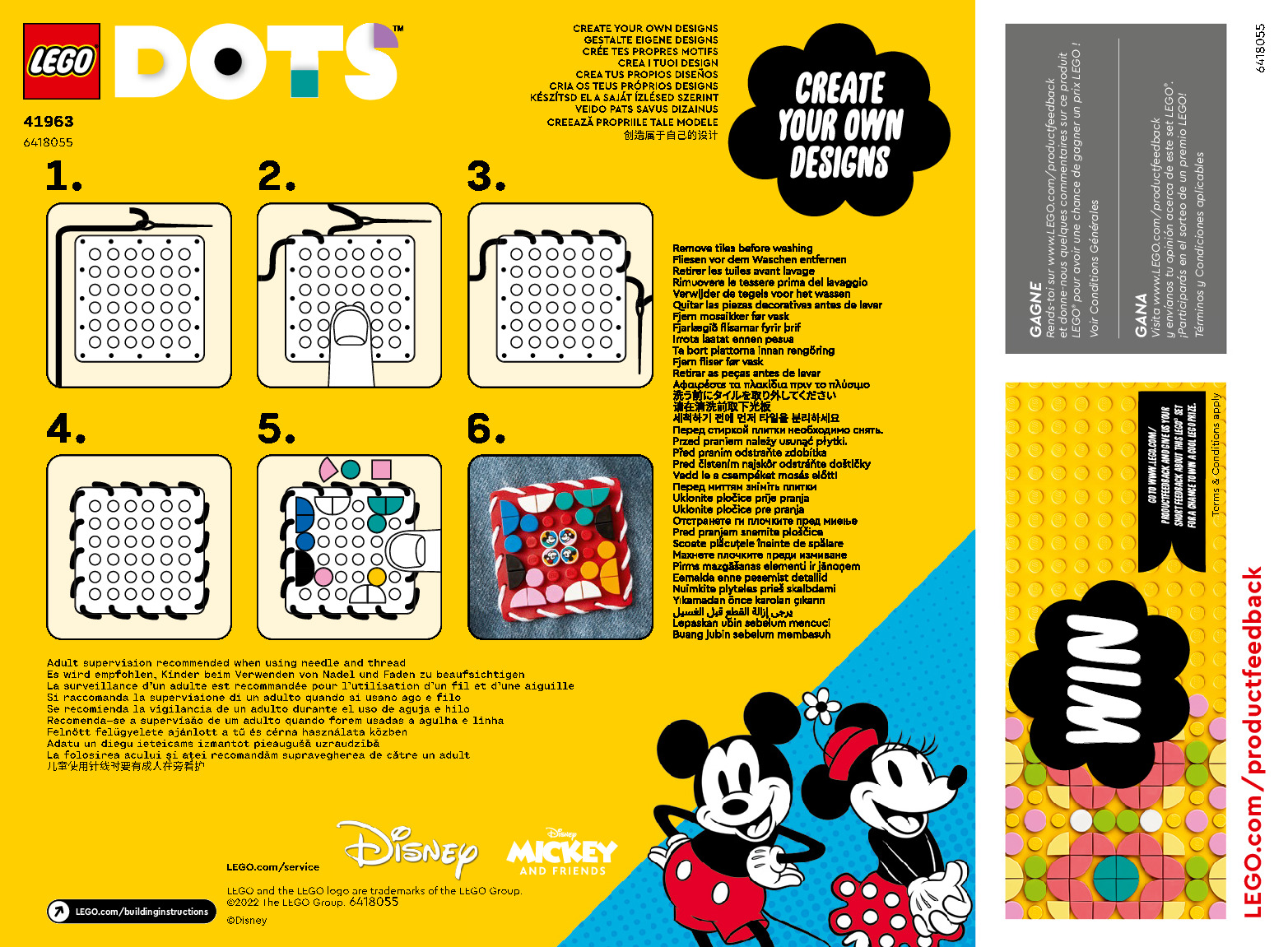 On this page you can find the original construction manual for the LEGO 41963 set. With the assembly manual you can easily learn how to build the 41963 Mickey Mouse & Minnie Mouse Stitch-on Patch step by step. The set was released in 2022.