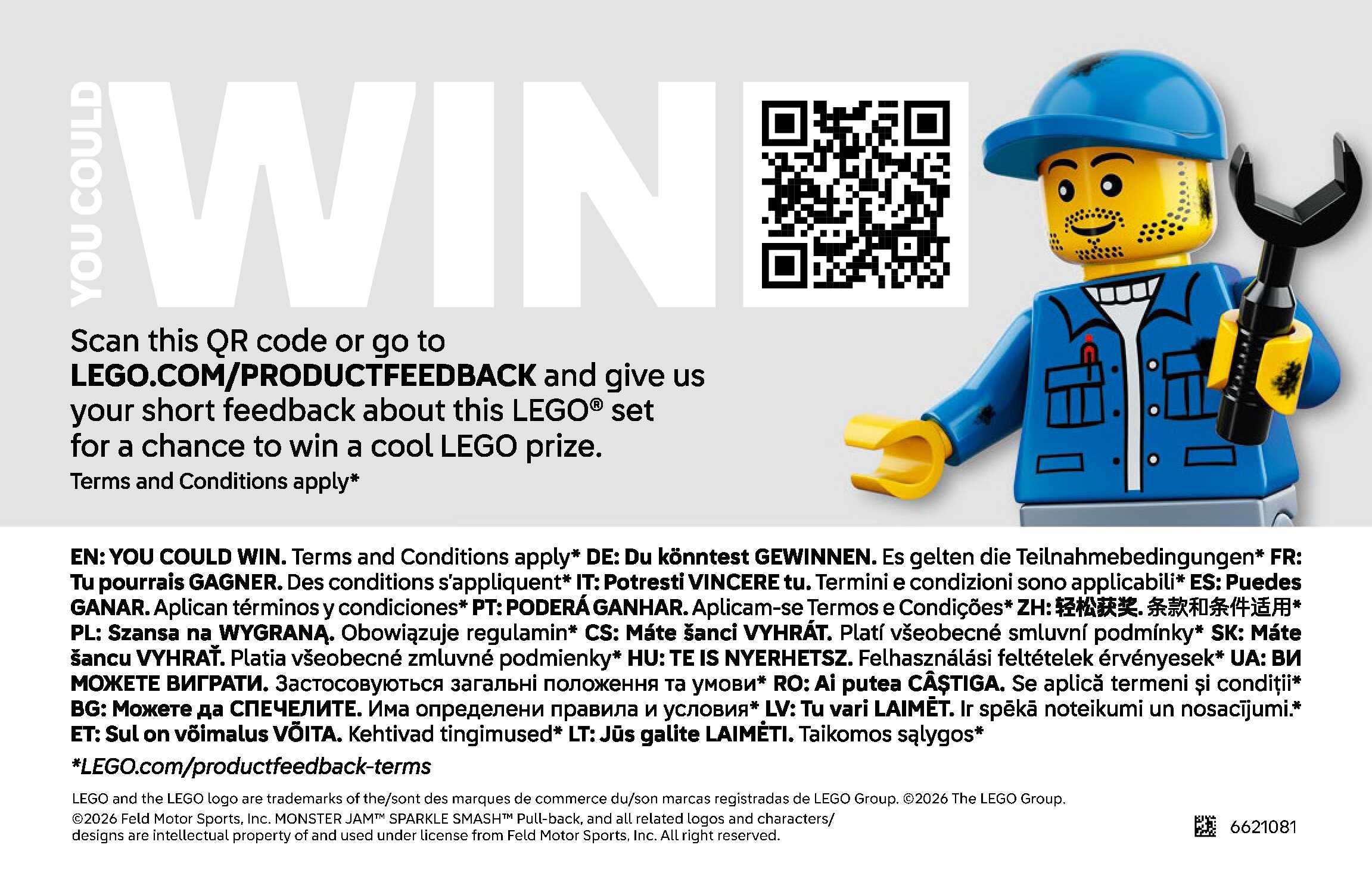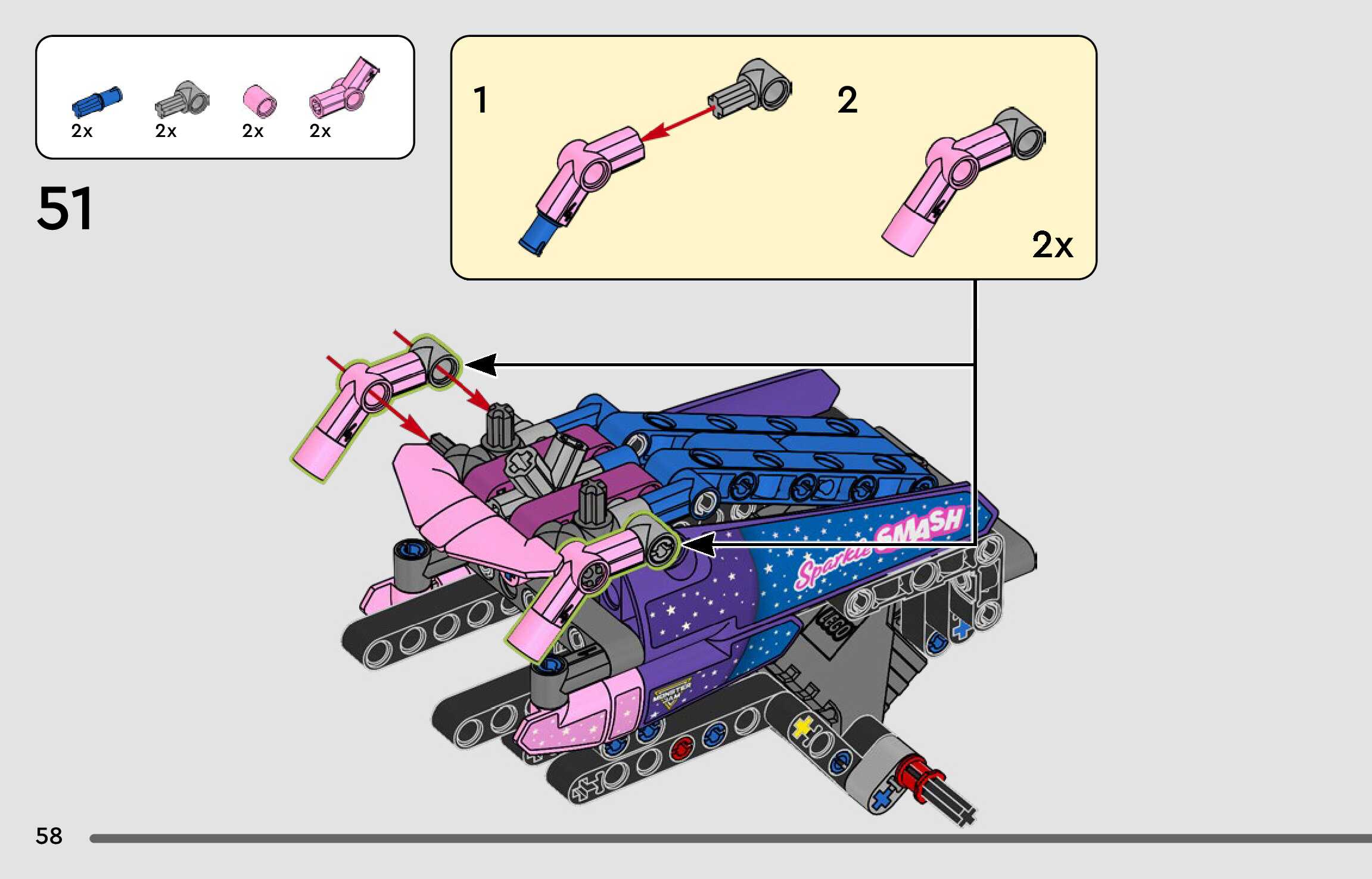 On this page you can find the original construction manual for the LEGO 42220 set. With the assembly manual you can easily learn how to build the Monster Jam™ Sparkle Smash™ Pull-Back step by step. The set was released in 2026.