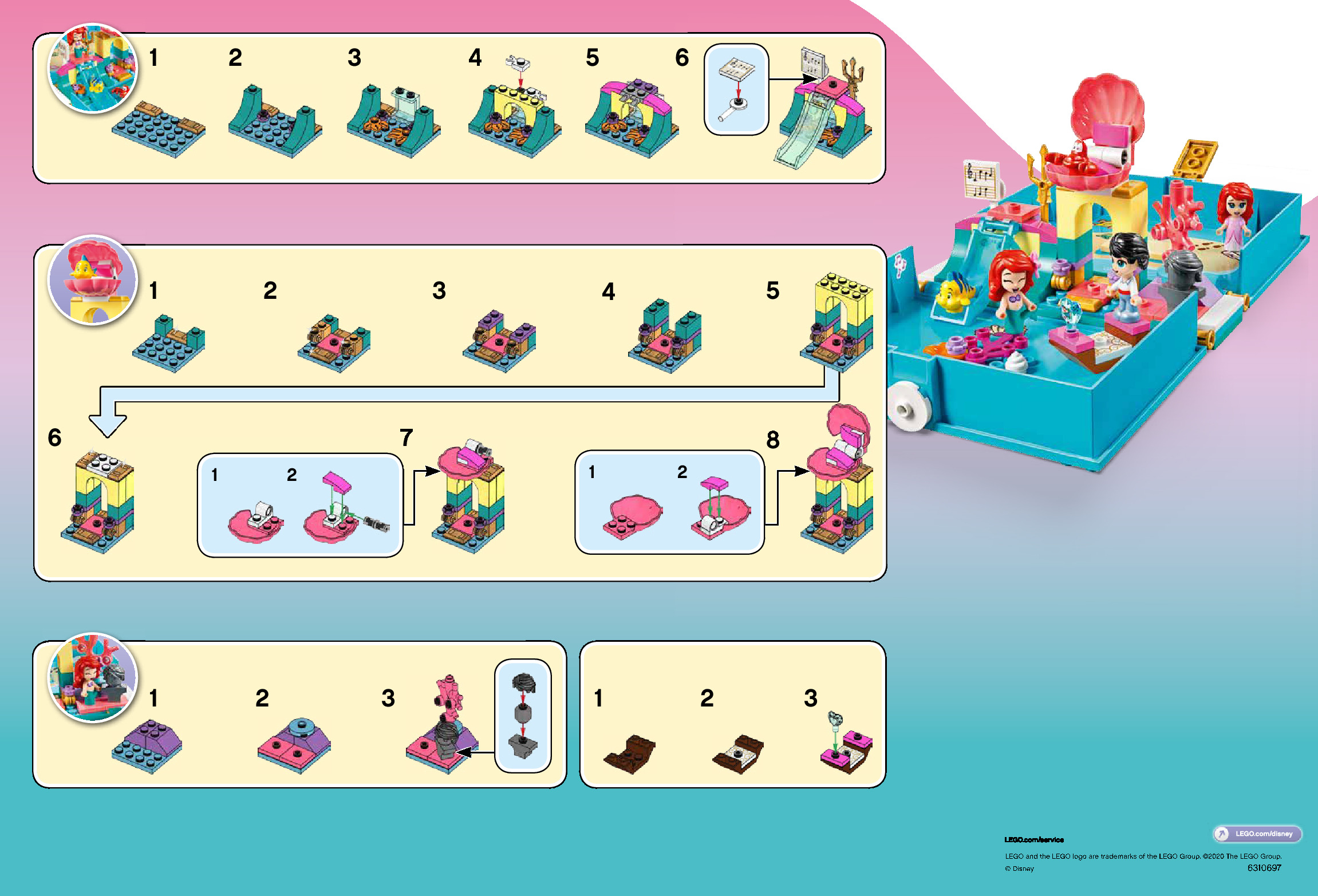This page shares information about LEGO 43176 Ariel’s Storybook Adventures manual, LEGO 43176 PDF instructions, LEGO 43176 Ariel’s Storybook Adventures building guide online, How to build 43176 Ariel’s Storybook Adventures LEGO.