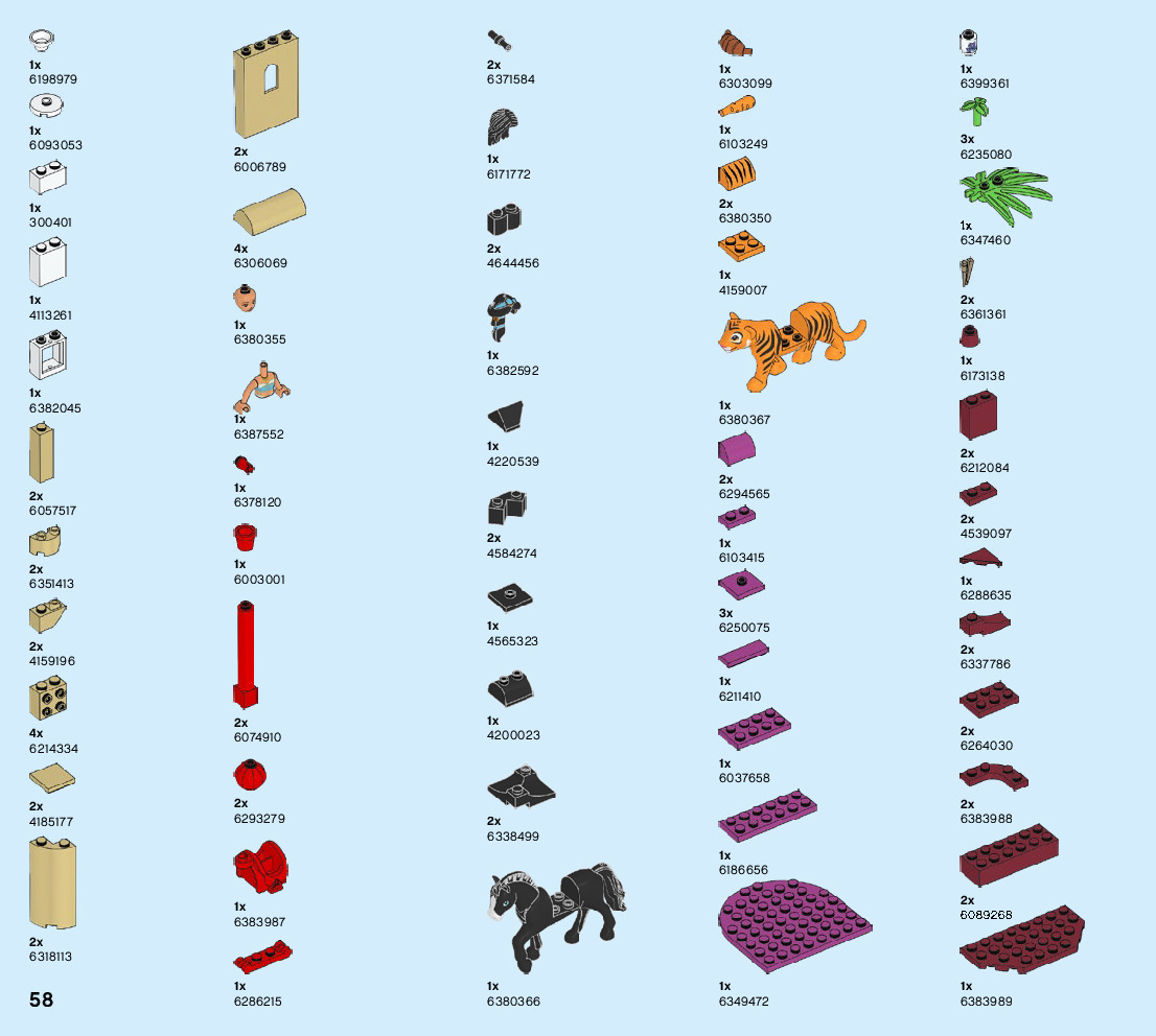 This page shares information about LEGO 43208 Jasmine and Mulan’s Adventure manual, LEGO 43208 PDF instructions, LEGO 43208 Jasmine and Mulan’s Adventure building guide online, How to build 43208 Jasmine and Mulan’s Adventure LEGO.