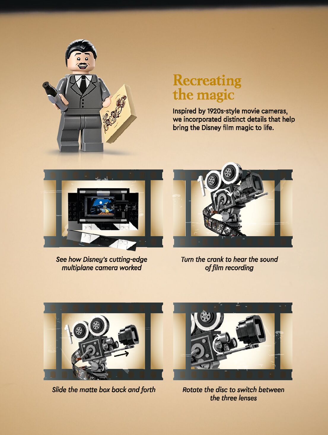 On this page you can find the original construction manual for the LEGO 43230 set. With the assembly manual you can easily learn how to build the 43230 Walt Disney Tribute Camera step by step. The set was released in 2023.