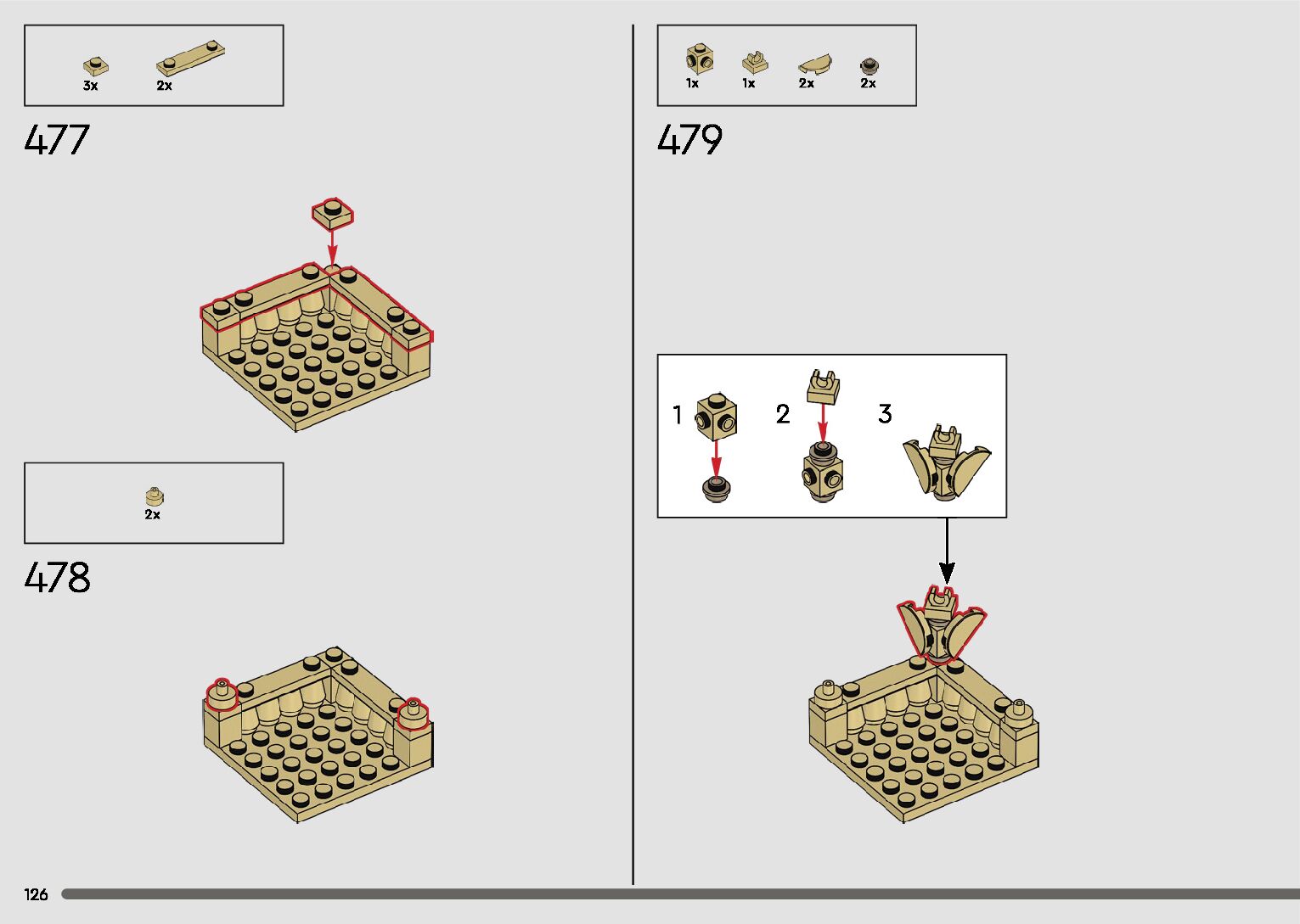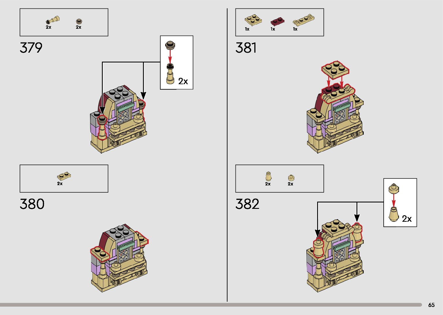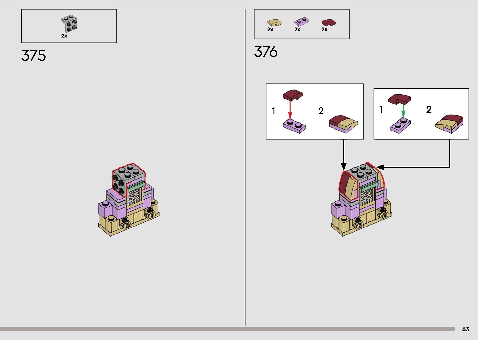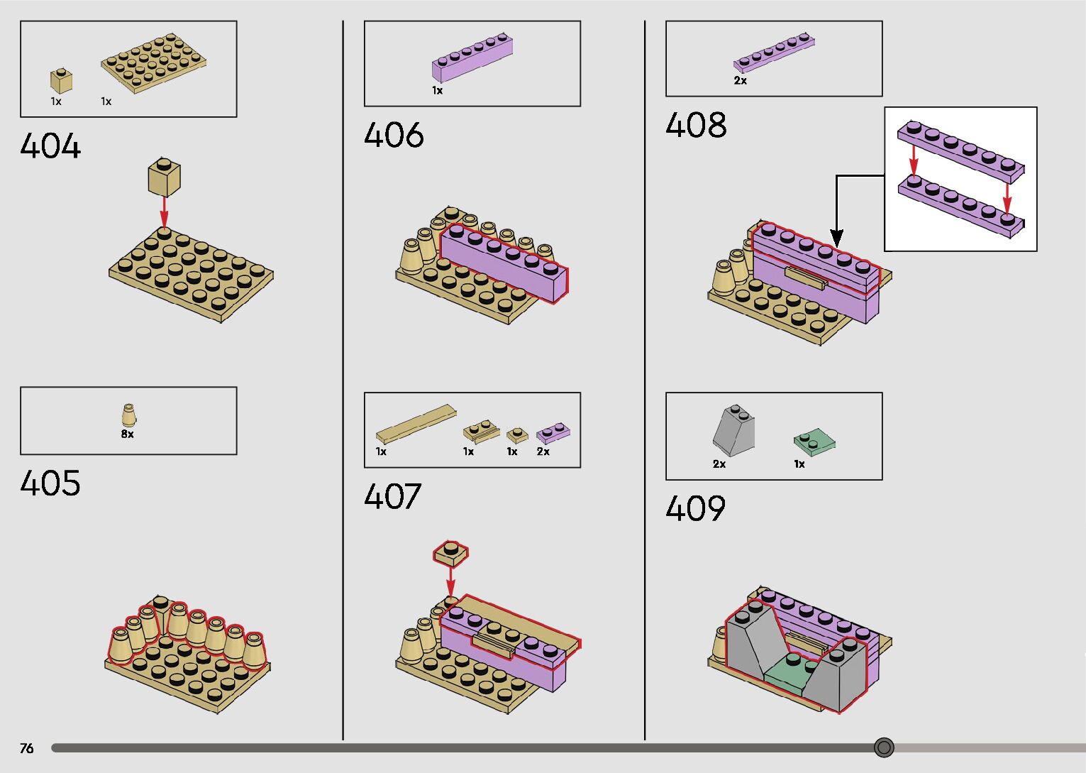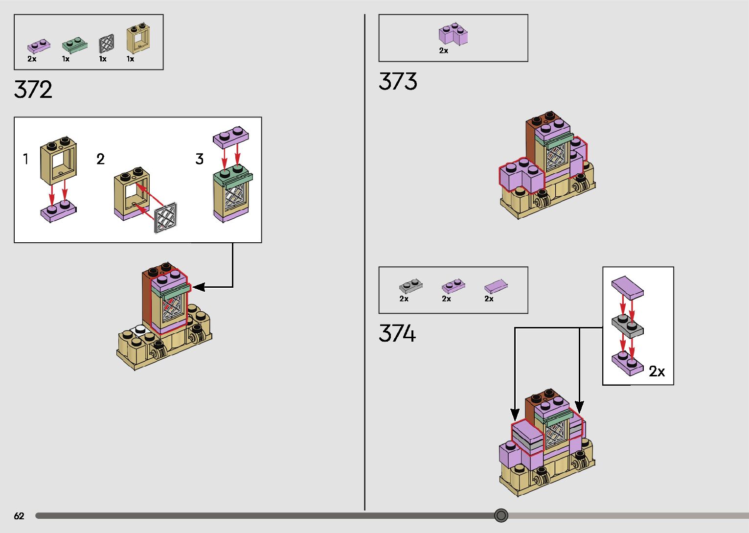 The assembly guide is prepared in a very understandable way for children and adult LEGO enthusiasts. A total of 384 picture galleries are shown, explaining the step-by-step construction stages for 2 different structures.