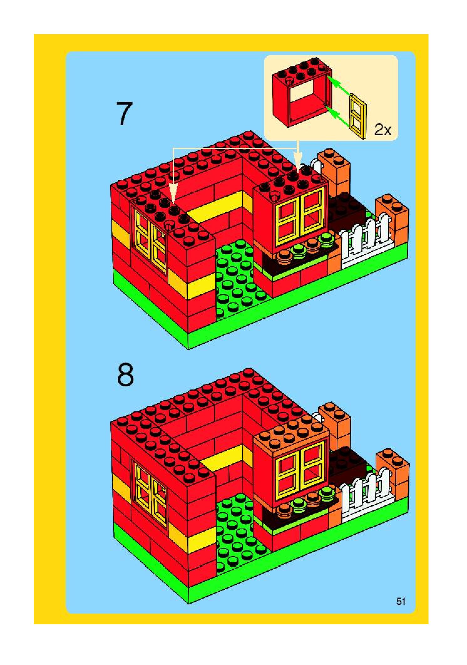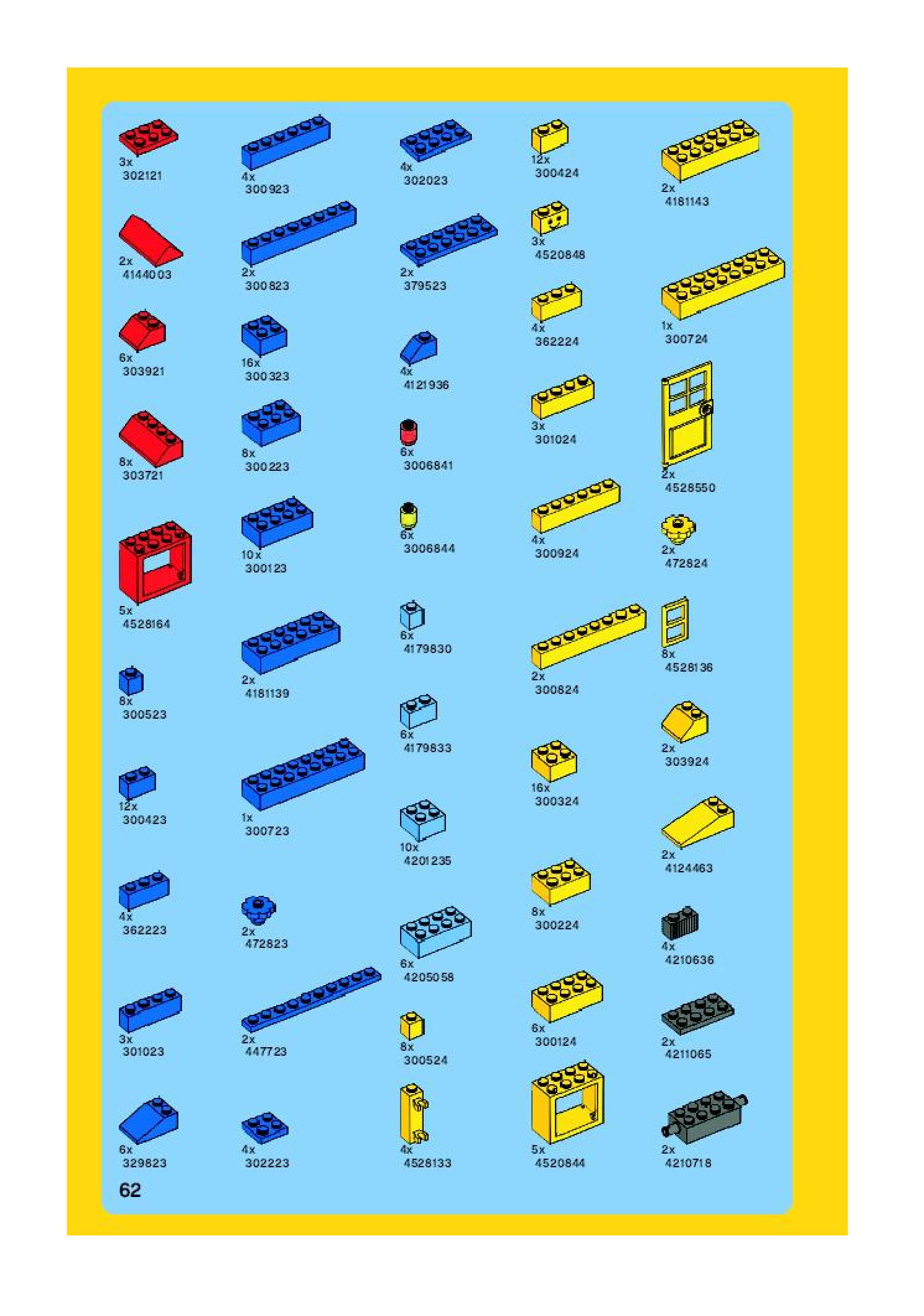 The assembly guide is prepared in a very understandable way for children and adult LEGO enthusiasts. A total of 64 picture galleries are shown, explaining the step-by-step construction stages for 1 different structures.