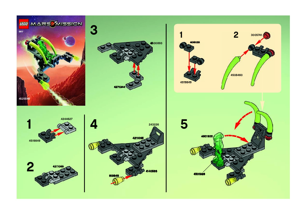 This page shares information about LEGO 5617 Alien Jet manual, LEGO 5617 PDF instructions, LEGO 5617 Alien Jet building guide online, How to build 5617 Alien Jet LEGO.