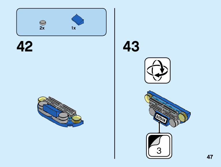 The assembly guide is prepared in a very understandable way for children and adult LEGO enthusiasts. A total of 108 picture galleries are shown, explaining the step-by-step construction stages for 2 different structures.