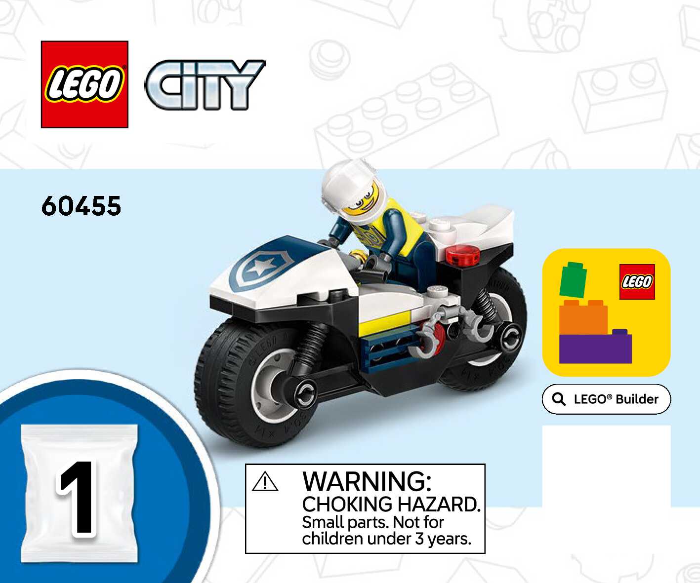 This page shares information about LEGO Police Motorcycle chase manual, LEGO 60455 PDF instructions, LEGO Police Motorcycle chase building guide online, How to build Police Motorcycle chase LEGO.