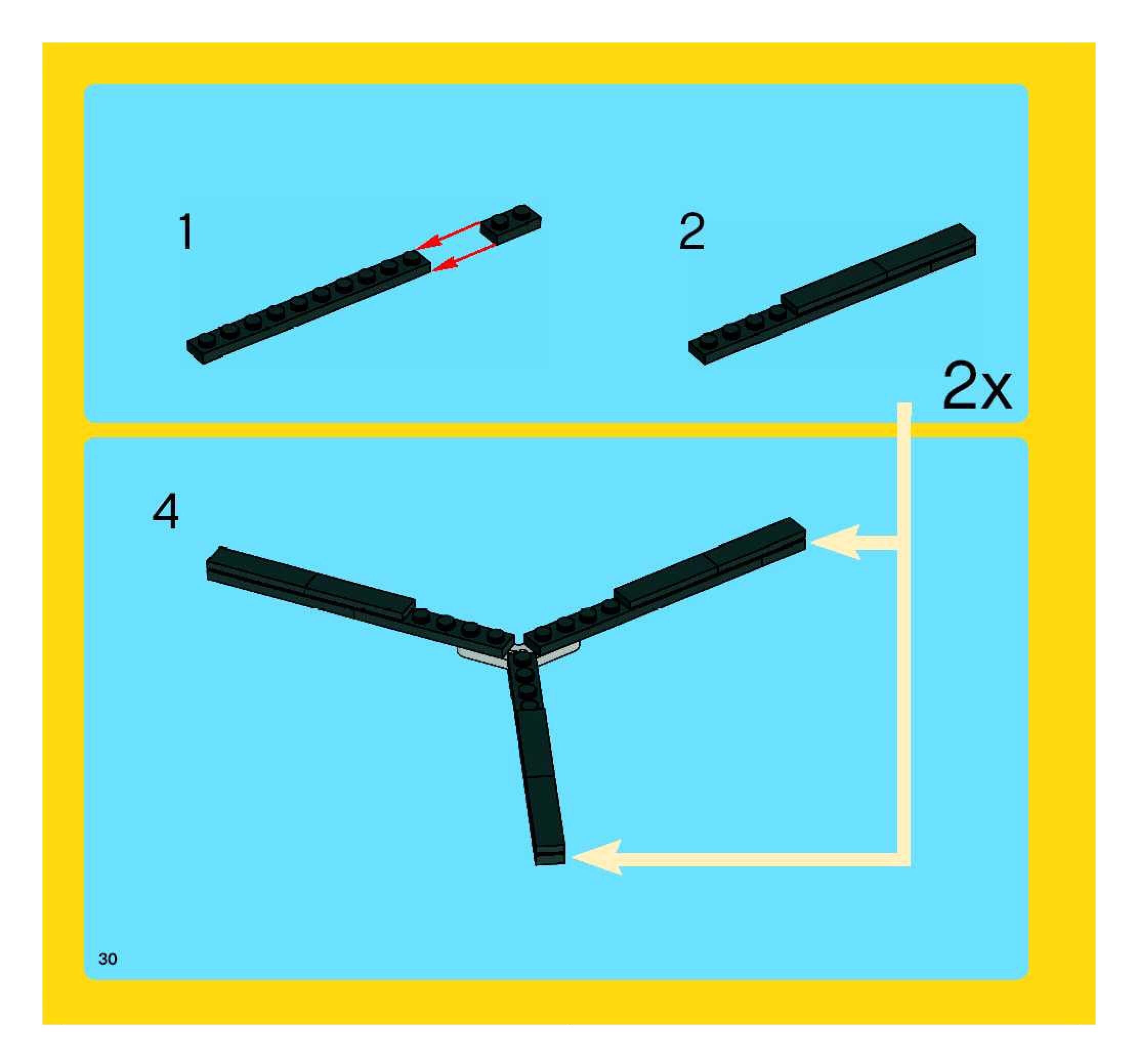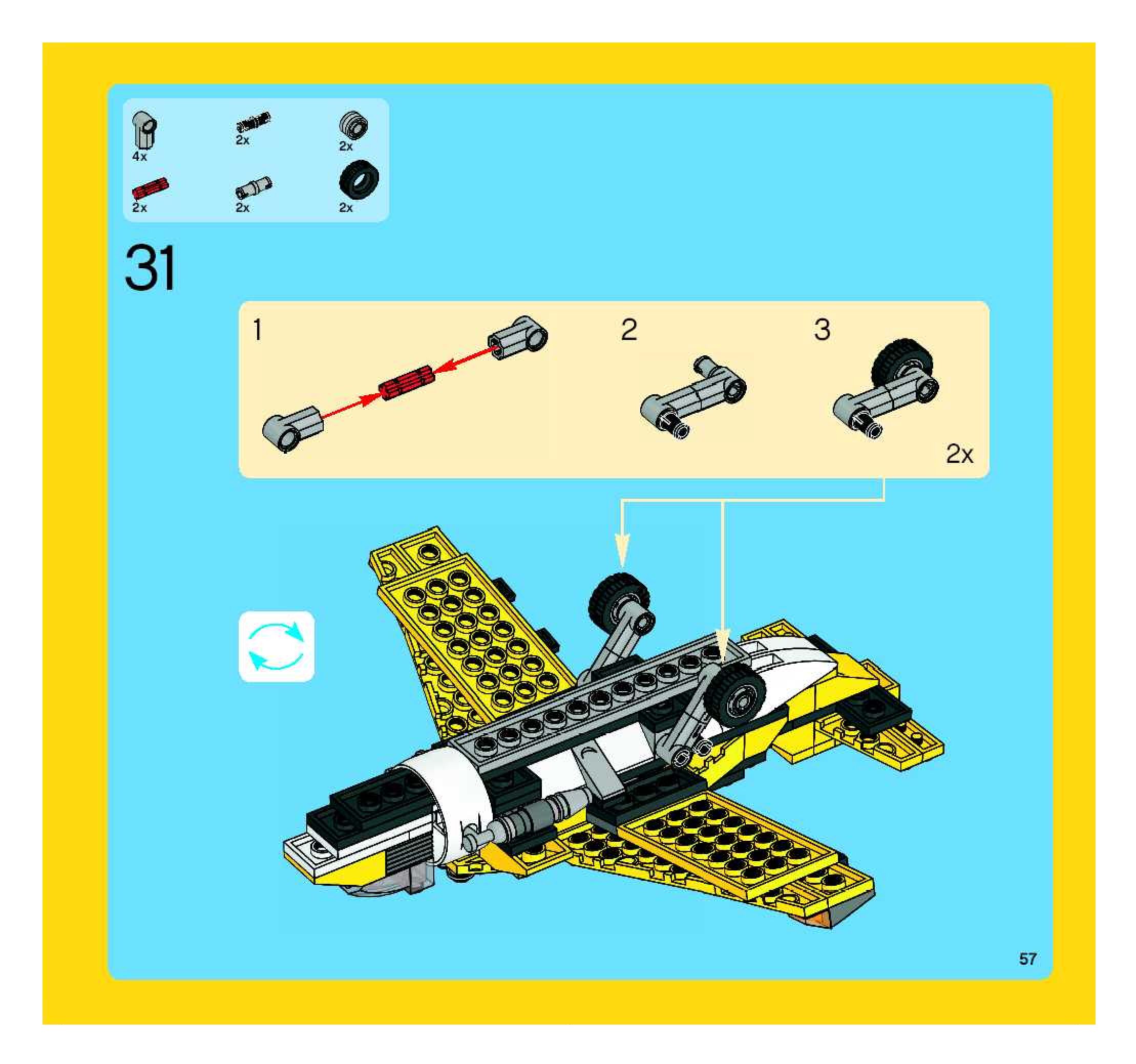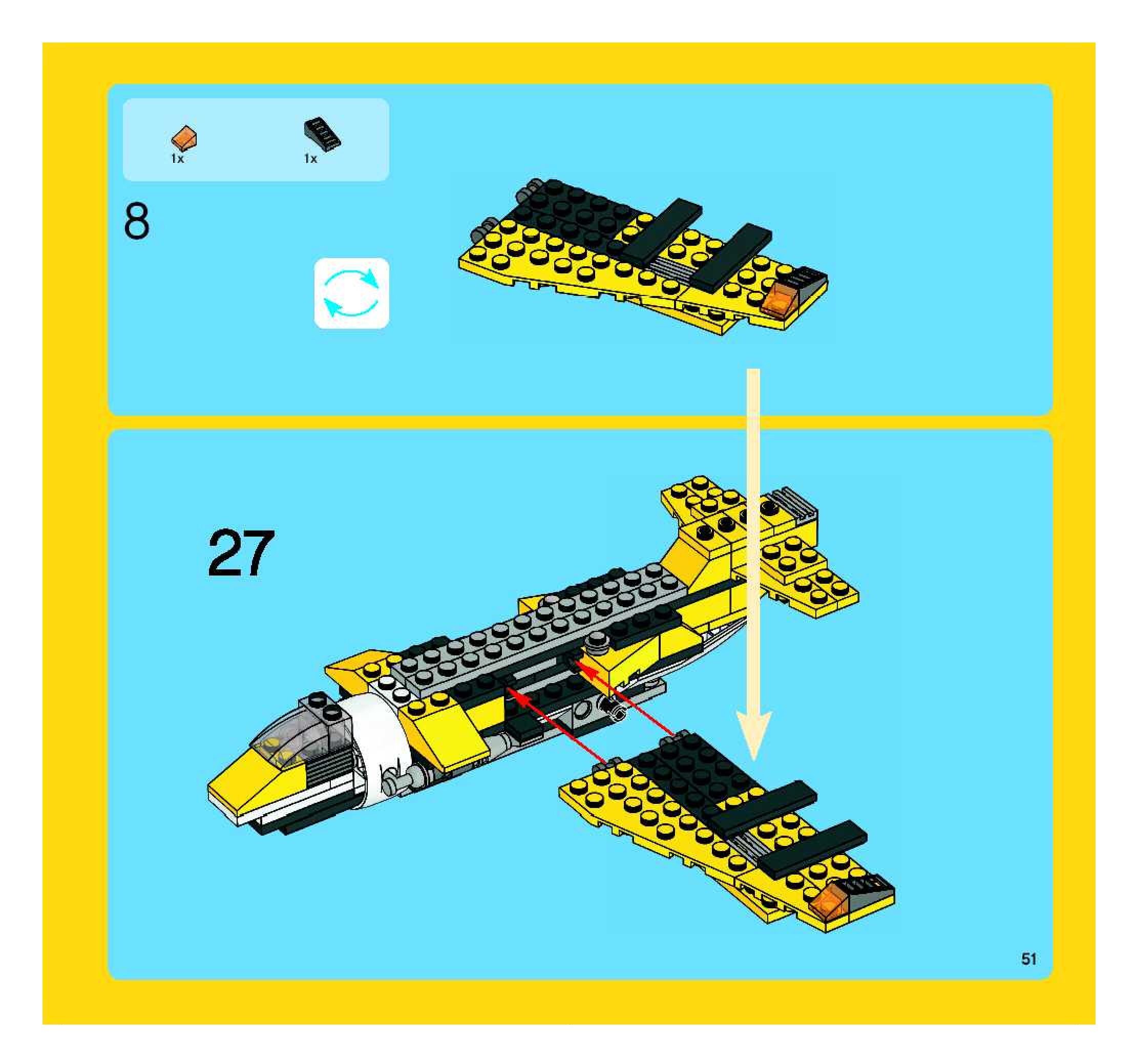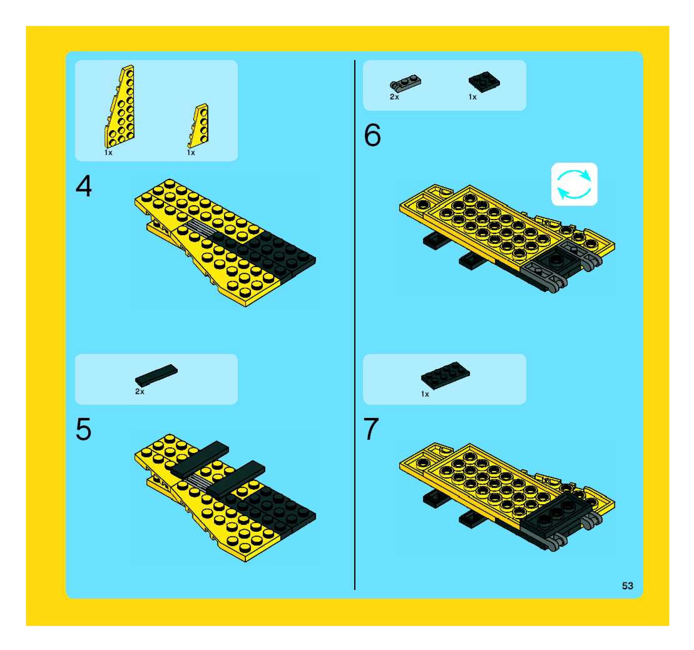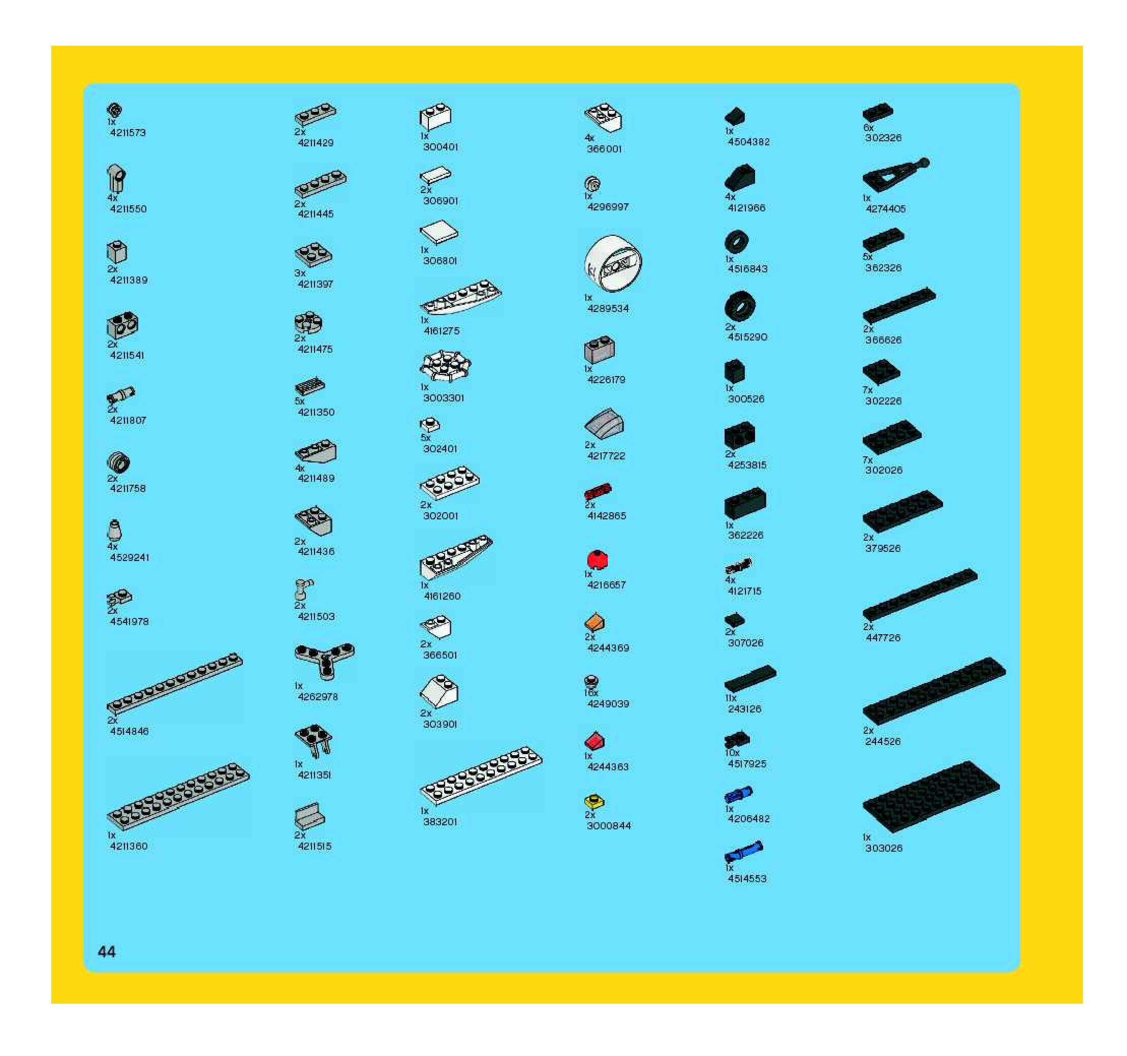The assembly guide is prepared in a very understandable way for children and adult LEGO enthusiasts. A total of 108 picture galleries are shown, explaining the step-by-step construction stages for 2 different structures.