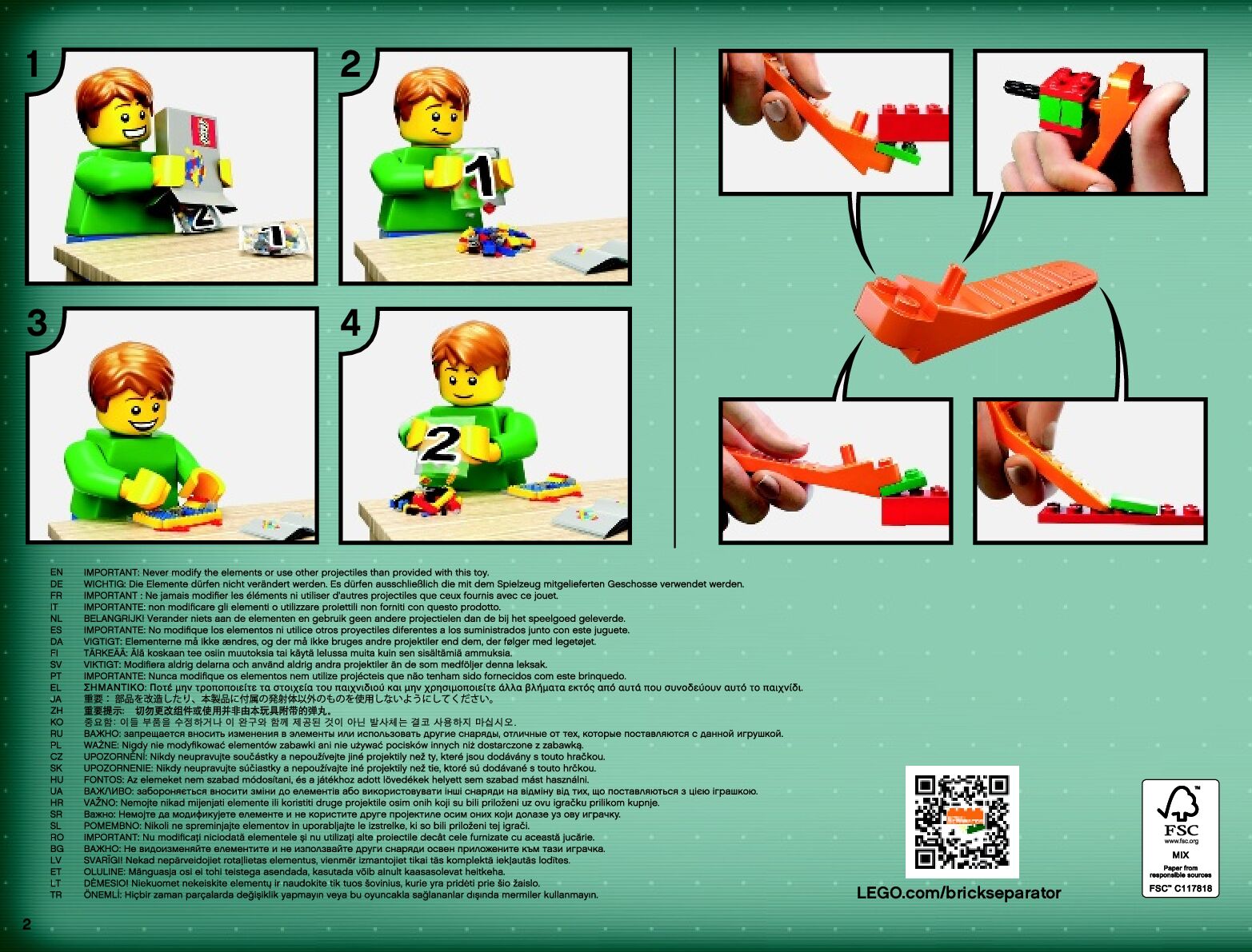 The assembly guide is prepared in a very understandable way for children and adult LEGO enthusiasts. A total of 370 picture galleries are shown, explaining the step-by-step construction stages for 2 different structures.