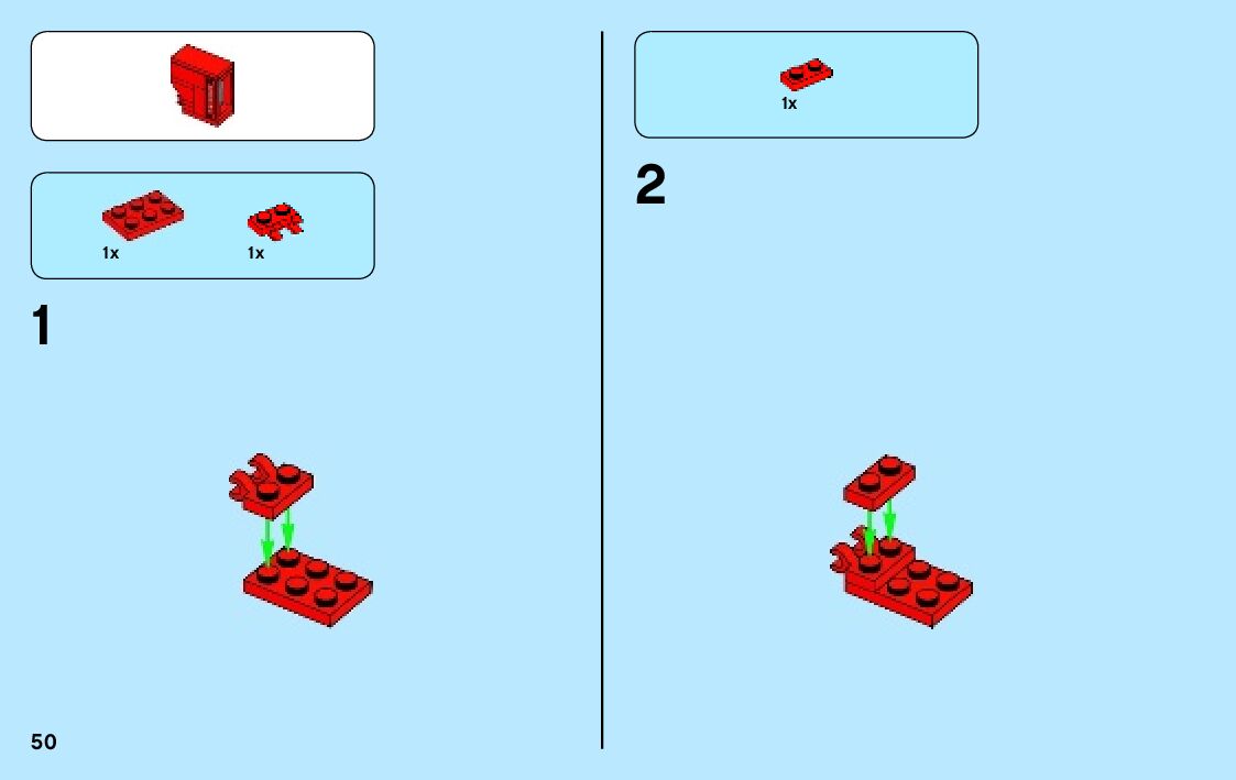 The assembly guide is prepared in a very understandable way for children and adult LEGO enthusiasts. A total of 125 picture galleries are shown, explaining the step-by-step construction stages for 2 different structures.
