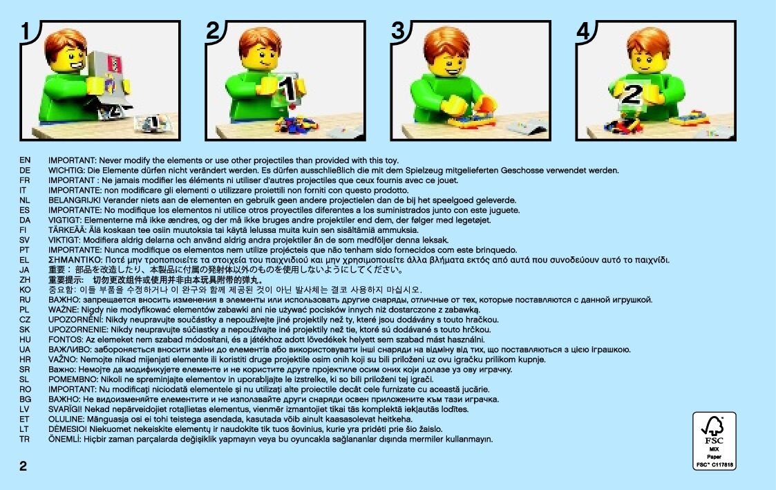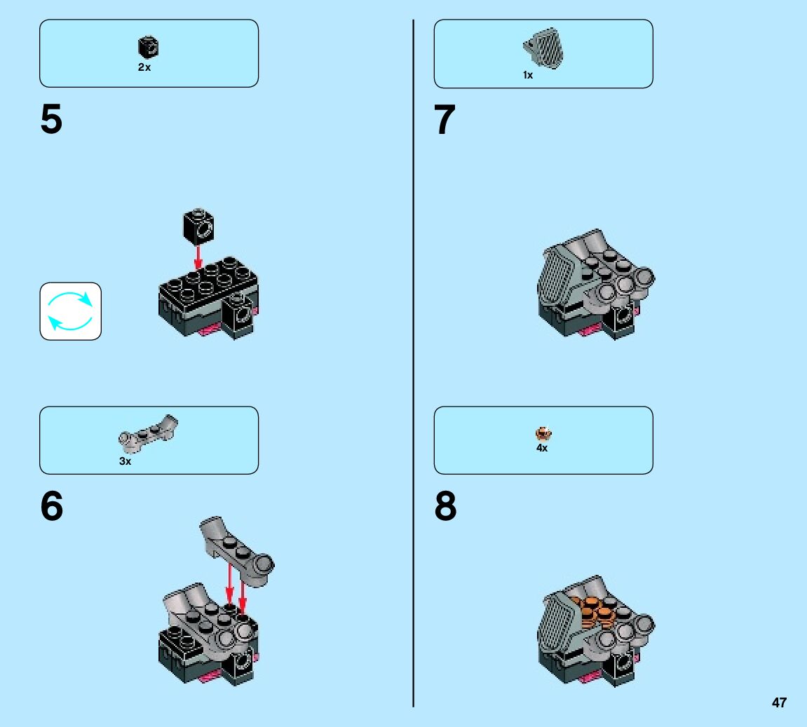 The assembly guide is prepared in a very understandable way for children and adult LEGO enthusiasts. A total of 88 picture galleries are shown, explaining the step-by-step construction stages for 2 different structures.
