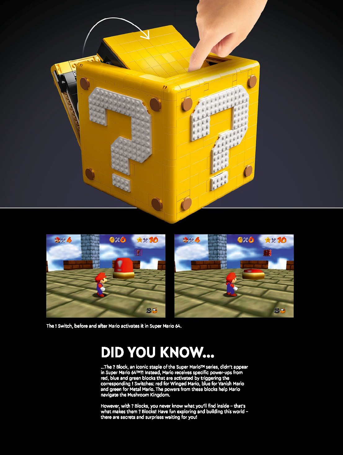 This page shares information about LEGO 71395 Super Mario 64 Question Mark Block manual, LEGO 71395 PDF instructions, LEGO 71395 Super Mario 64 Question Mark Block building guide online, How to build 71395 Super Mario 64 Question Mark Block LEGO.