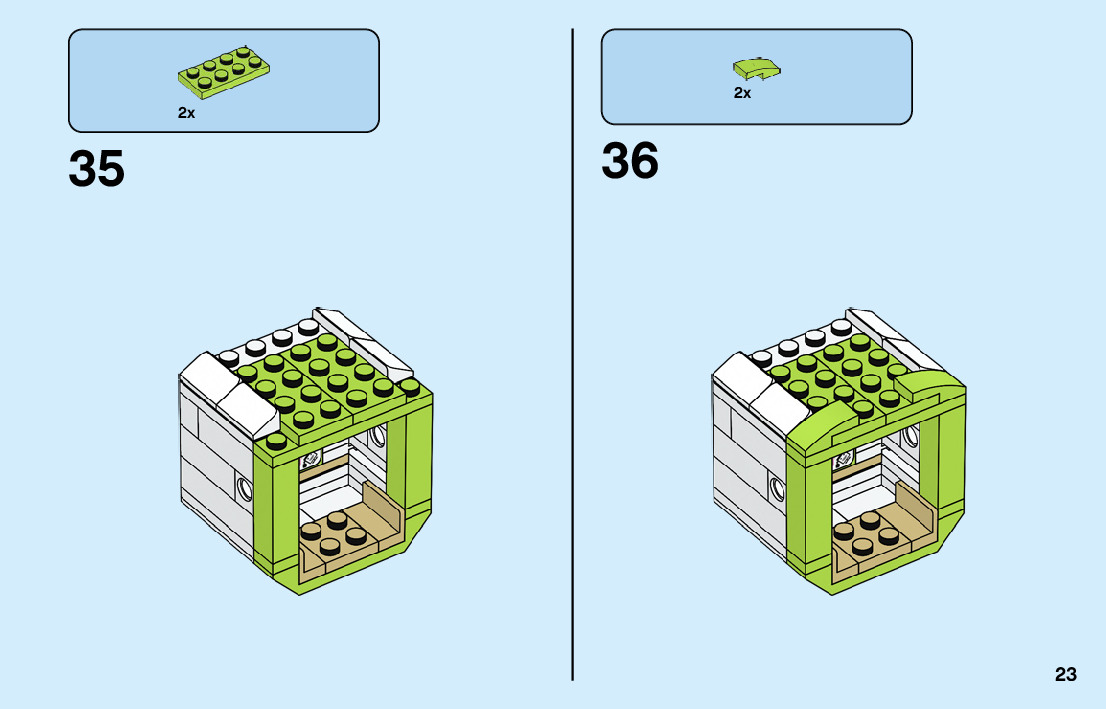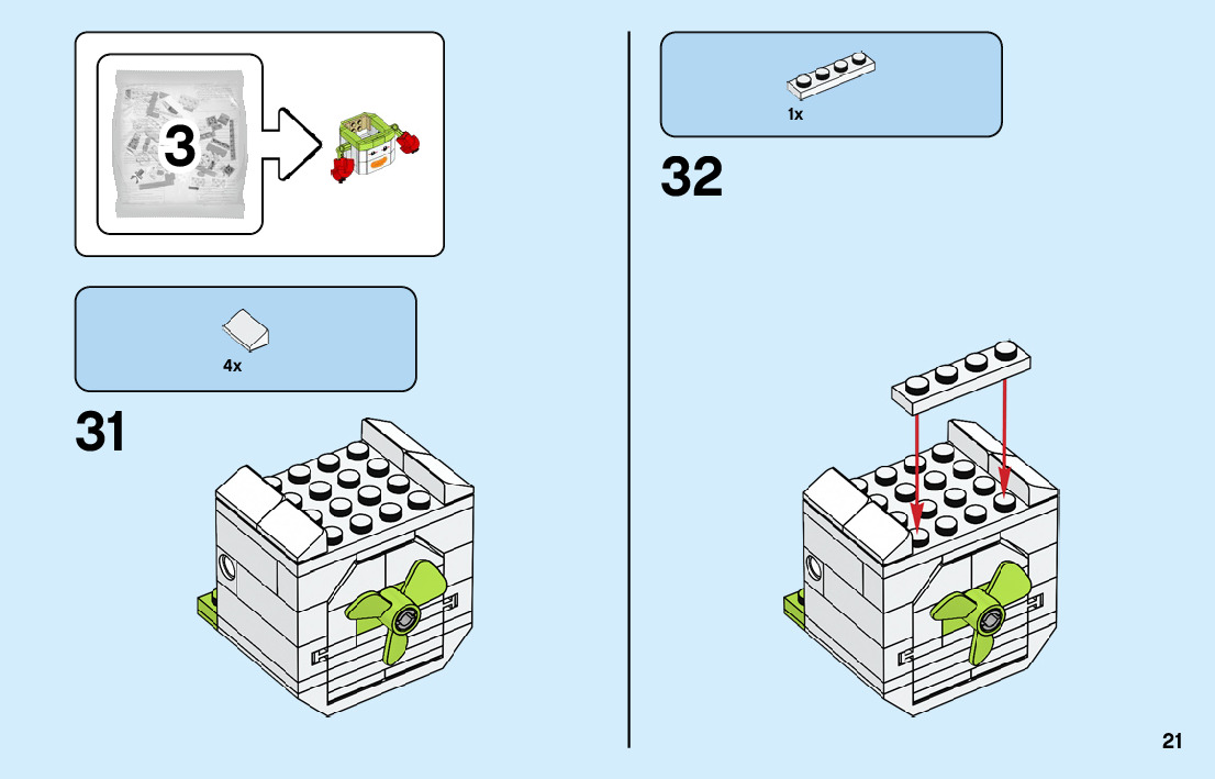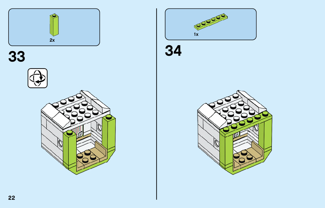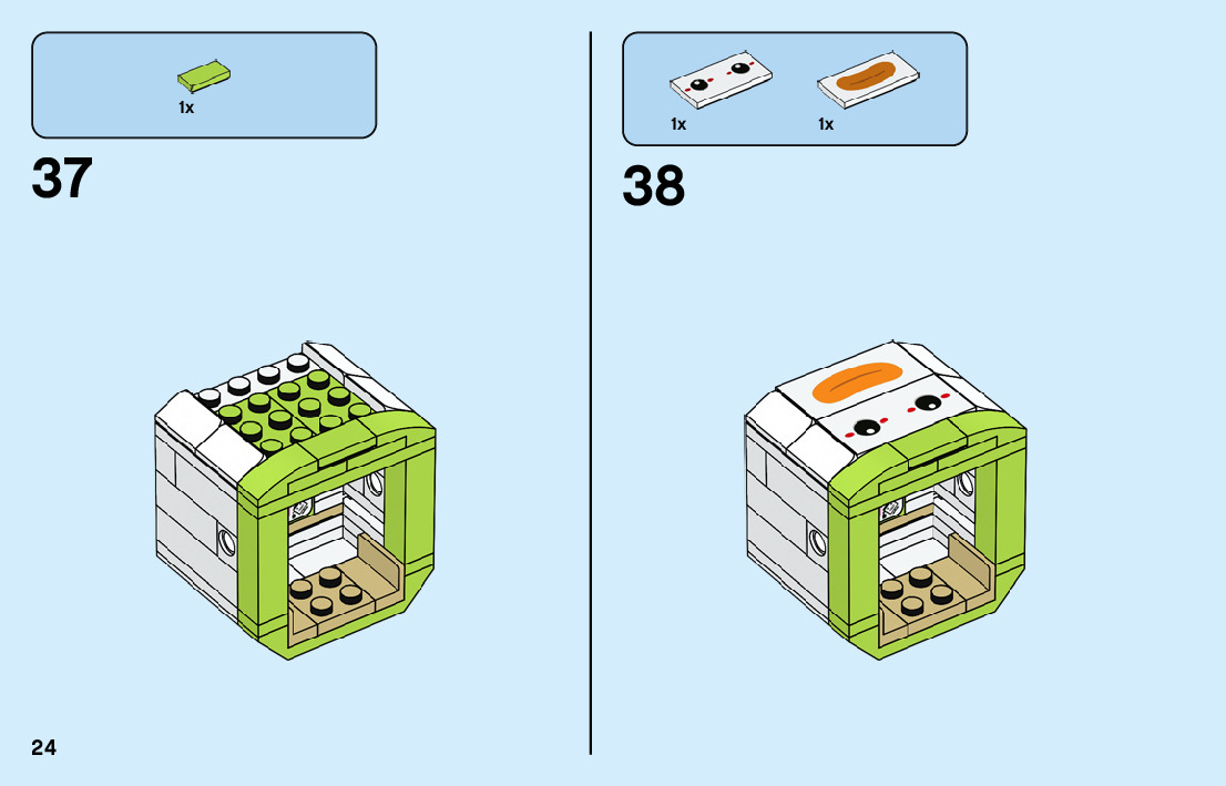 The assembly guide is prepared in a very understandable way for children and adult LEGO enthusiasts. A total of 38 picture galleries are shown, explaining the step-by-step construction stages for 2 different structures.