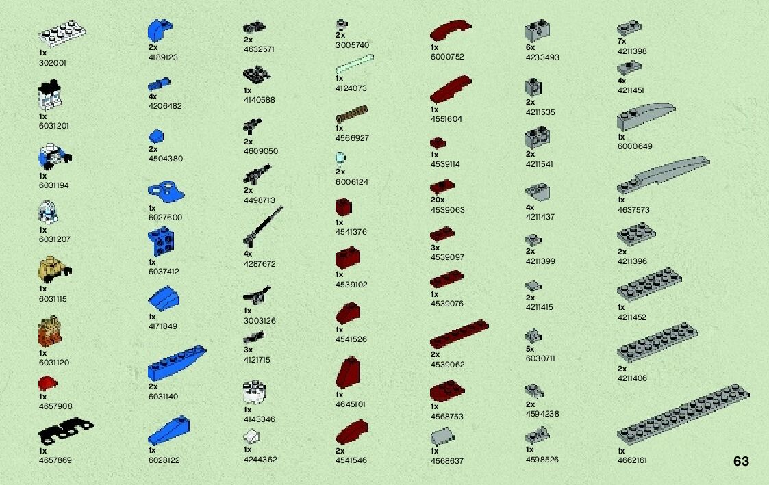 The assembly guide is prepared in a very understandable way for children and adult LEGO enthusiasts. A total of 68 picture galleries are shown, explaining the step-by-step construction stages for 1 different structures.